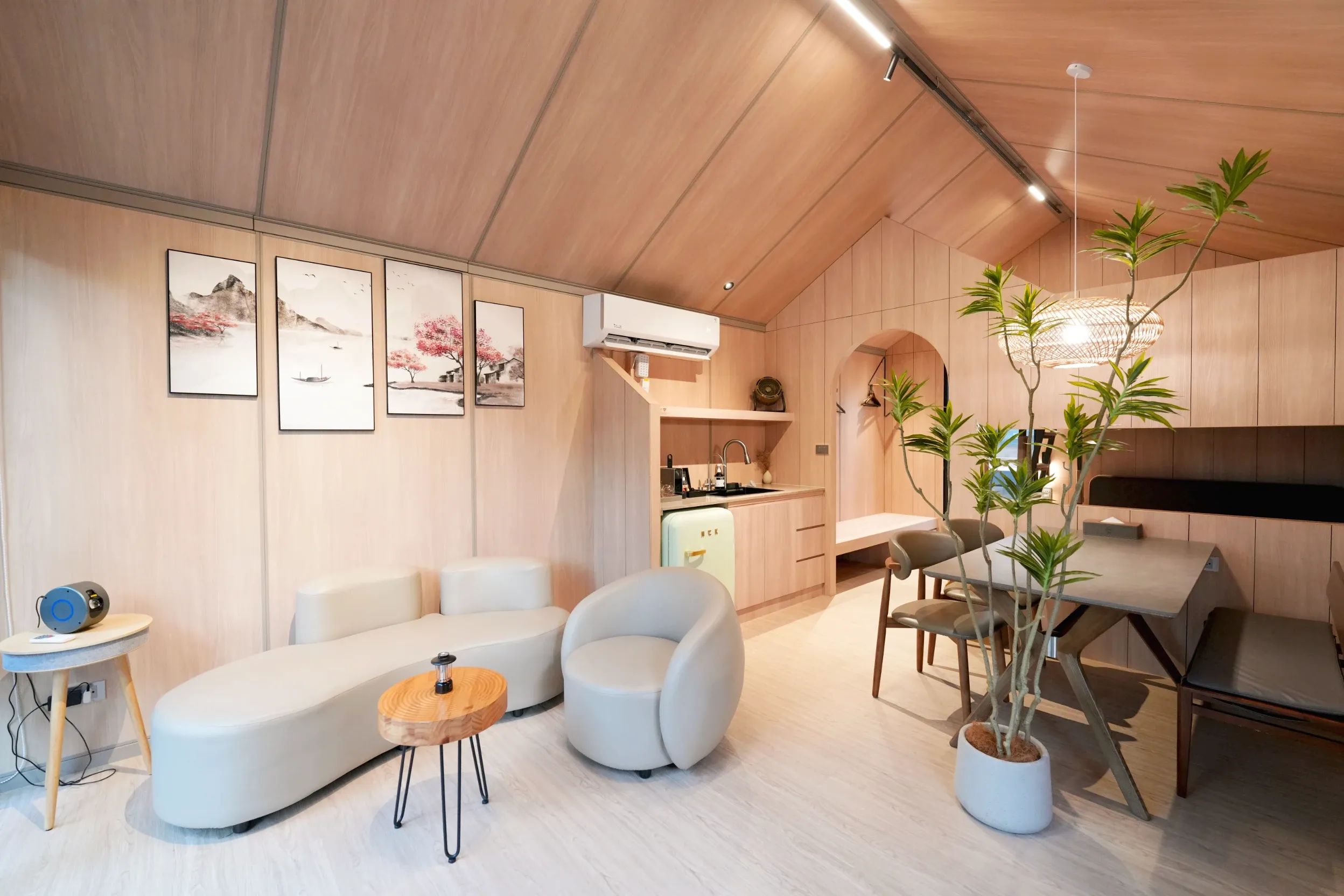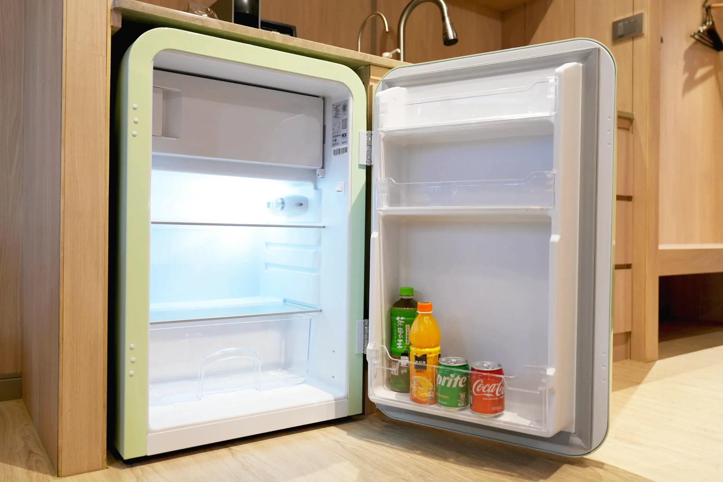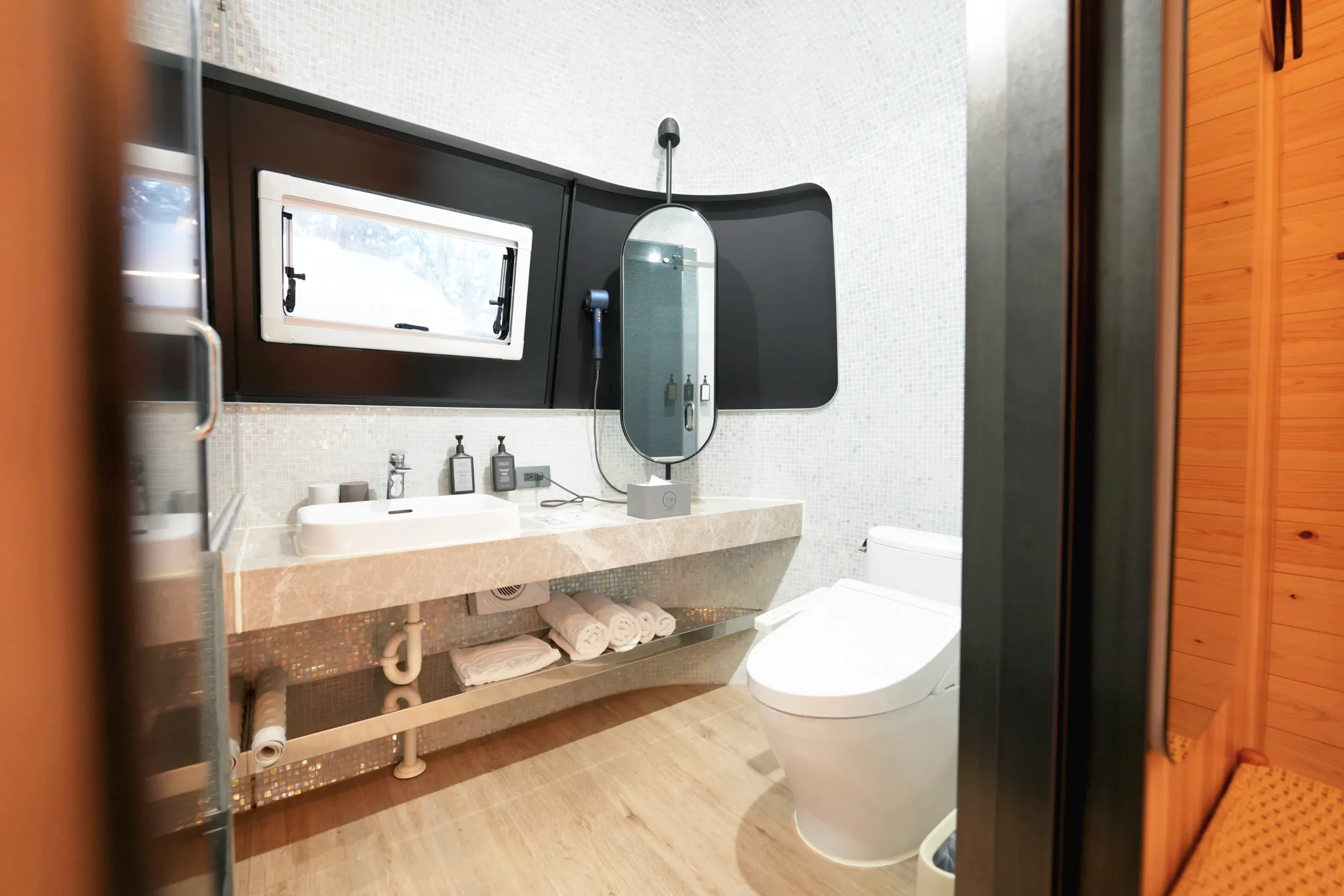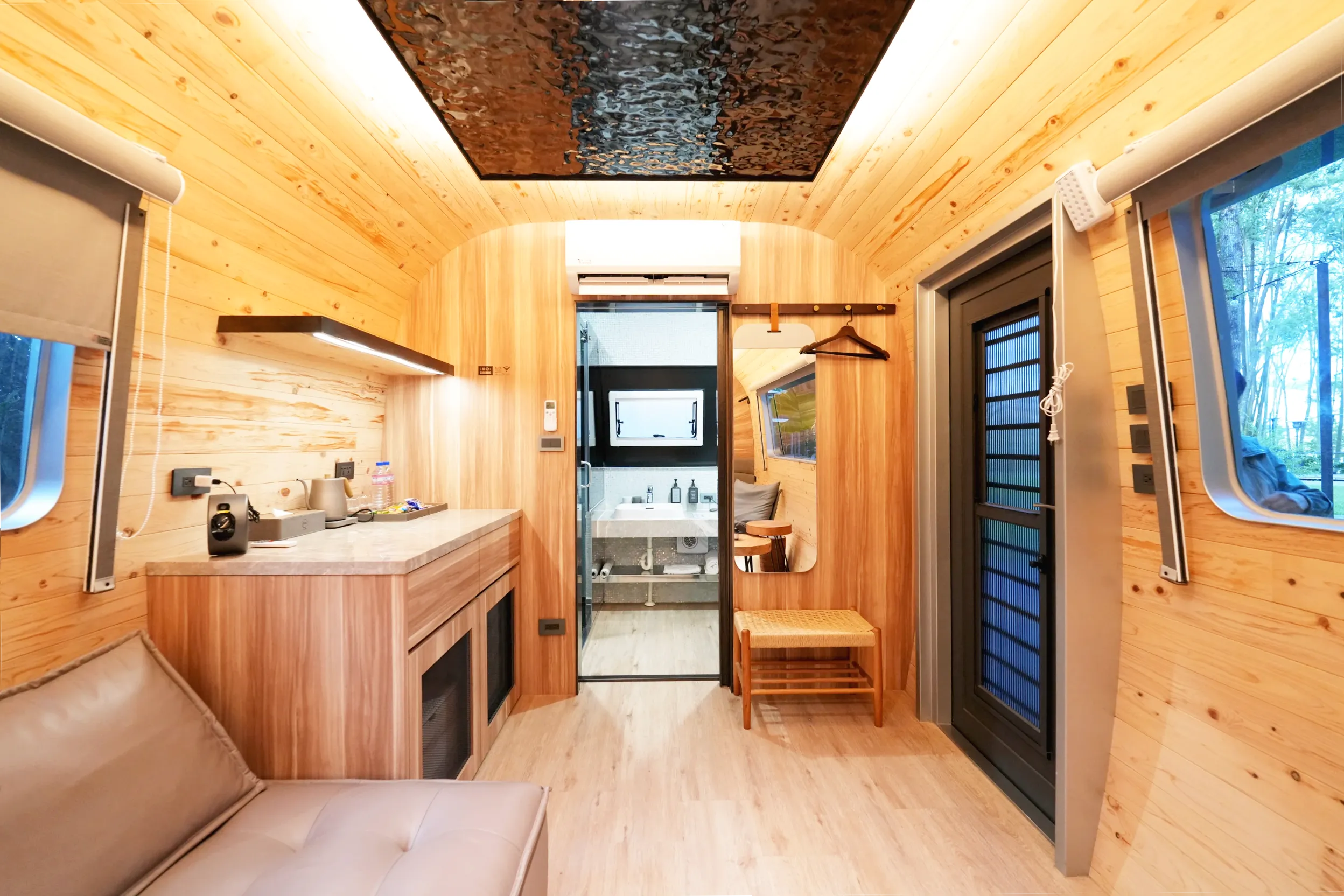 ▼車內也有一個擺放零食、飲料,可以泡咖啡的小吧檯,下方還有一個小冰箱,旁邊也有鏡子、衣架跟方便穿鞋子的小椅凳,整體來說麻雀雖小,五臟俱全!