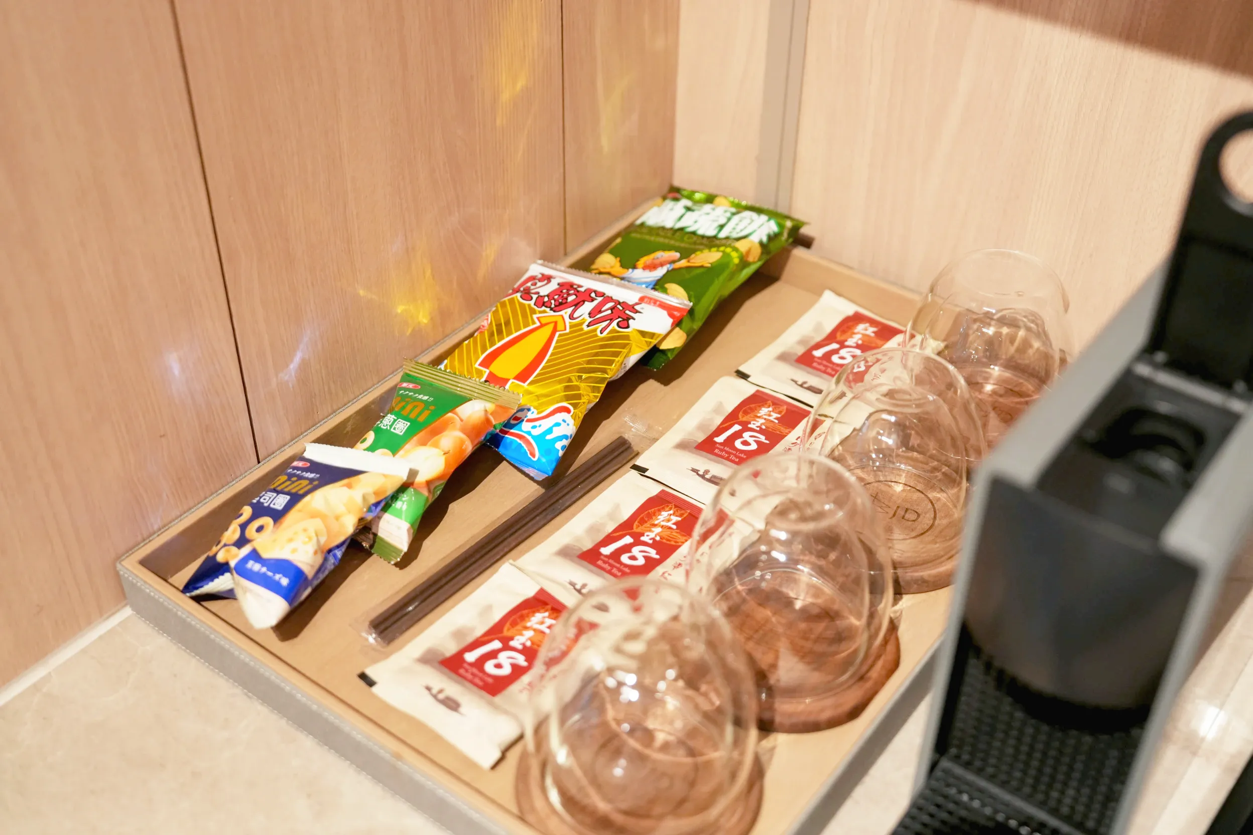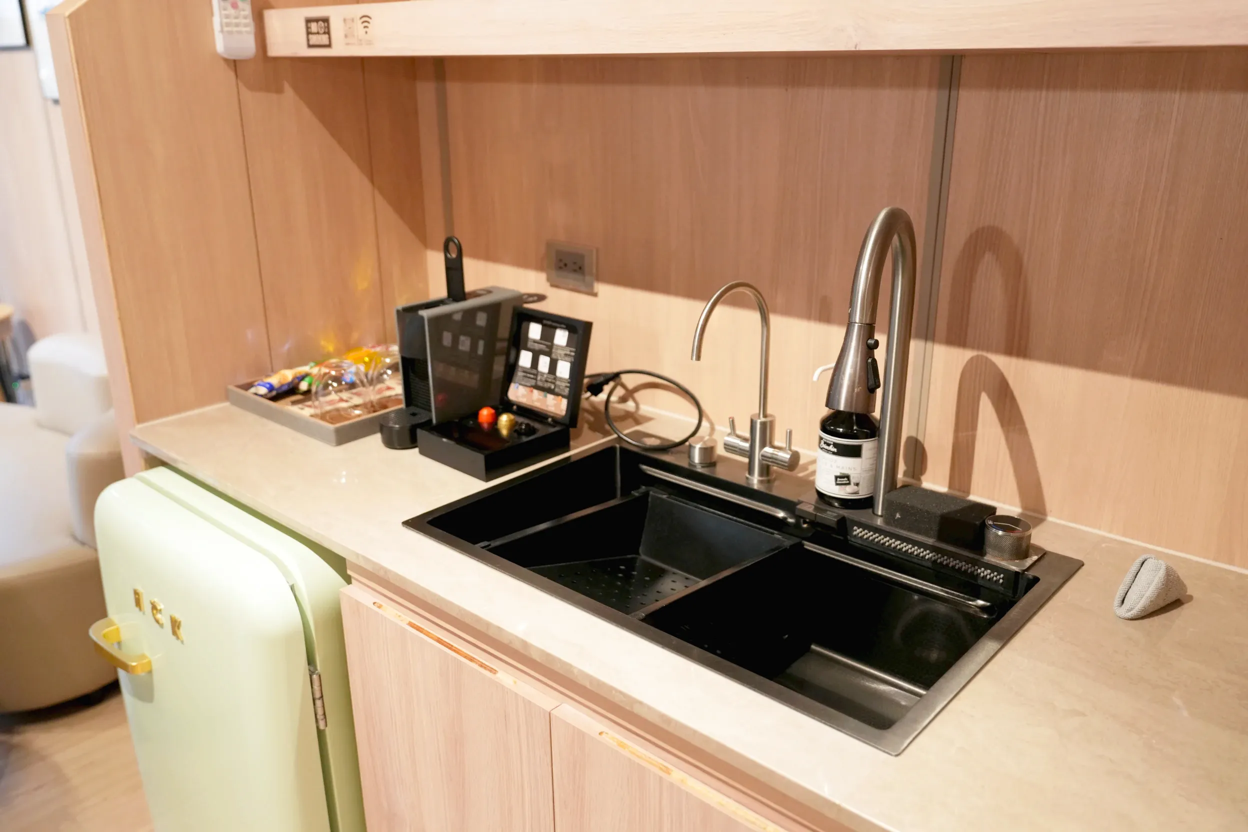 ▼在客廳區的旁邊還有一個洗手台、小冰箱和膠囊咖啡機,擺放著店家準備的零食飲料,這些都是可以免費享用的,雖然我們只有兩人入住,但是還是有給四人的份量,晚上想要聊天談心,也不用擔心餓肚子。