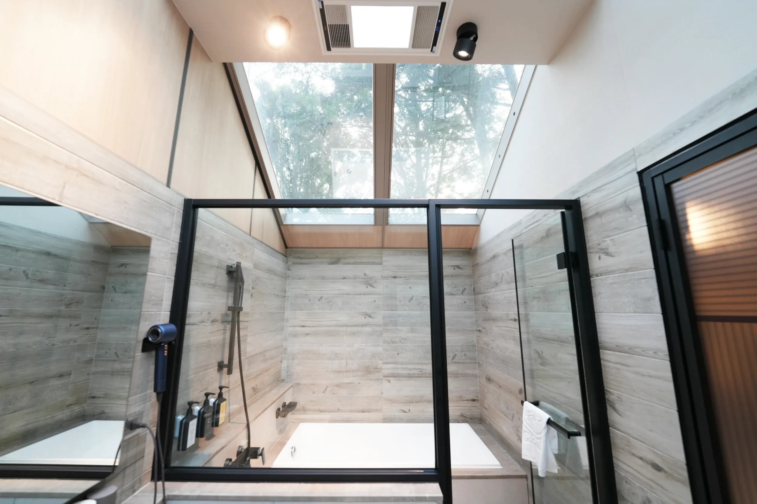 ▼浴室的部分是玻璃屋頂,採光很好,晚上還可以欣賞夜空,窗戶有窗簾可以拉上,管家也特別說會防止無人機,所以基本上是不用擔心被看光光啦XD