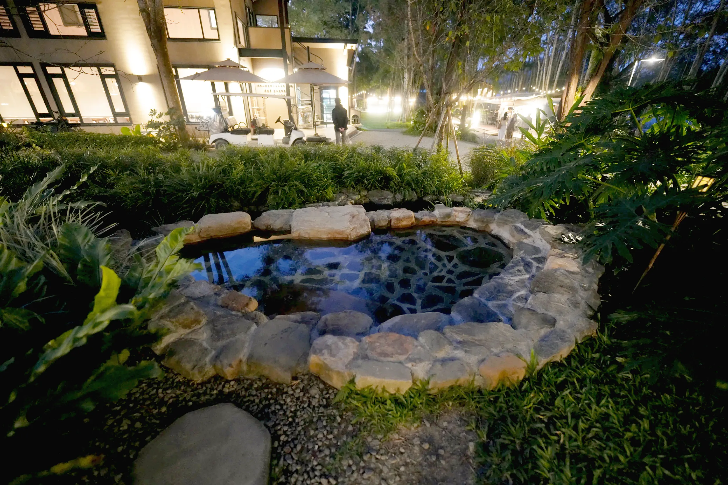 ▼花園別館的外面還有共用的露天浴池,早上會是冷泉,晚上會加溫變成溫泉,不過池子本身其實沒有很大,加上又在公共走道旁邊,小朋友玩玩水還可以,成人要泡的話,我自己覺得有點小害羞和尷尬~