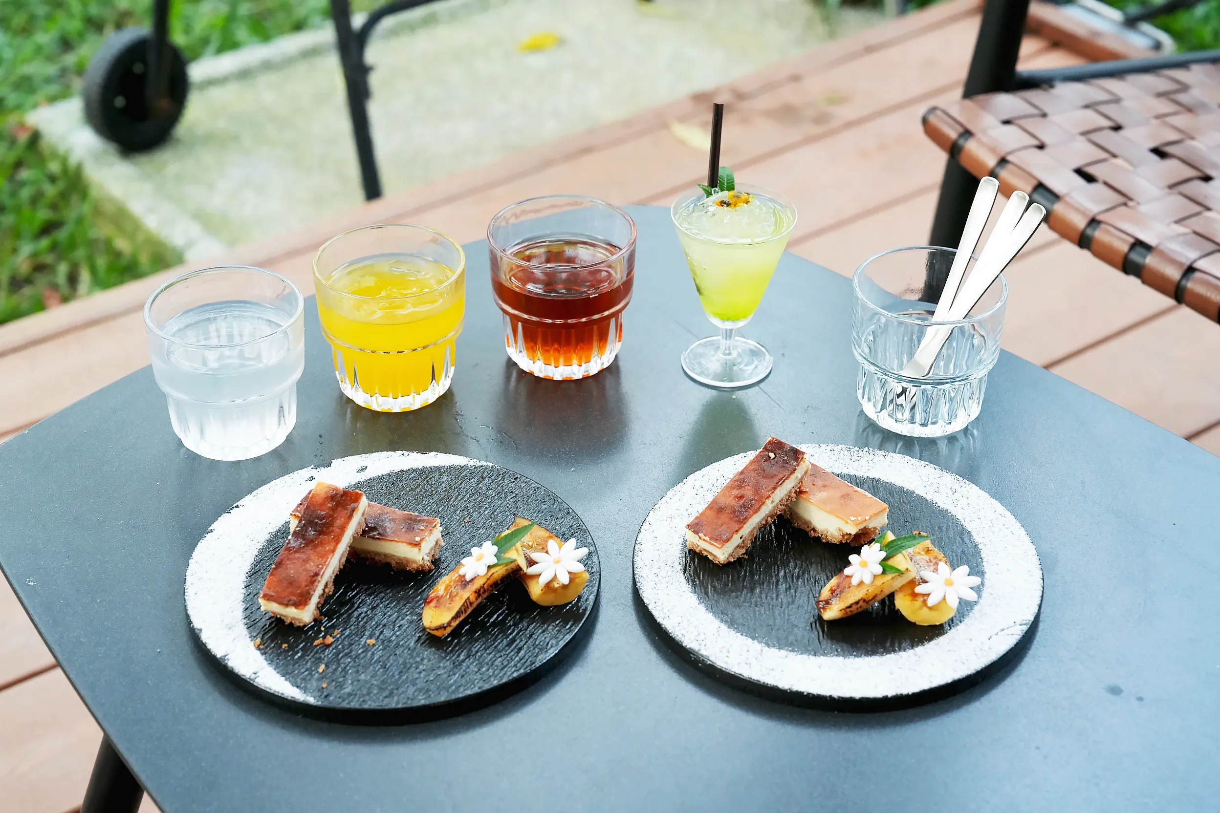 飲料的日月潭紅茶可以無限續杯,當天我們去的時候也有柳橙汁和檸檬水可以選擇,迎賓雞尾酒則是酸甜的味道,沒什麼酒味。巴斯克乳酪蛋糕雖然小小一塊,不過很扎實,乳酪味也很濃郁。