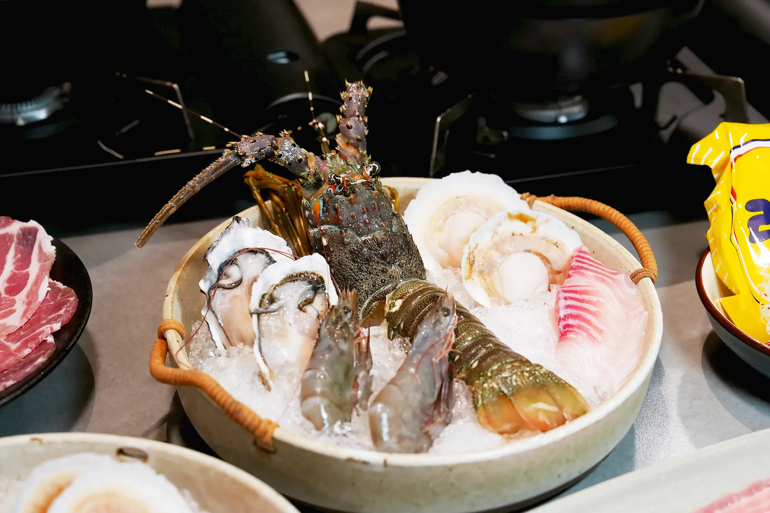 ▼晚餐的海鮮拼盤除了有超大隻的龍蝦以外,還有草蝦、生蠔、扇貝和魚片,全部都很新鮮,主食有白飯、拉麵、烏龍麵和冬粉4種選擇,主食可以無限續加,也可以自己帶食材來煮。