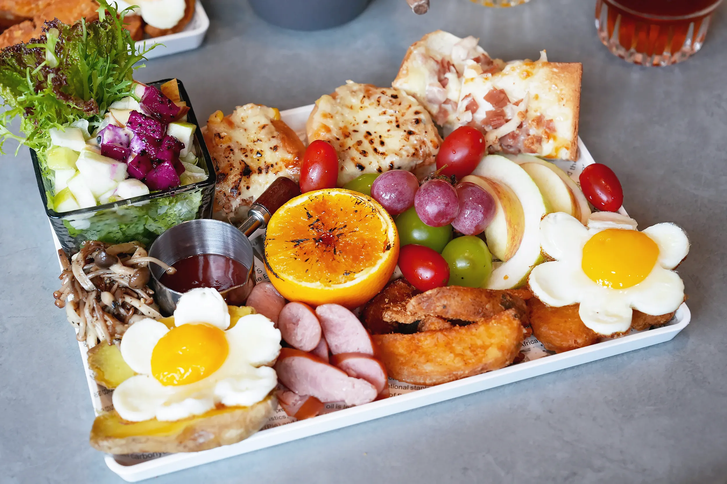 ▼隔天早上的早餐時段可以選擇8:00或是9:00,早餐是英式早餐拼盤,內容非常豐盛,一盤裡有滿滿的沙拉、水果、麵包、蛋、薯塊、德式香腸等餐點,而且吃不飽還可以免費補餐。