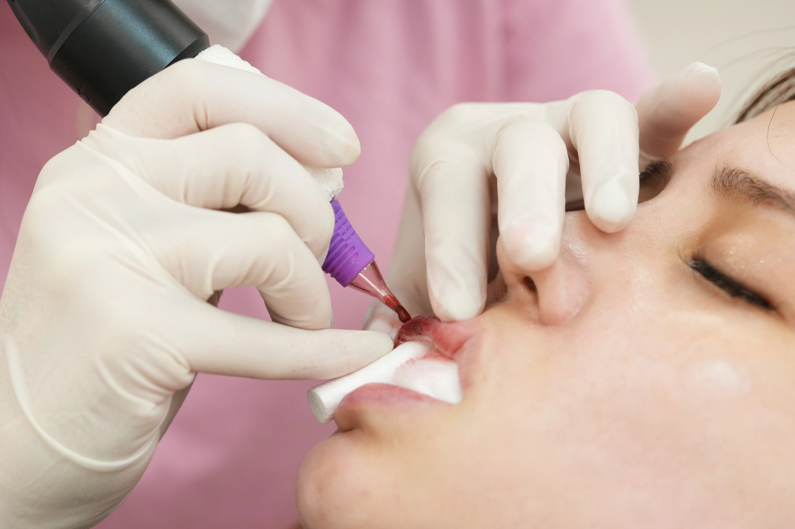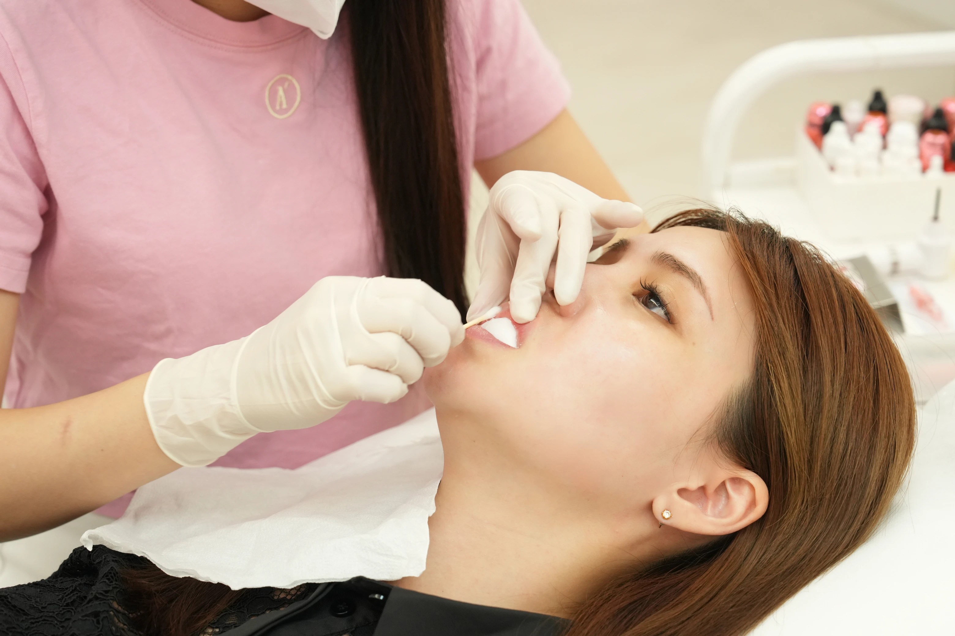 ▼接下來,紋繡師會請你先漱口,並依序在嘴巴放入隔水墊與吸水墊固定嘴型,最後再替嘴唇進行去角質後,就準備開始正式進入霧唇的施作流程啦~