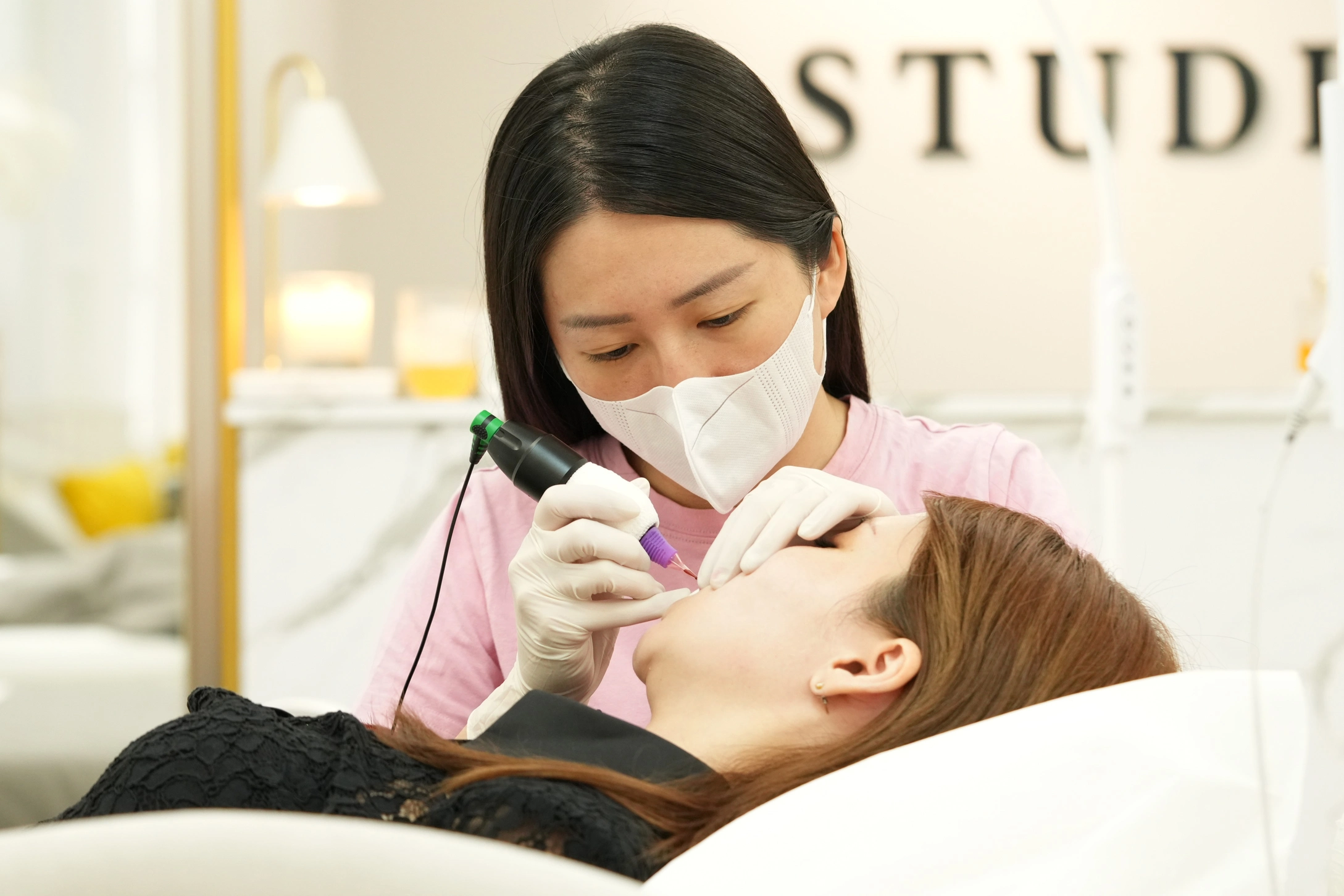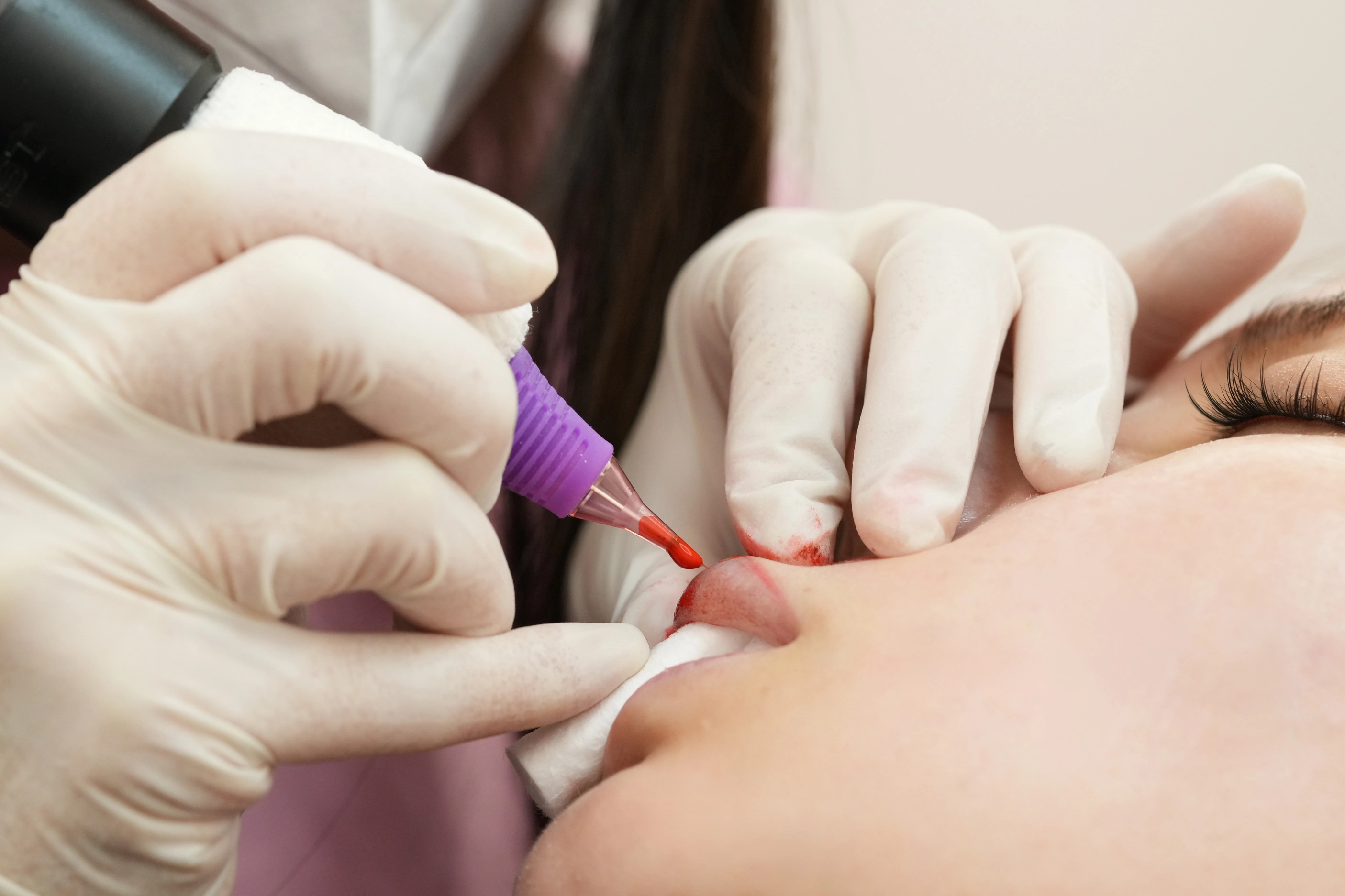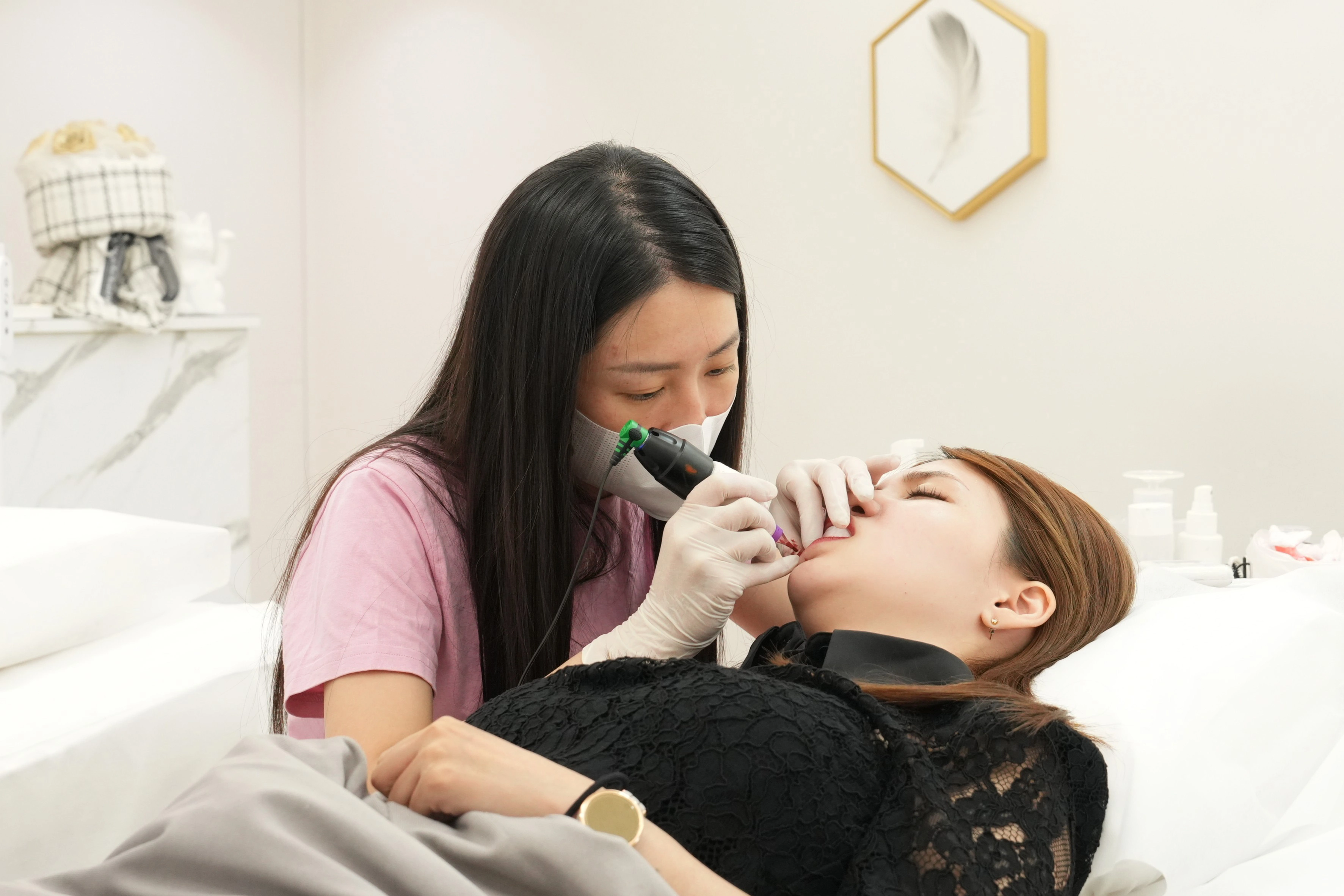 ▼首先,紋繡師會先準備好拋棄式針具並調配適合客人的霧唇色乳,等前置作業完成後,便會正式開始進行霧唇療程。