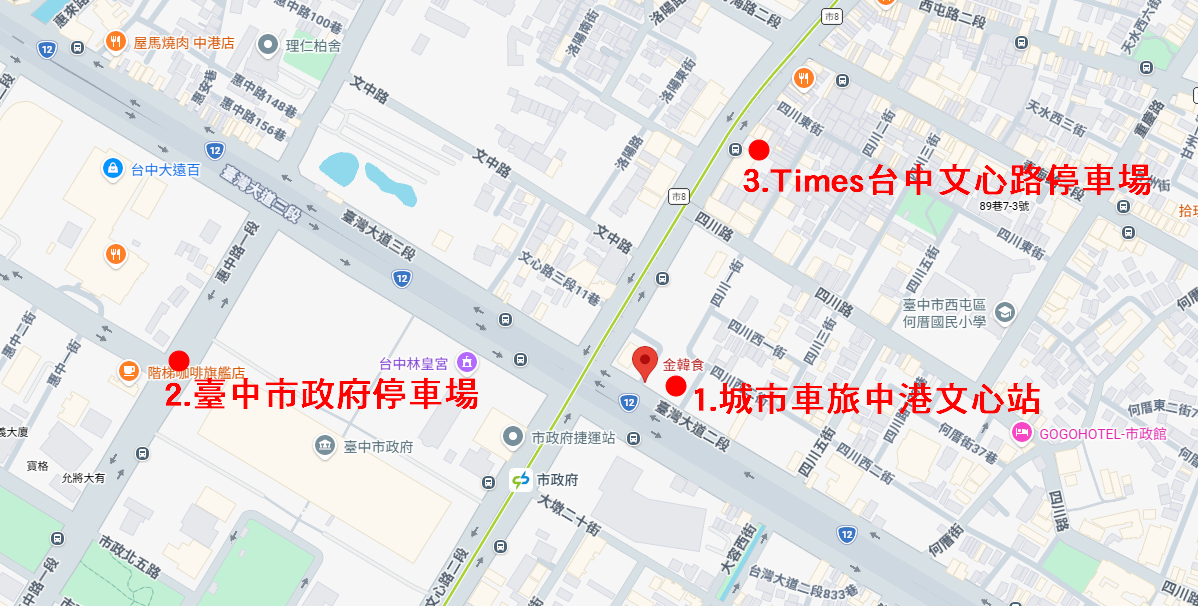 ▼「金韓食」交通機能便捷,鄰近市政府捷運站,步行約三分鐘即可抵達,也可以選擇搭公車,旁邊有公車站牌捷運市政府站(臺灣大道)。