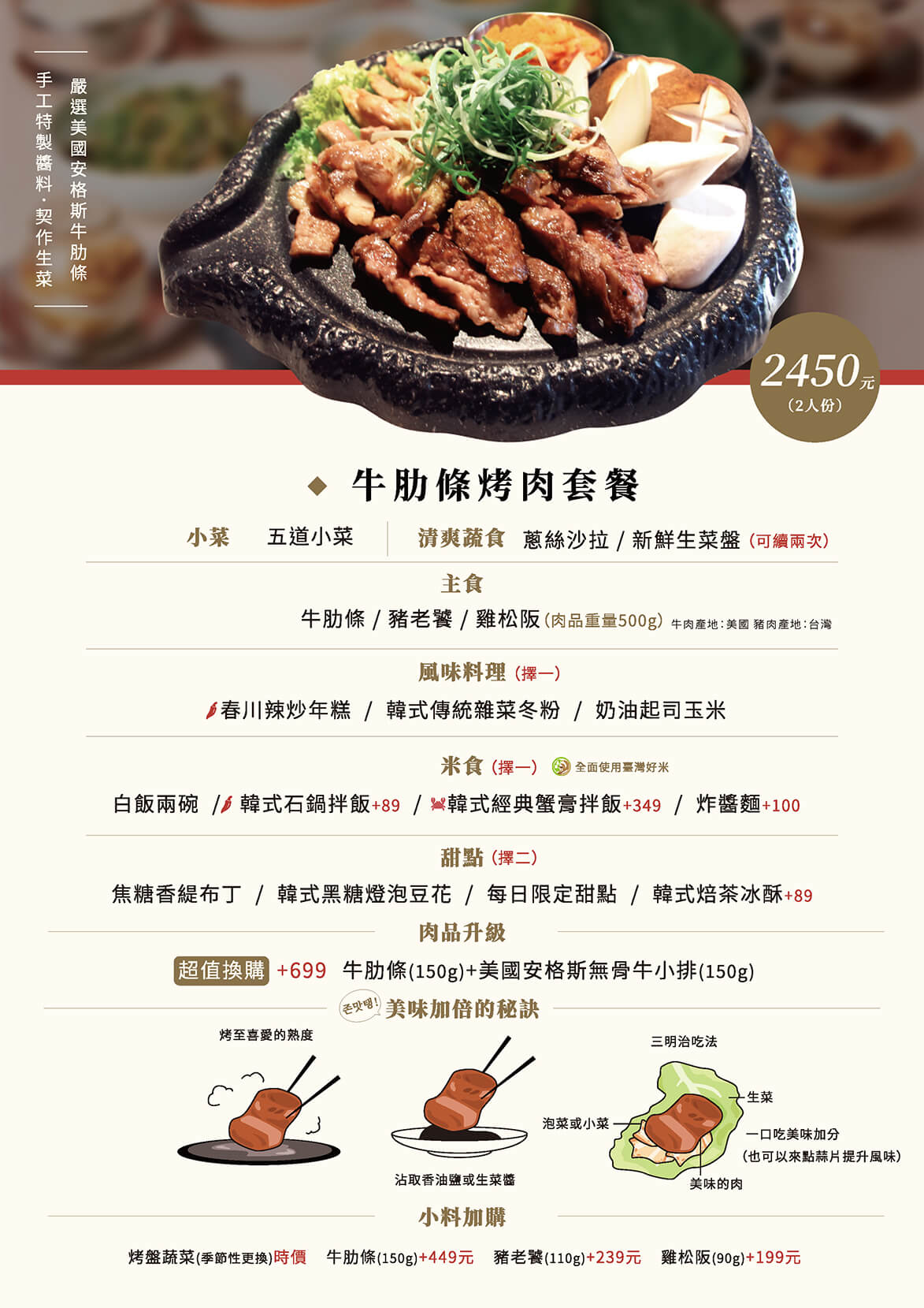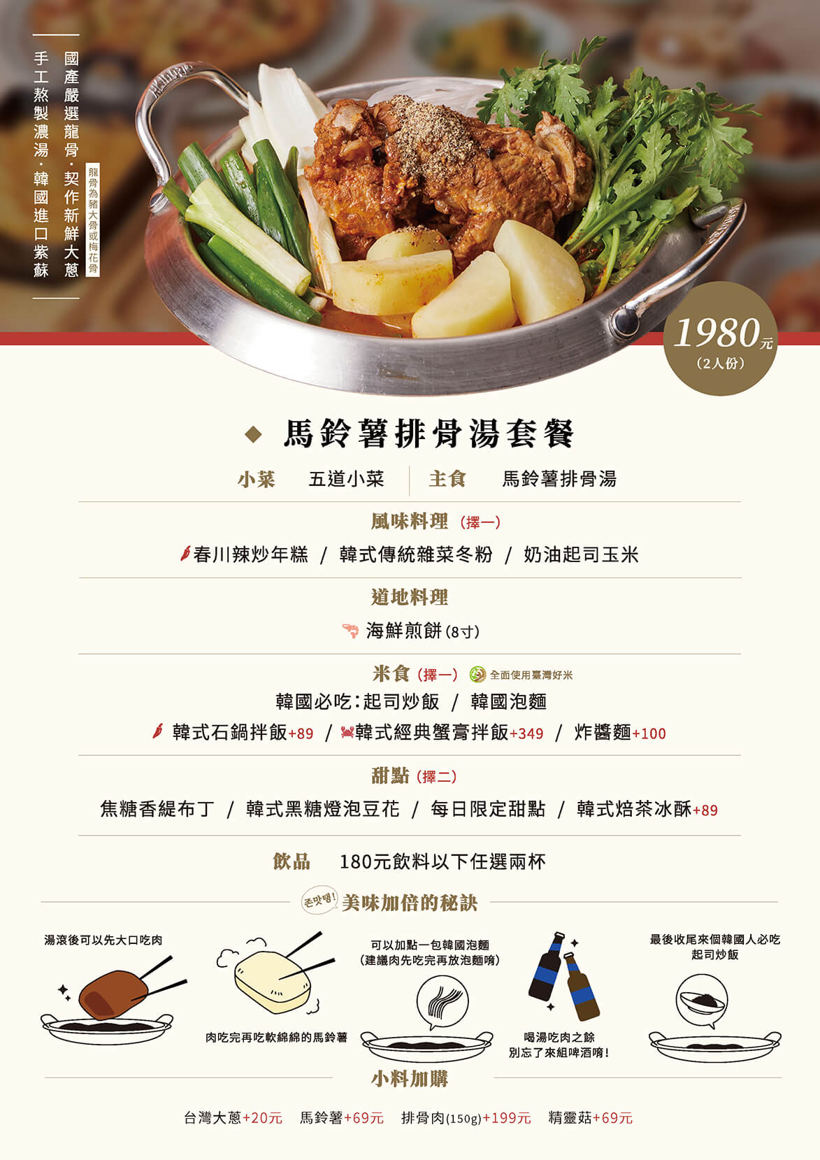 - 套餐附傳統韓式辛奇(泡菜)、蔥拌沙拉、韓式小菜、生菜、麥茶
