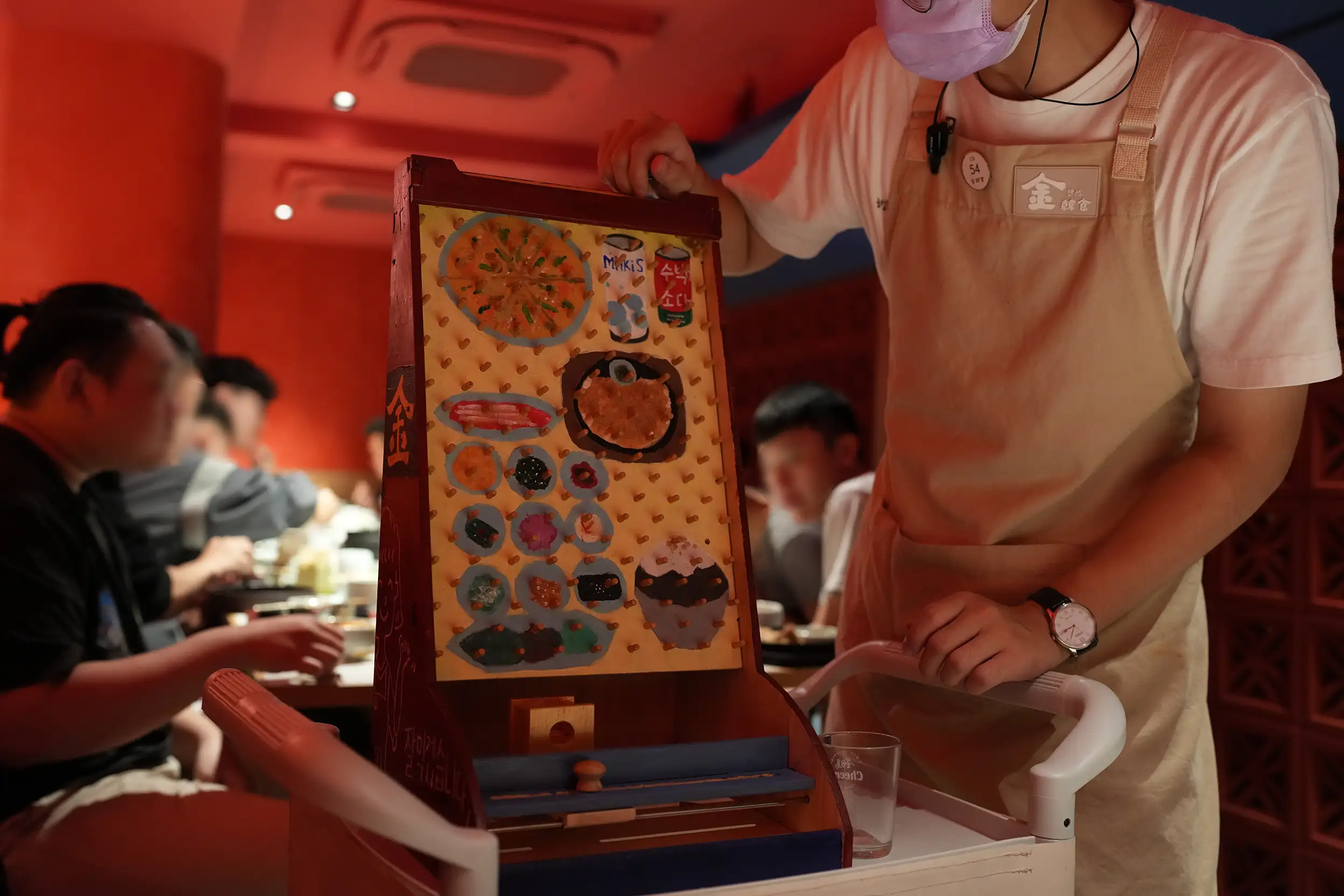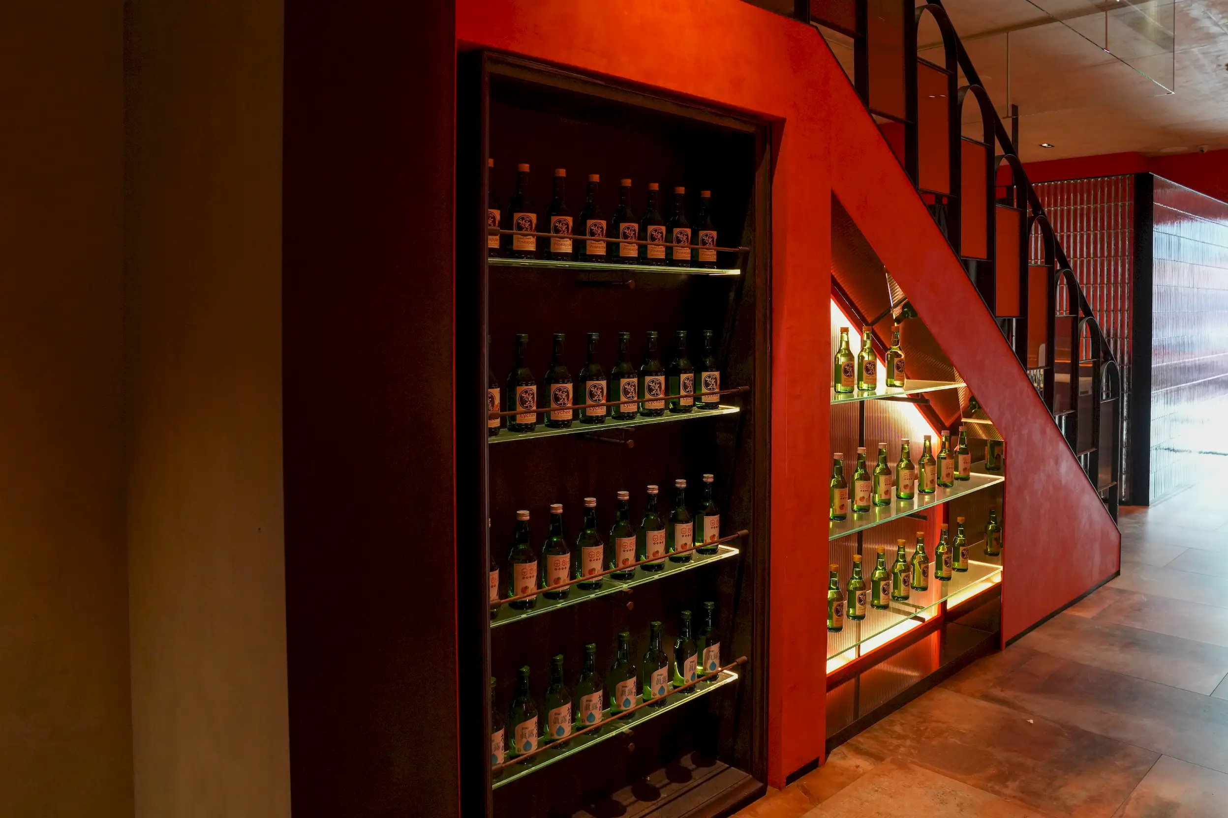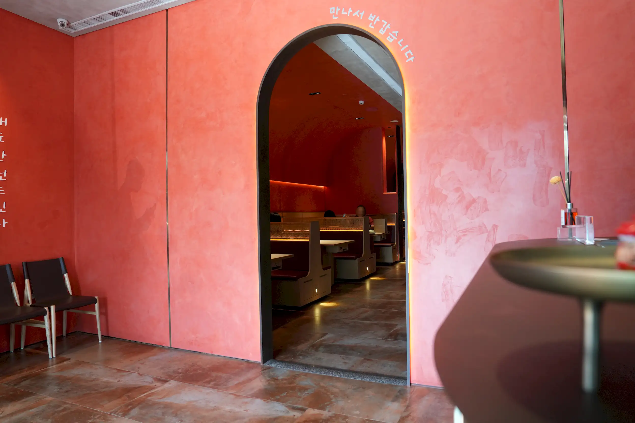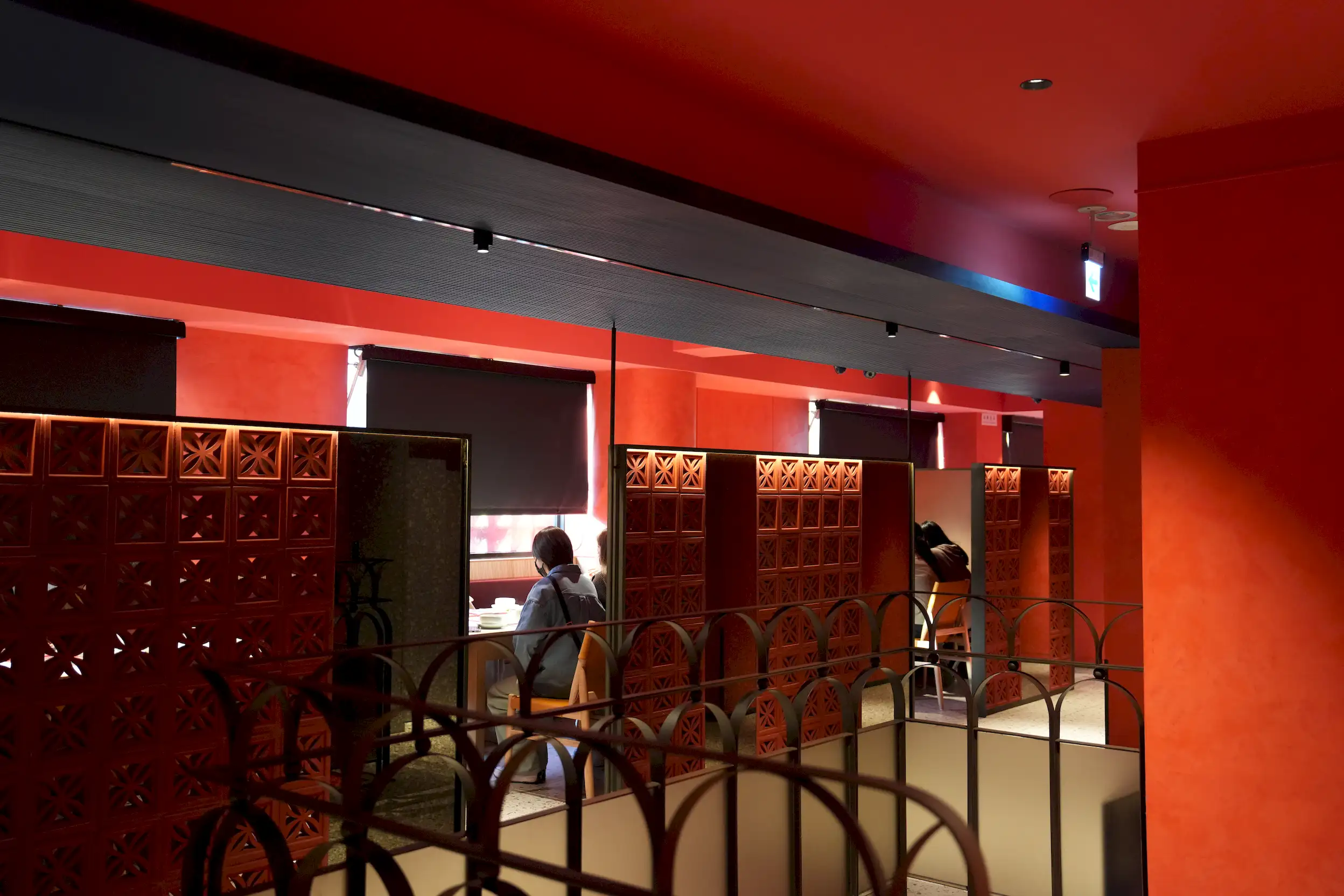 ▼從大門進去,右側是櫃台,左側是候位區,因為我跟朋友有先預約,稍等片刻便由服務人員帶領入座。內裝延續外觀的暗朱紅色調,但細看會發現牆面帶有特殊紋理,在暖色燈光的照映下,更顯視覺層次與品牌美學。
