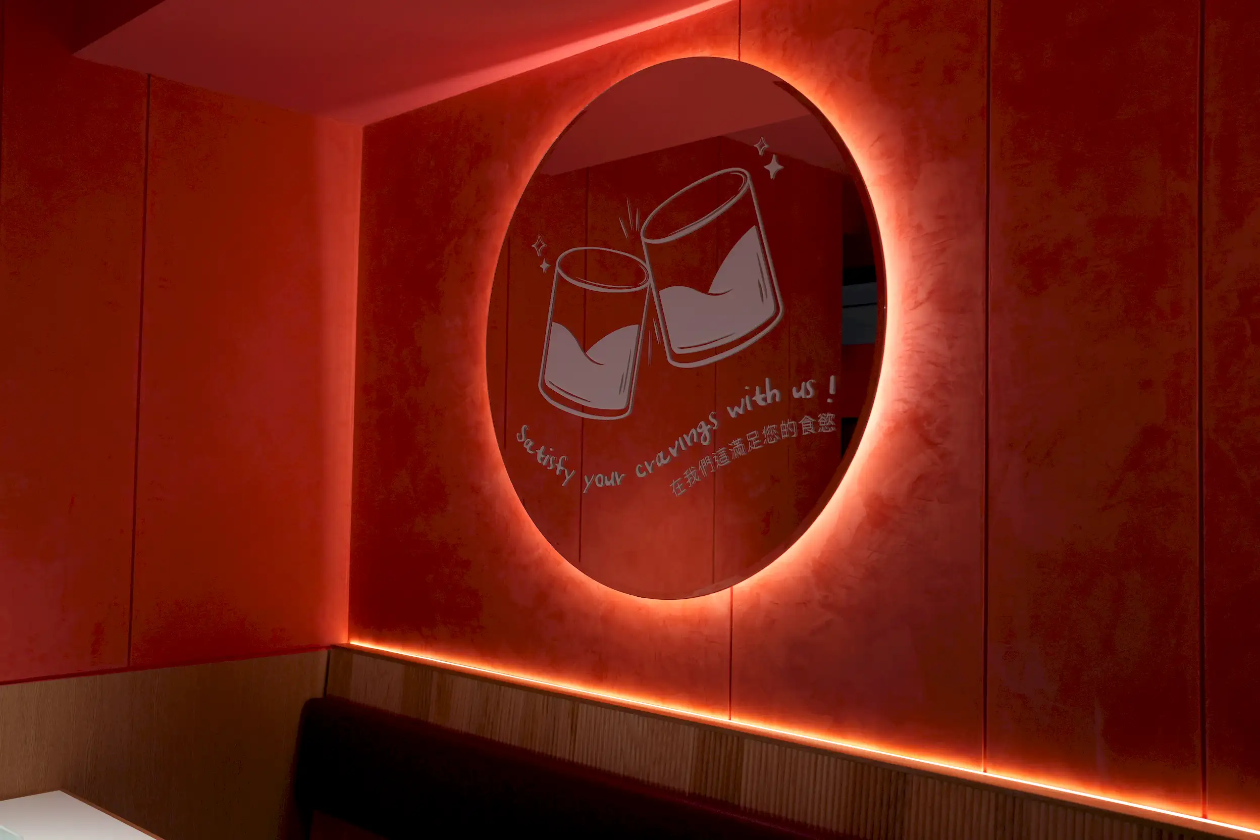 ▼牆面上的圓形鏡面裝飾,刻繪著可愛的乾杯圖樣,搭配鏡背散發出的柔和燈光,為空間點綴了一份微醺的活潑感,讓人忍不住想與朋友一同 Cheers。