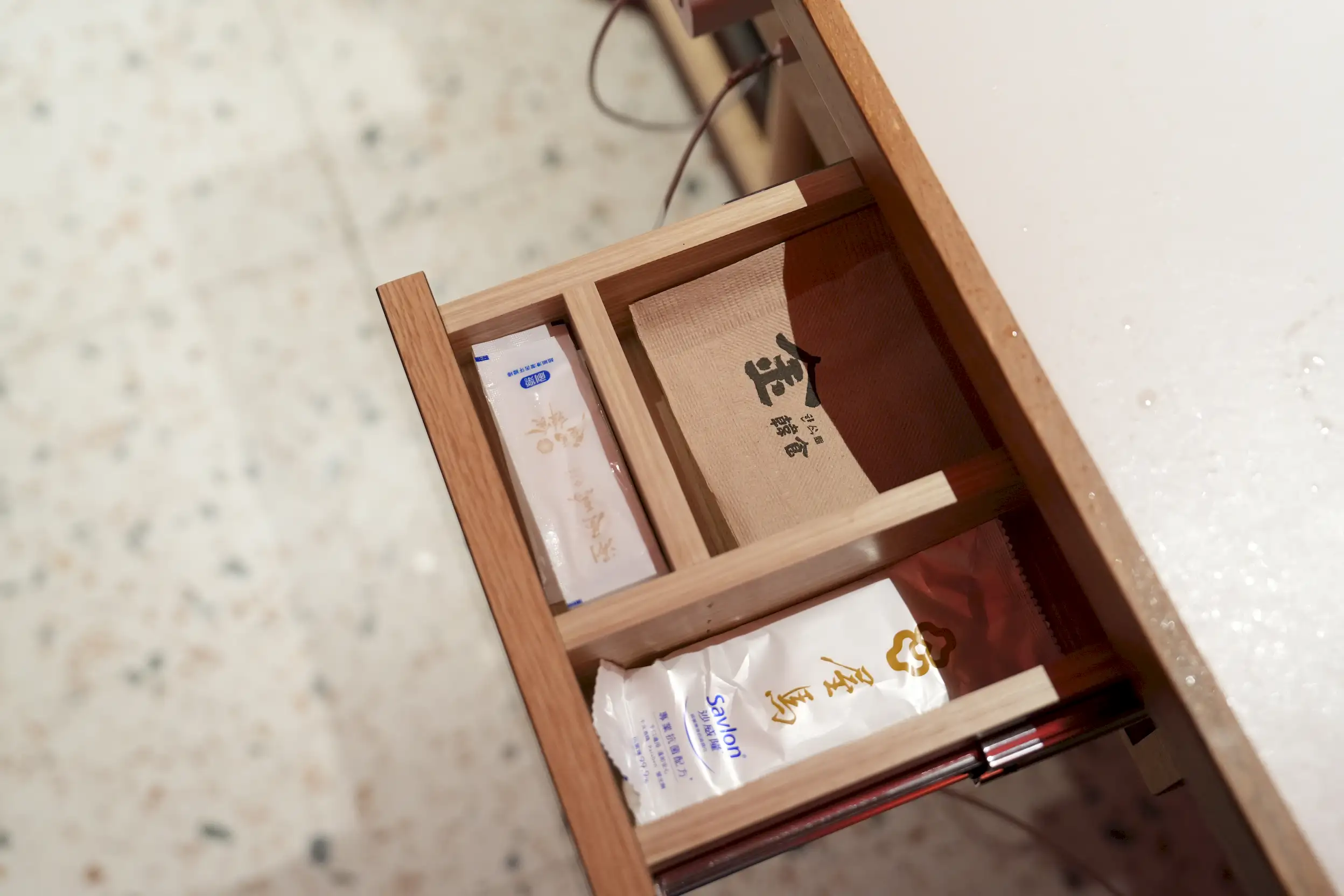 此外,店家的貼心也體現在細節處,桌邊不僅設有充電孔解決電力焦慮,抽屜內更整齊備妥了牙線、衛生紙與濕紙巾,讓用餐過程感到非常便利且舒心。