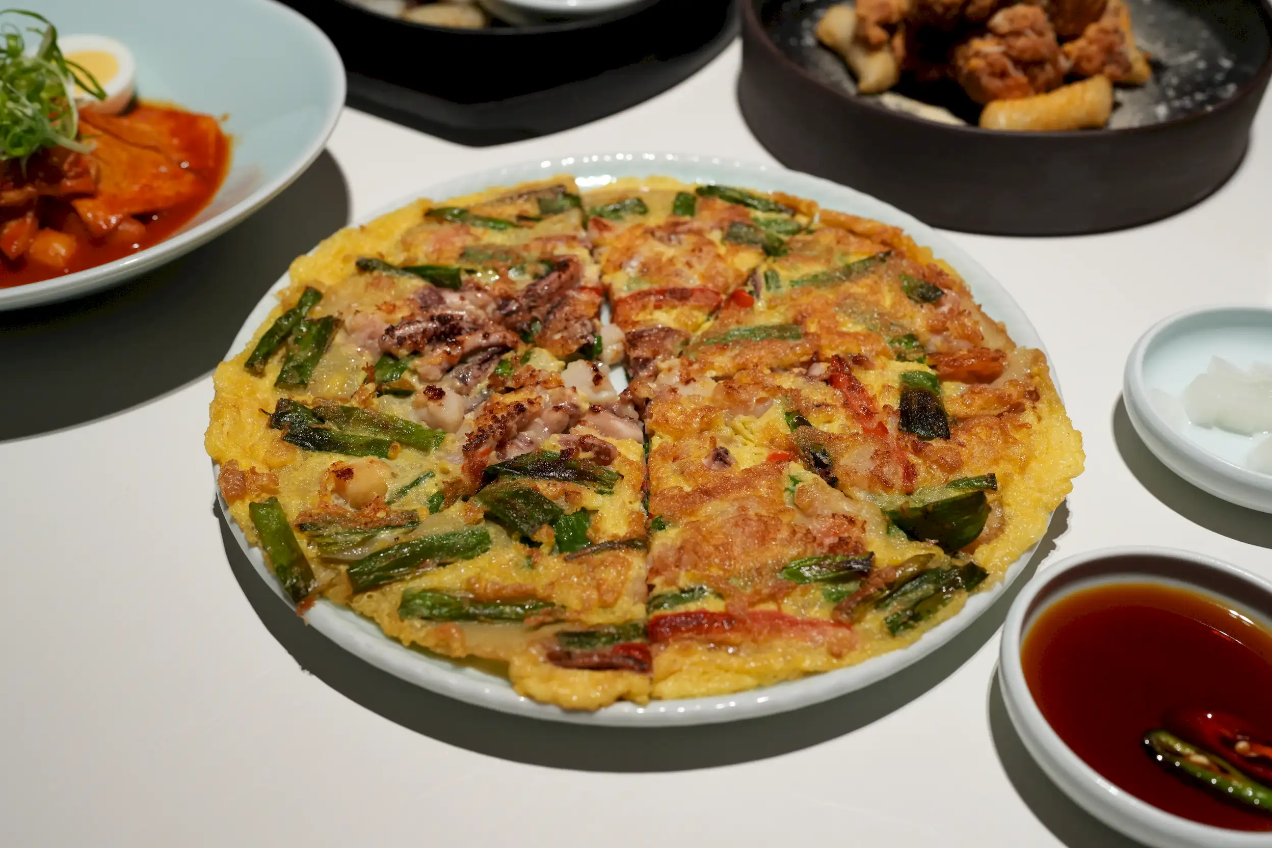 ▼都來吃韓式料理,海鮮煎餅也是必點,韓國料理真的太多必點了XD,還好套餐加199元就可以換購了,用料真的很豐富,有魷魚、蝦子、小貝柱、紅辣椒、蔥段等,從側面看就是滿滿的用料,快看不到煎餅的粉漿部分,唯一的缺點就是蔥段非常大,像我這種不愛吃蔥的就會覺得蔥味比較明顯。