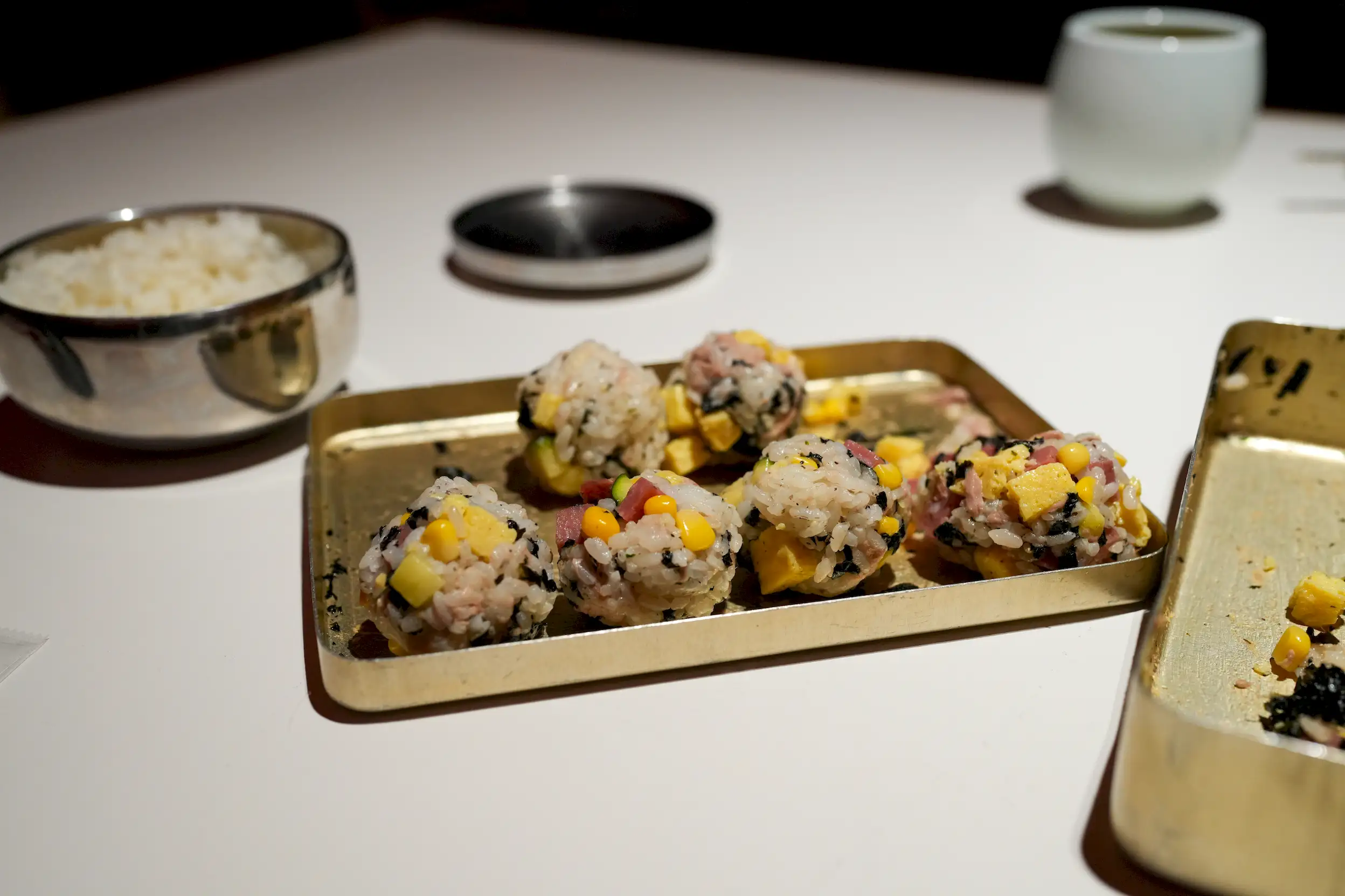 ▼套餐會附台稉九號米煮的白飯,也可以加80元換成搖搖便當,飯上面會鋪滿鮪魚、玉米、玉子燒、櫛瓜、火腿、海苔,想看搖之前的樣子,可以參考上方的大合照,搖完後就會變成下圖,看起來混合得很均勻XD,還會提供手套,可以自己捏成想要的形狀。
