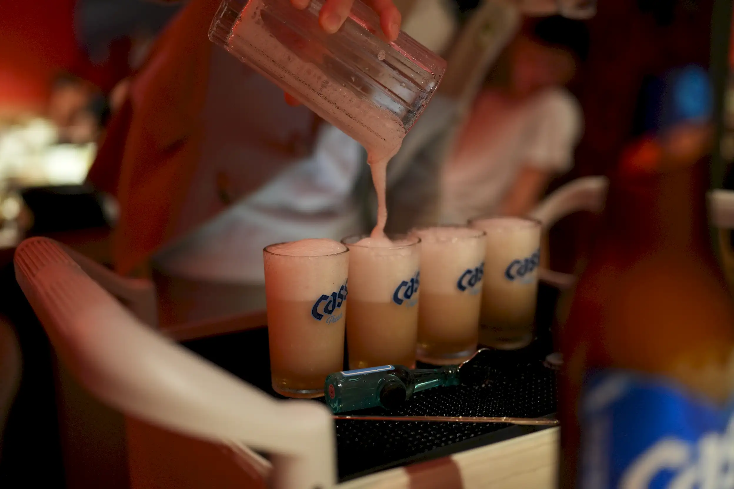 ▼不知道是不是有表演、氛圍加成,我覺得很好喝,單喝啤酒太苦澀,單喝燒酒太單調,但當兩者合在一起,既保有了啤酒的氣泡感,又融合了燒酒的荔枝香氣,這時再來塊炸雞,我只能說完美。
