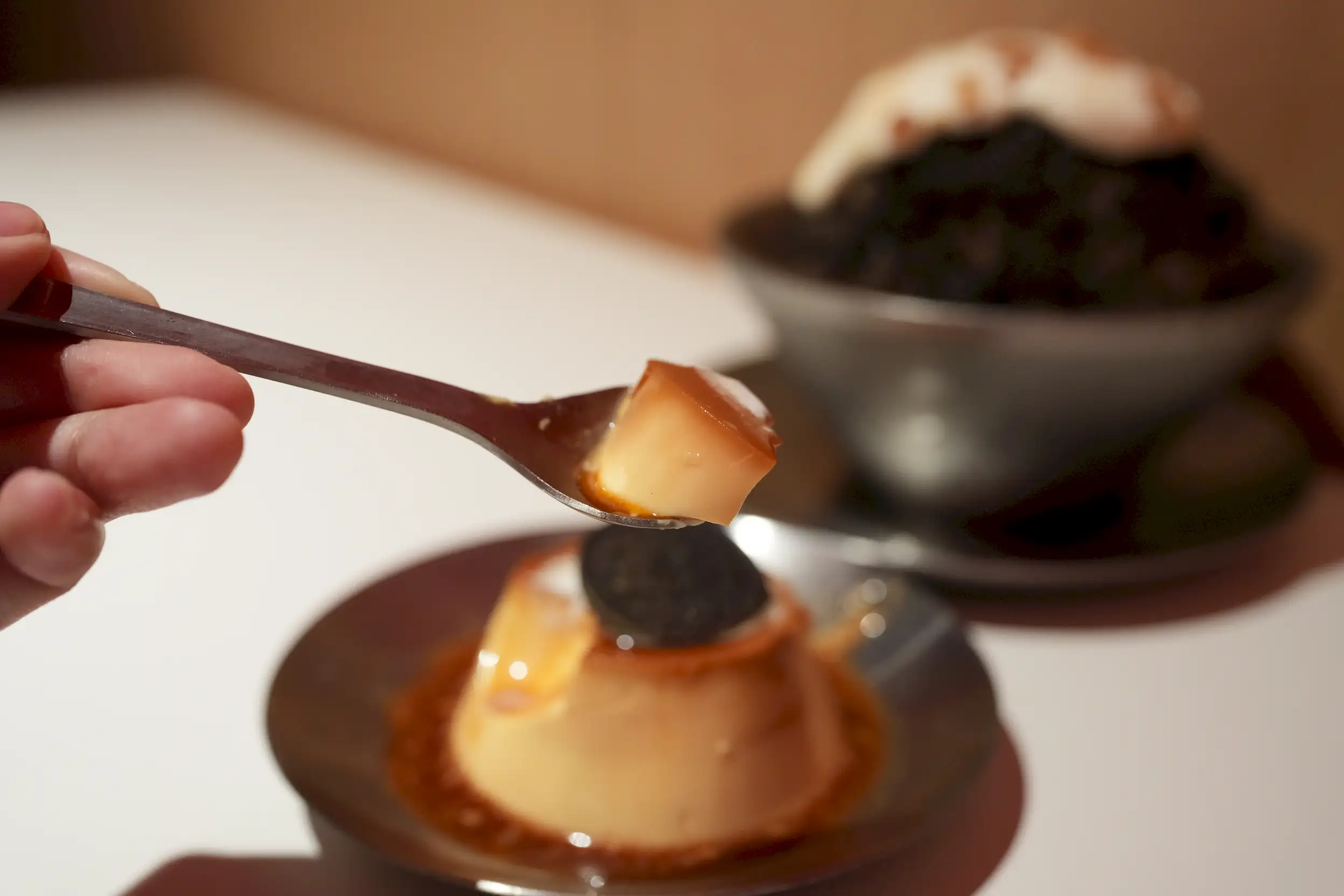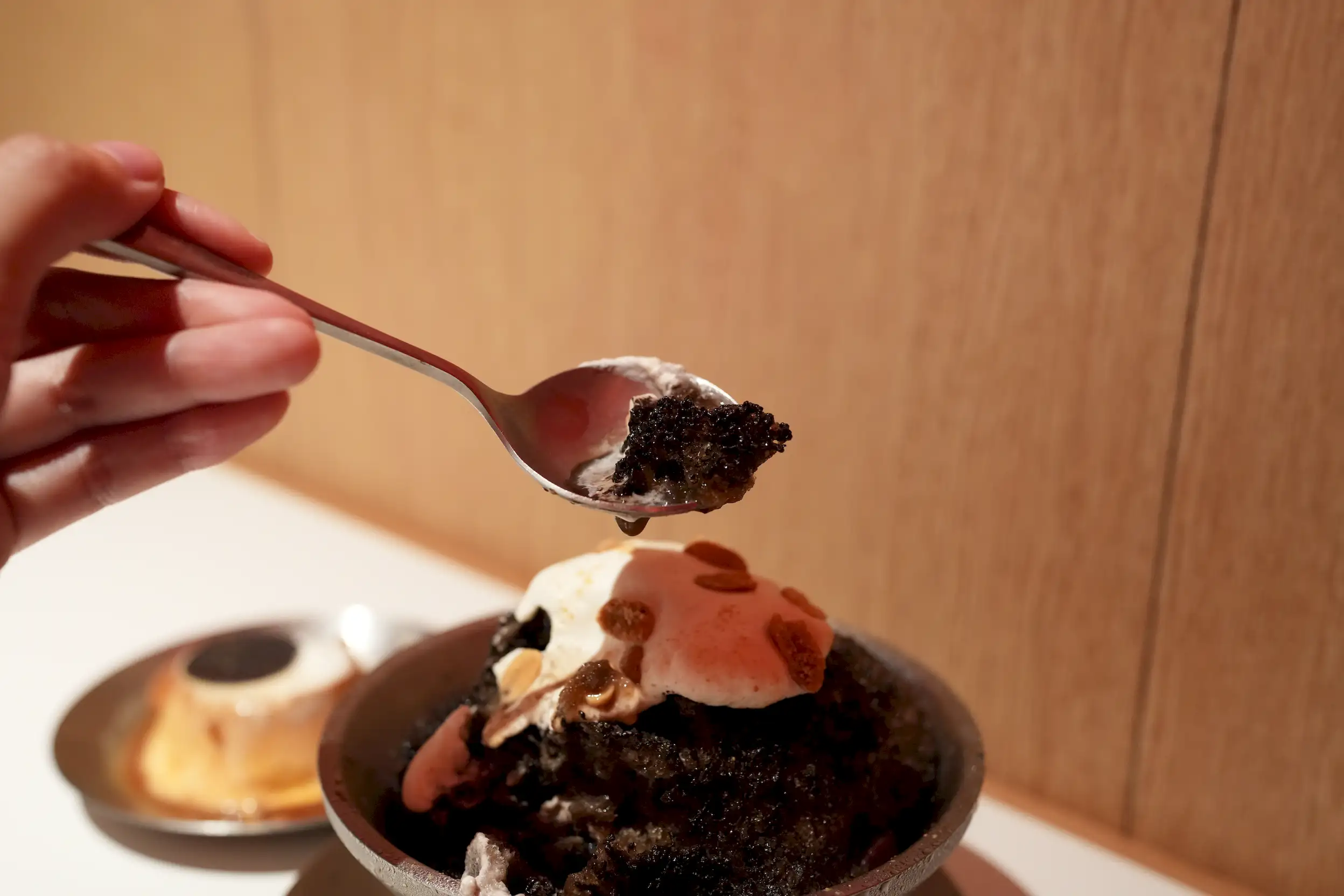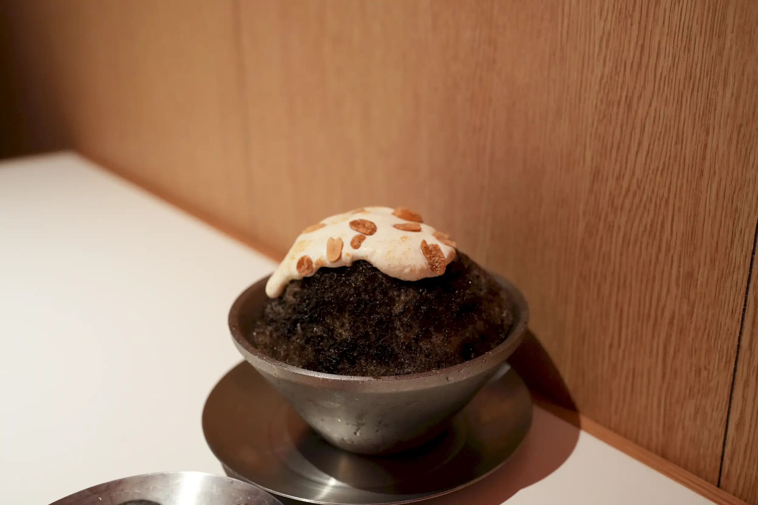 ▼嗨完後就是甜點收尾,韓式焙茶冰酥裡面有焙茶醬、水玉、紅豆、花生、自製鮮奶油,我跟朋友都覺得有點甜,焙茶的存在感比較低一點,相比之下,我發現自己還是覺得將焙茶做成飲品更對味。