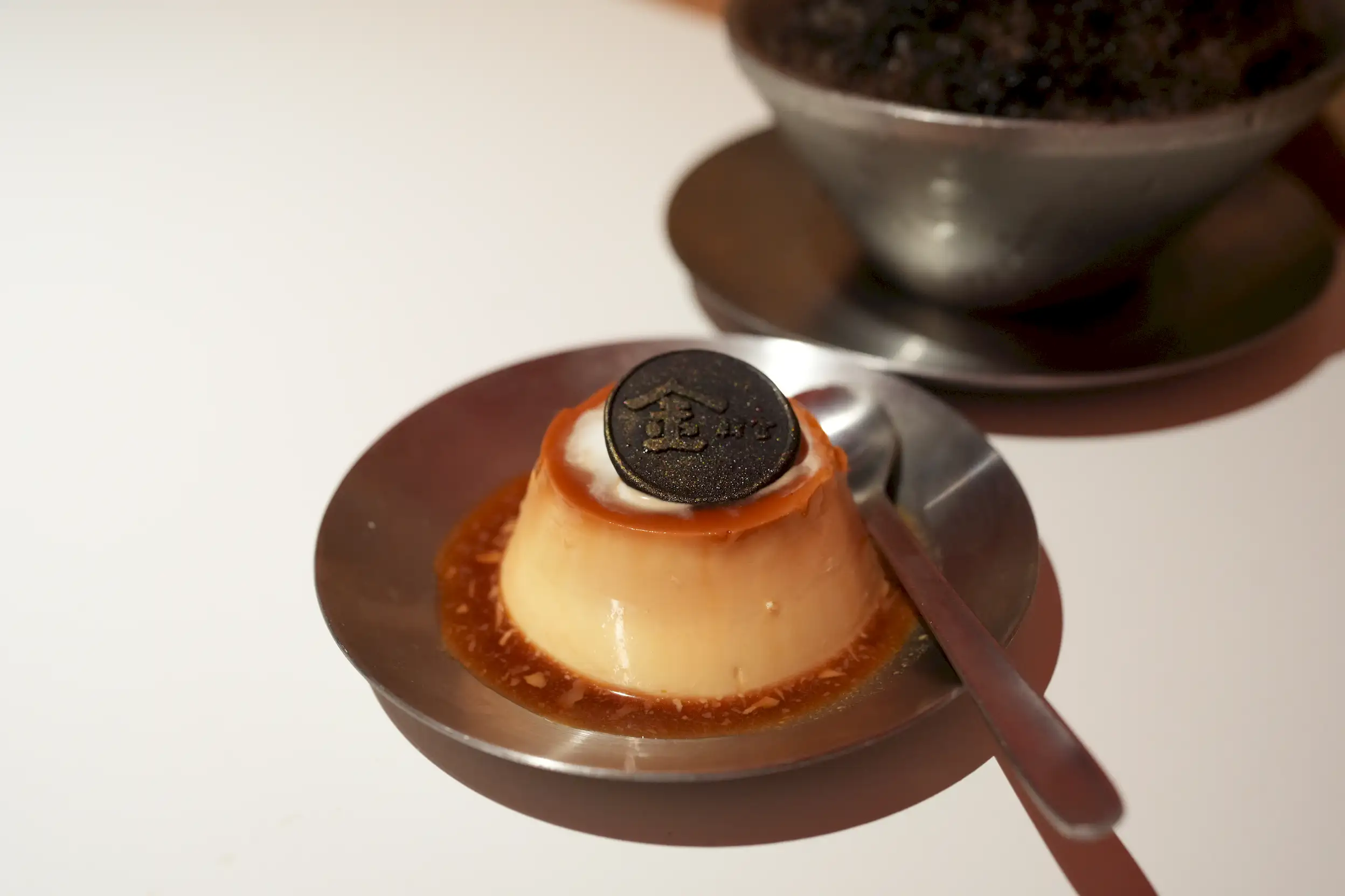 ▼還不錯吃的苦甜布丁,口感很綿很軟嫩,可以感受它在嘴巴化開的醇厚感,還有焦糖的苦甜香氣,跟一般布丁Q彈感不同,應該可以說像是布蕾的口感,上面還有白乳酪鮮奶油,以及一塊寫著「金」的巧克力,我是覺得單吃布丁就很好吃了,其他的就是點綴。