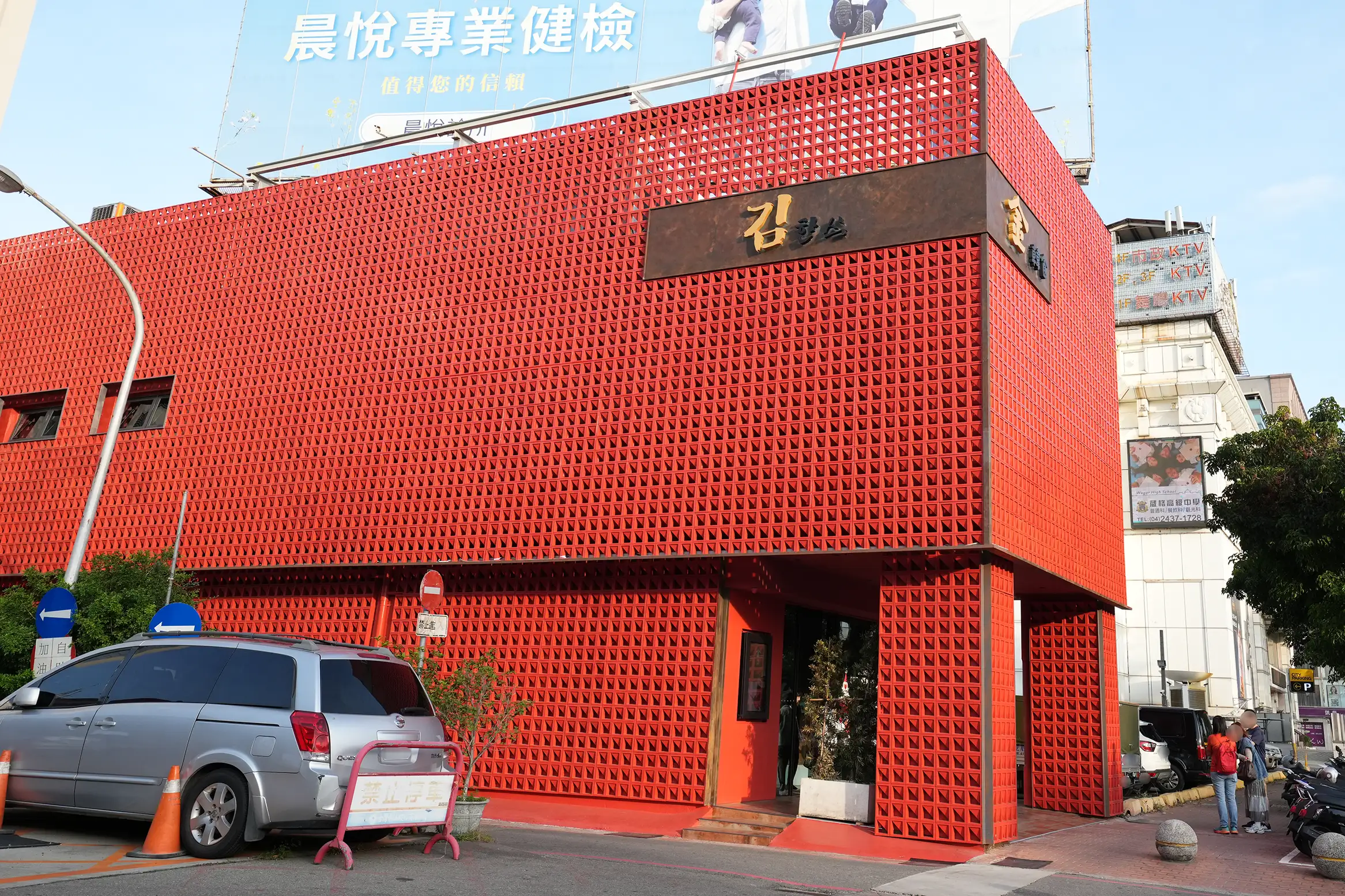 ▼「金韓食」的暗朱紅色調在台灣大道上真的很顯眼,經過一定會忍不住多看兩眼,而近看又會發現小巧思,正面與左側外牆佈滿方形格柵,讓純色的設計變得有層次,帶出內斂尊貴的東方韻味。