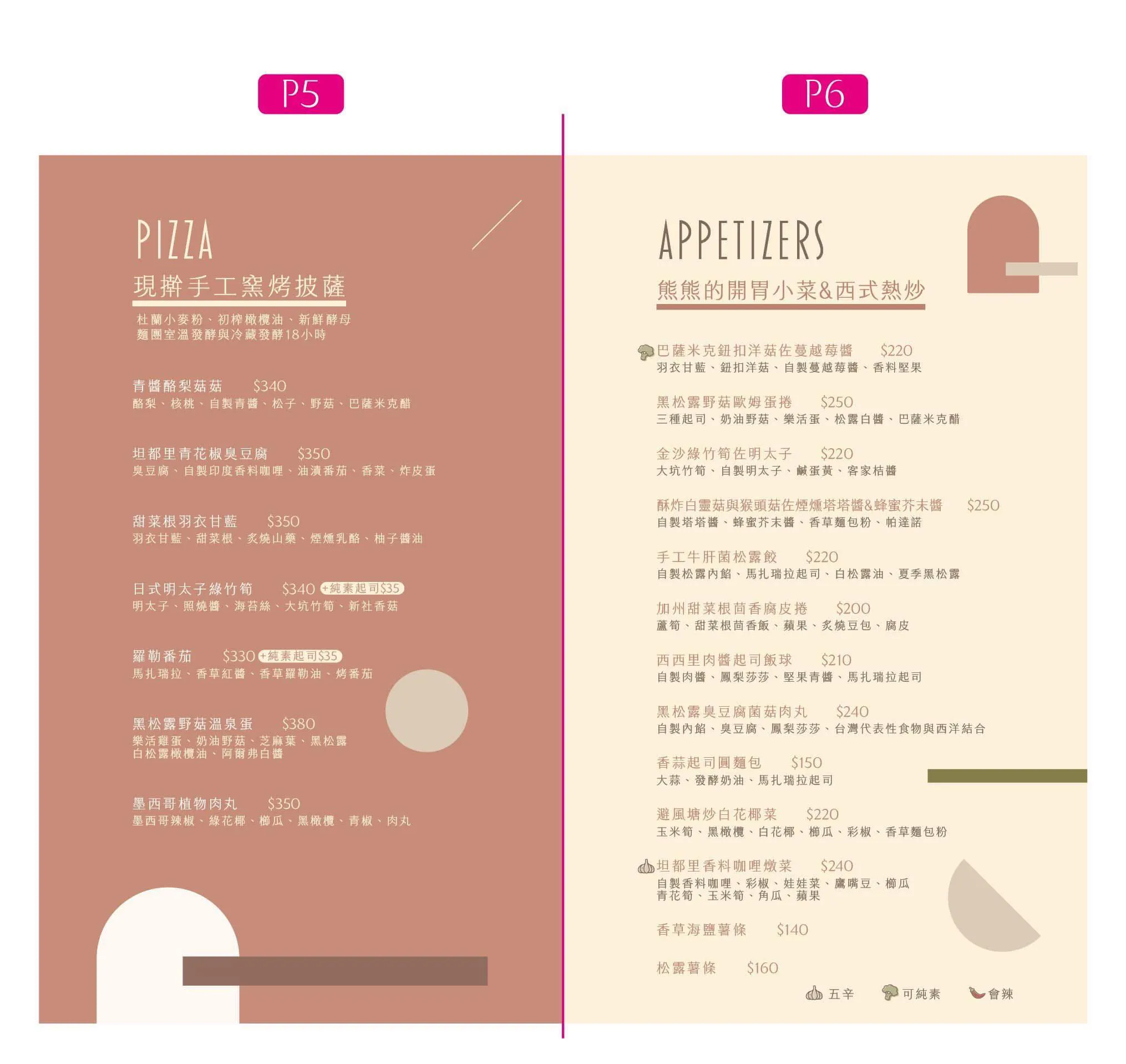 ▼我跟朋友平日傍晚造訪「兔子遇到熊」,因為在外活動了一整天,決定要好好慰勞我們的五臟六腑,總共點了:黑松露野菇溫泉蛋披薩、絲瓜綠竹筍燉飯、松露薯條、托斯卡尼煙燻橘醬直麵、玫瑰莓果燕麥奶、水蜜桃氣泡飲。