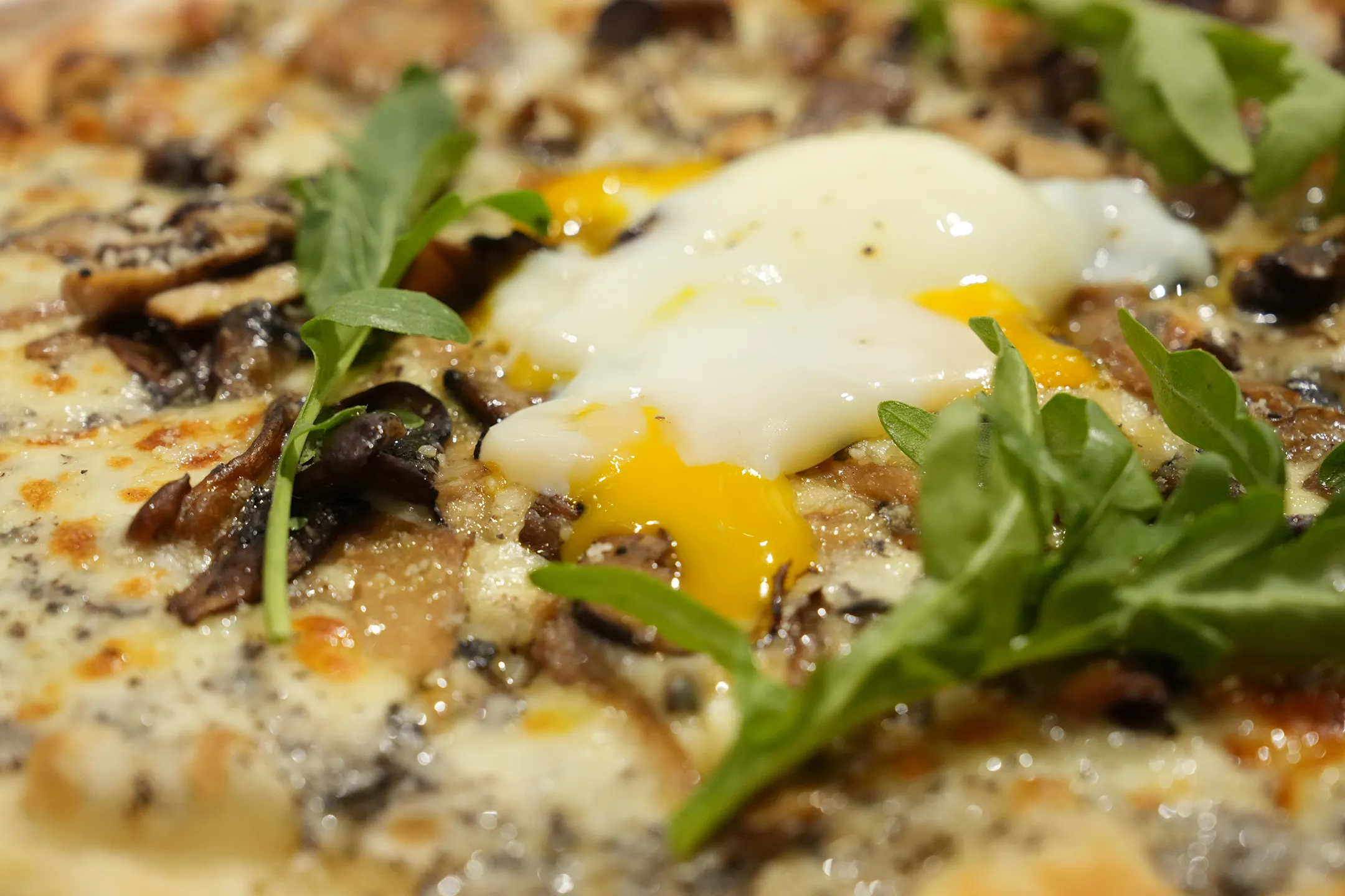 ▼披薩的重頭戲就是中間的溫泉蛋,輕輕戳破蛋黃,讓蛋液與披薩融為一體,為披薩增添濕潤的口感,不過因為松露的關係,溫泉蛋沒有很突出。