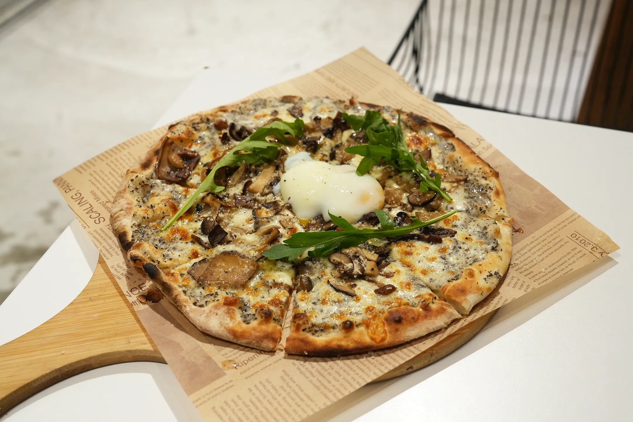 ▼披薩配料包括:樂活雞蛋、奶油野菇、芝麻葉、黑松露、白松露橄欖油、阿爾弗白醬,披薩本身吃起來有點嚼勁,但不會過硬,調味好吃,不過松露味偏重,對於會怕松露味的人,我建議可以先PASS。