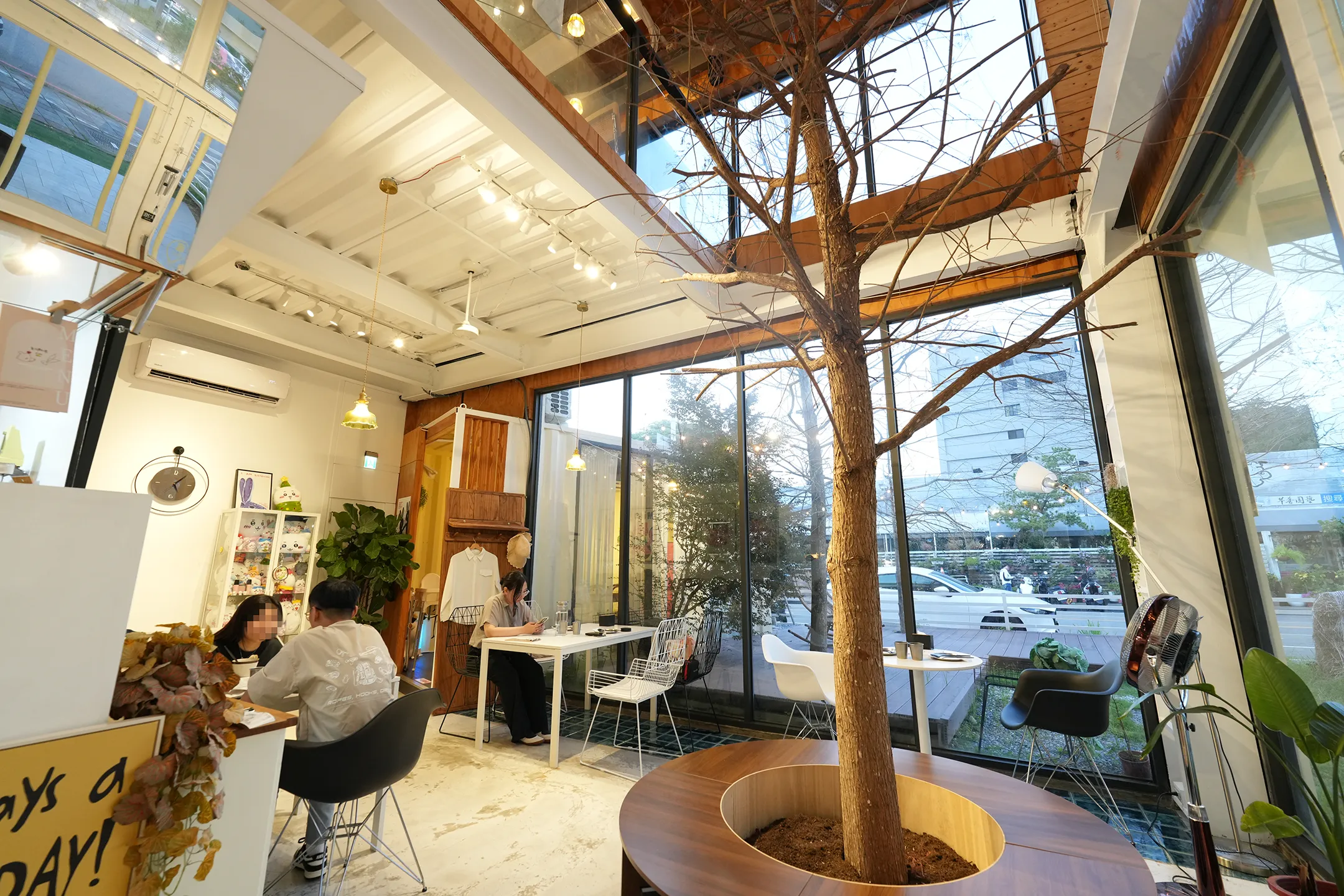 ▼一樓空間最吸睛的莫過於那棵矗立在室內的大樹,彷彿將戶外的自然氣息延伸進屋內。樹木高聳直立,為整體空間增添了生命力與層次感,陽光從大片玻璃窗灑落,映照在樹葉間,形成柔和的光影效果。