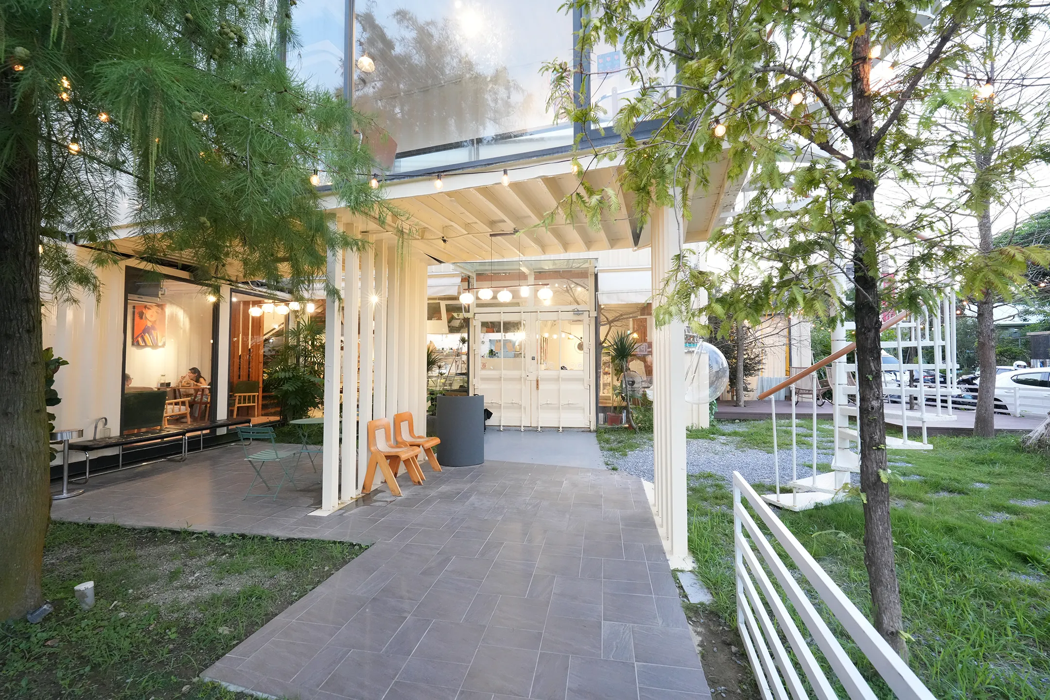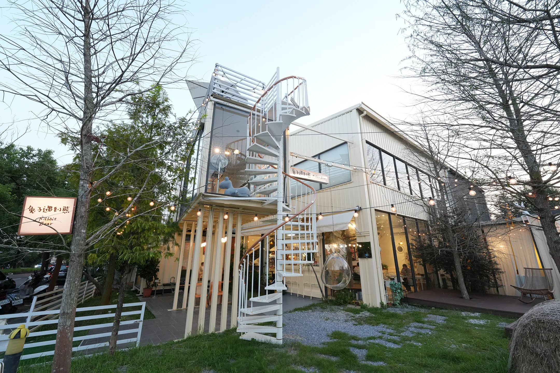 ▼「兔子遇到熊」是以白色為主的兩層樓建築,外觀明亮清新,散發濃厚的文青氣息,戶外的旋轉樓梯可以前往二樓露台,庭院裡還有透明吊椅可以拍照打卡。