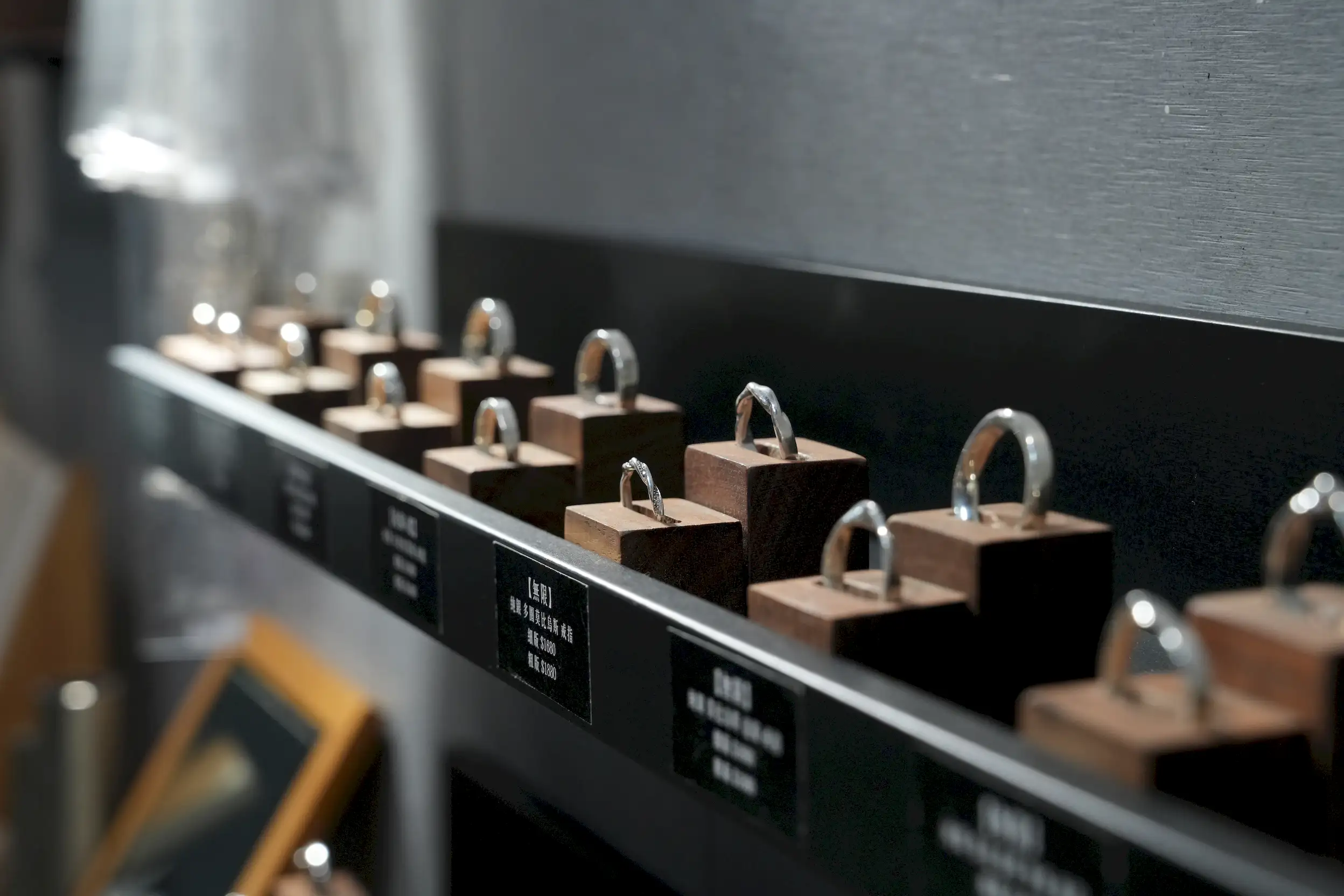 ▼從大門進來的右側擺滿了各種戒指、項鍊、手環,可以先在這邊挑款式,然後戴到手上看看效果,這樣比起看照片直覺多了,畢竟只有戴上手才知道適不適合,而且戒指種類很多,我跟朋友直接選擇障礙,挑了很久才決定要做【無限】純銀多圈莫比烏斯戒指。