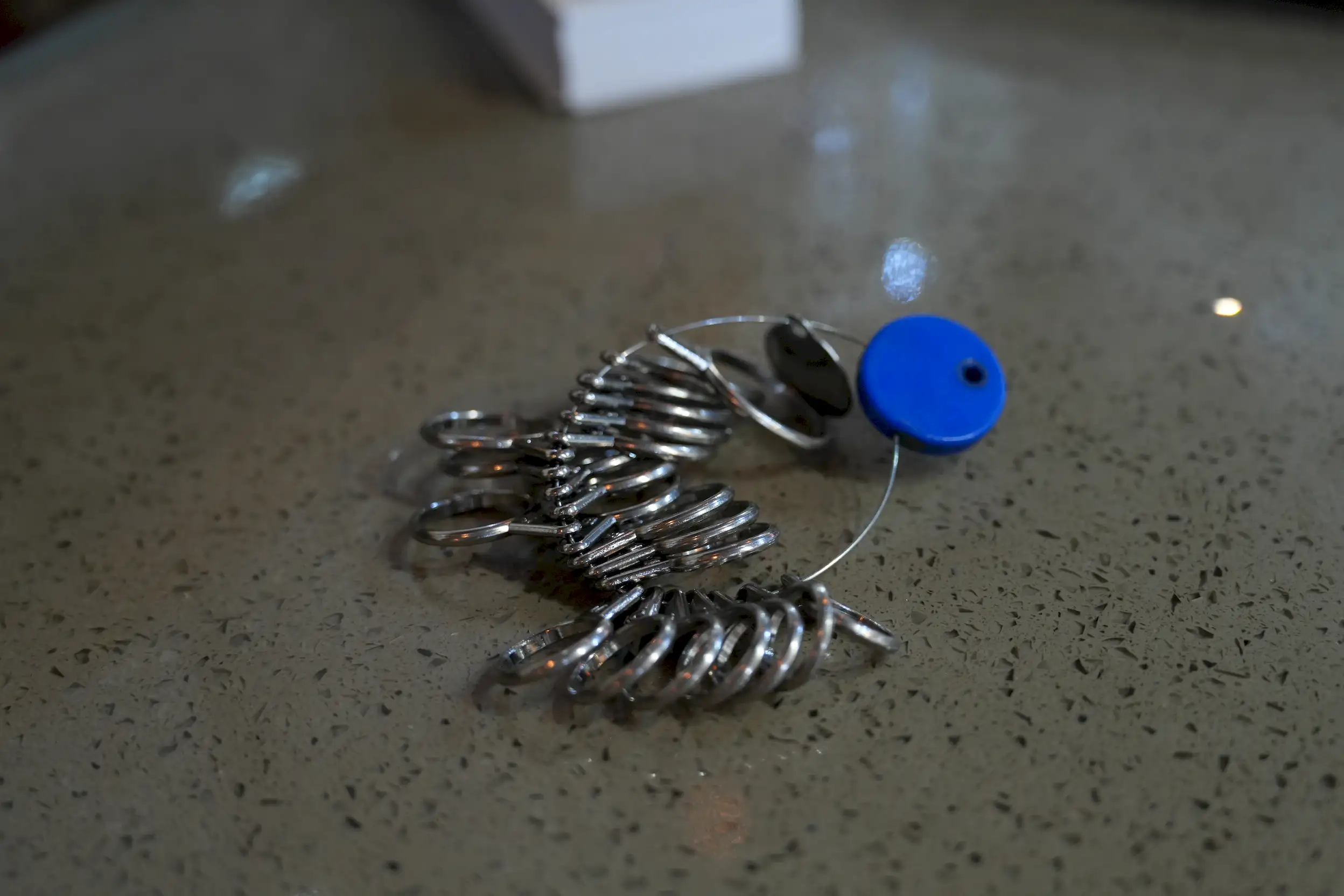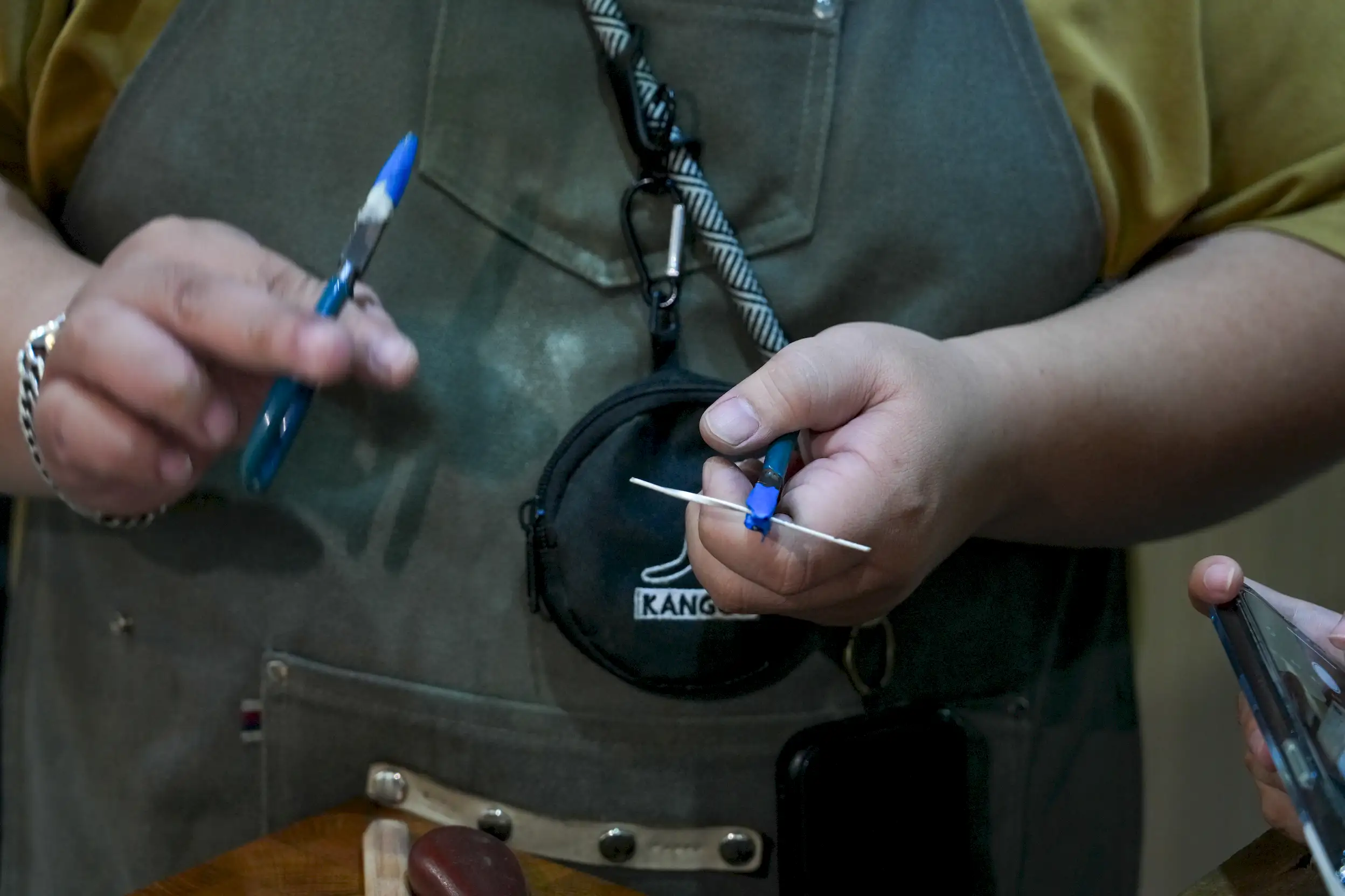 ▼接著要決定戒圍,老師拿出一整串戒圍圈讓我們試戴。我是做小指戒,所以慢慢試到剛好貼合、不會鬆脫的尺寸,不過還是有點不放心,又拿去請老師幫我確認,老師也很有耐心地再幫我看一次尺寸是否合適。