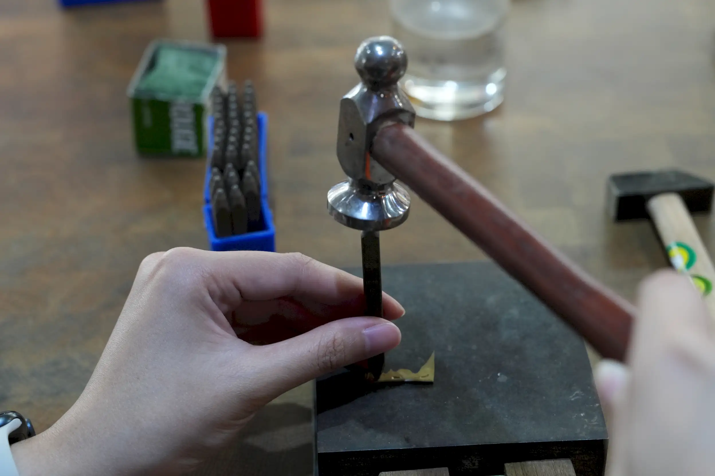 ▼既然是屬於自己獨一無二的戒指,當然要在上面敲下自己喜歡的字,【無限】這款戒指可以敲英文大寫、小寫、數字、簡單圖形等,有的戒指款式比較細,可能會有些圖案不能敲,這些細節老師都會先提醒,並提供材料讓我們先練習敲看看,感受不同力量造成的圖案深淺變化,以及如何對準至想要的位置。