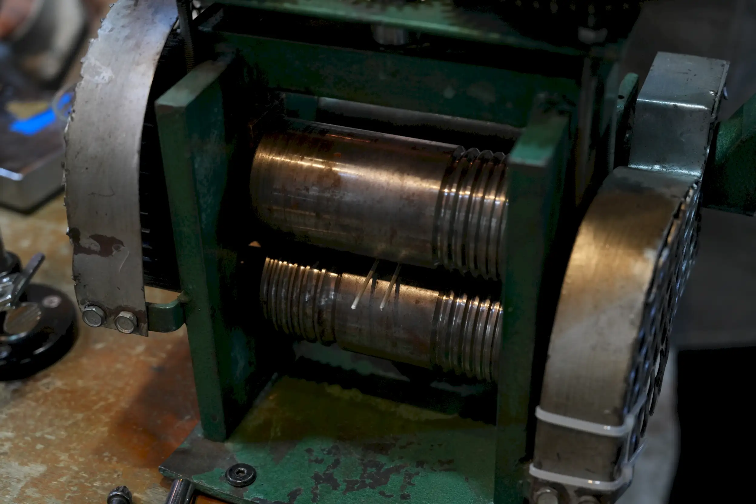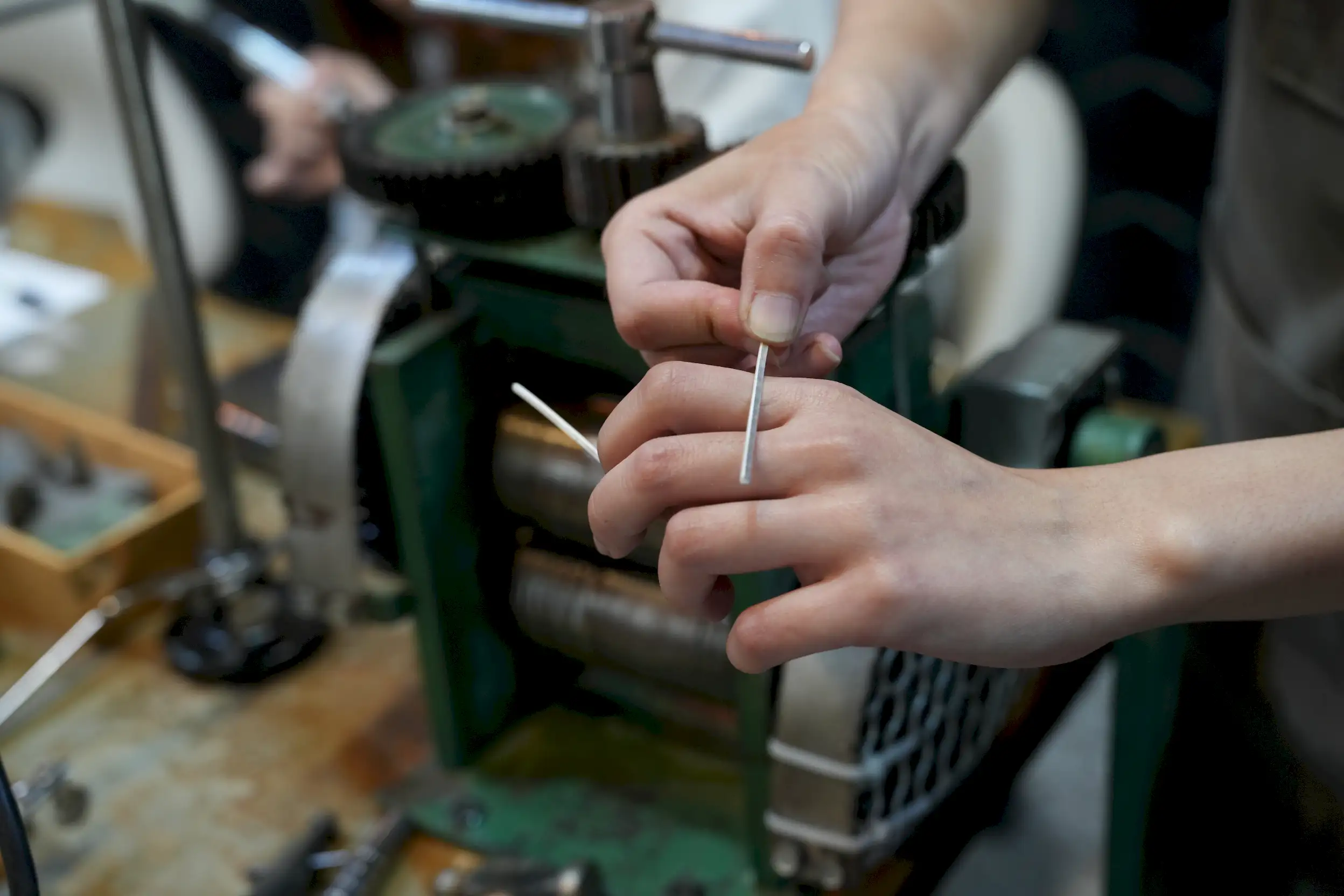 ▼老師先幫我們切下兩段銀條,最開始的銀條是圓柱形的,需要放到壓片機內壓成扁平狀,老師會先操作一次給我們看。