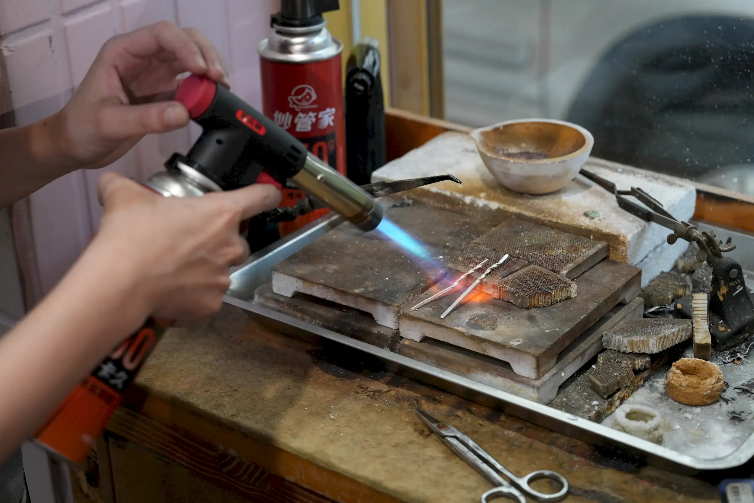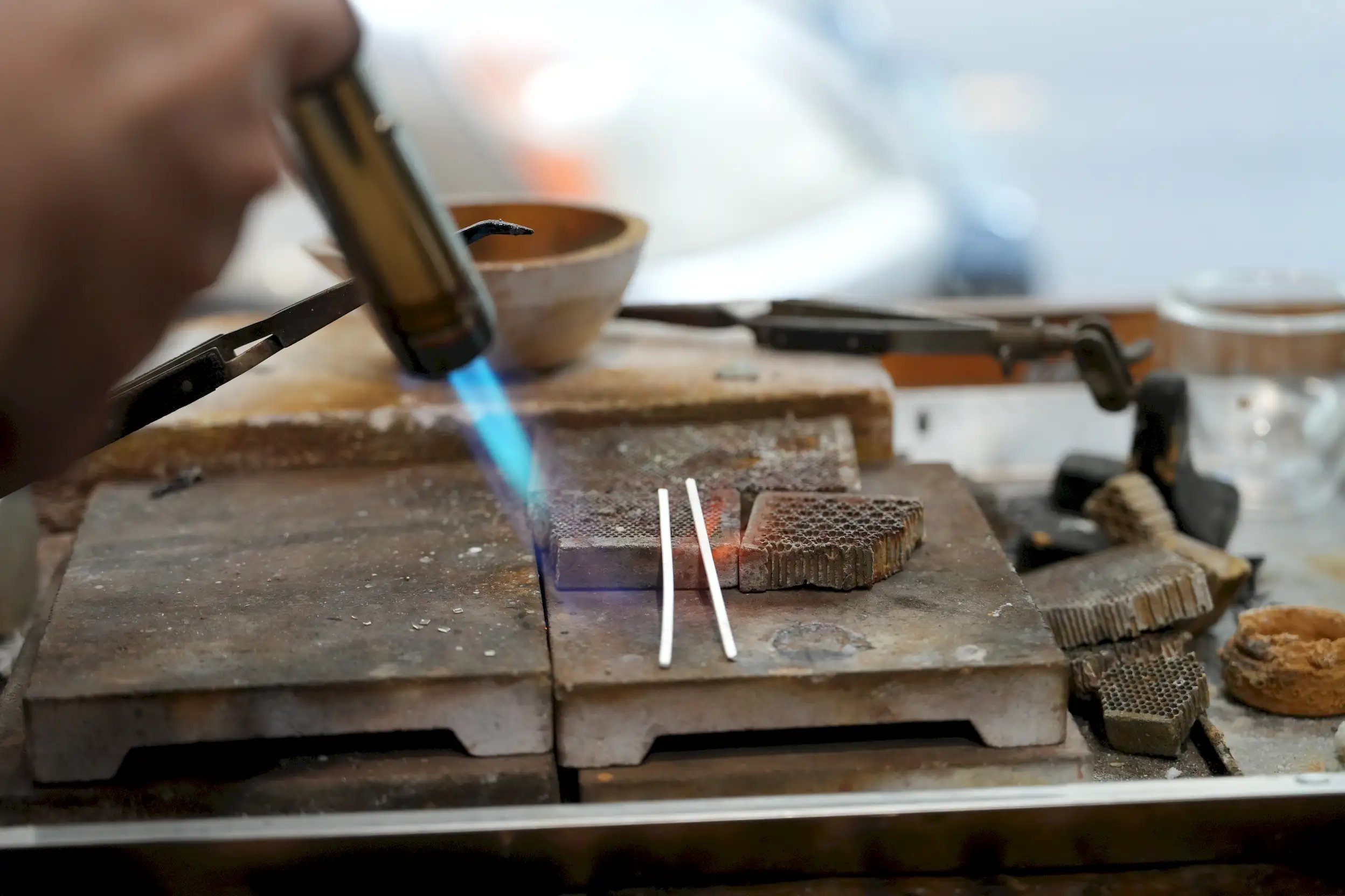 ▼銀條壓平後,老師會先幫我們進行退火,噴槍是由老師操控,我們主要工作就是夾起銀條放進水裡。因為金屬經過壓延後會變硬,如果直接彎曲很容易裂開,所以需要用噴槍加熱,讓銀條恢復延展性,退火完成後,金屬會變得比較柔軟,也比較好塑形。