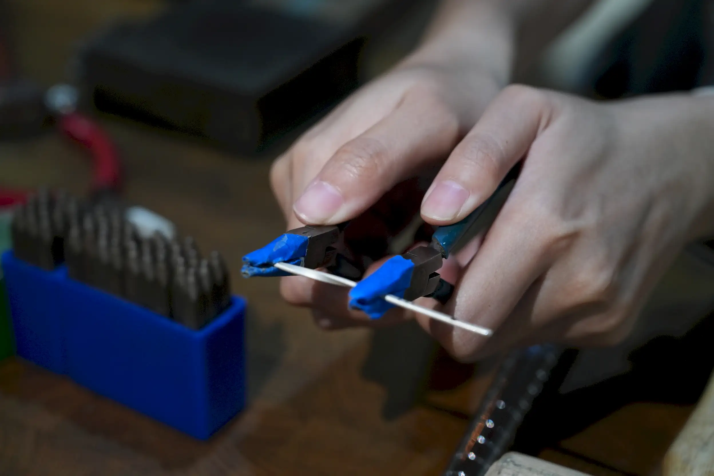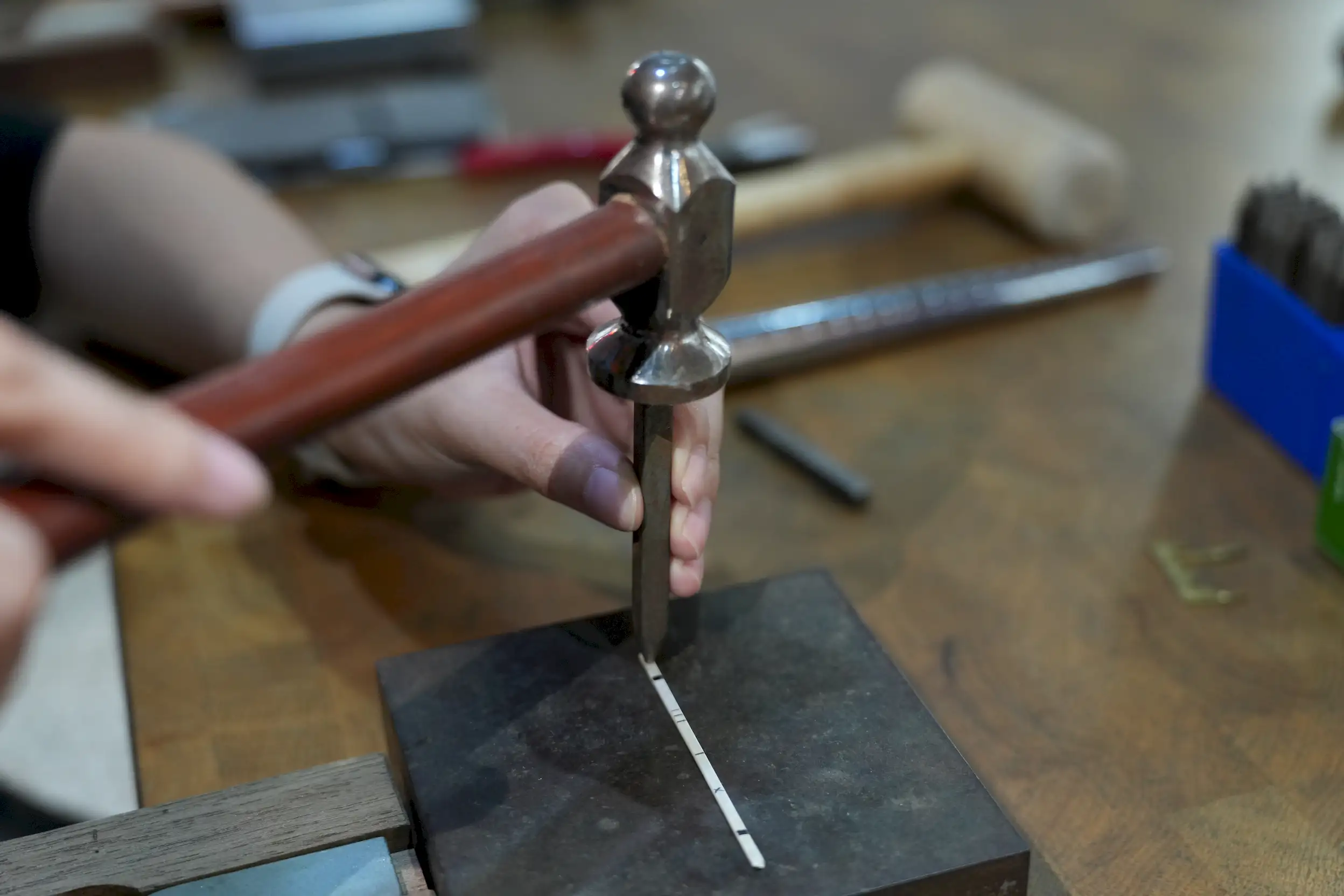 ▼接下來老師會幫我們在銀條上用麥克筆作記號,告訴我們敲字的位置、扭轉的範圍、裁掉的部分,真的是非常新手友善,盡量減少失誤的可能性,因為銀條多的部分會裁掉,所以可以先在裁掉的部分練習敲字,熟悉銀條硬度,掌控合適的力道。