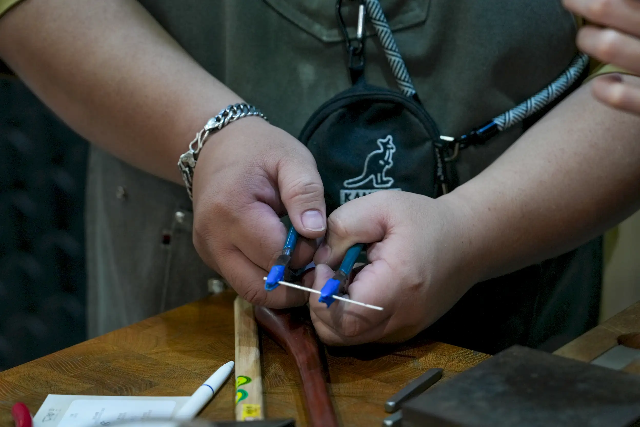 ▼費盡千辛萬苦終於把多餘的部分鋸掉後,接著就要進行焊接,焊接前需要先塗上助焊劑(硼砂),再把小小的焊片放在接縫處,焊片真的超迷你,一不小心就會掉下去或歪掉,好不容易才把它準確放在焊接點上,看著火焰慢慢讓焊片融化、流進接縫裡,瞬間有種欣慰感,謝謝老師的耐心指導,看我笨手笨腳的也會想辦法幫我。