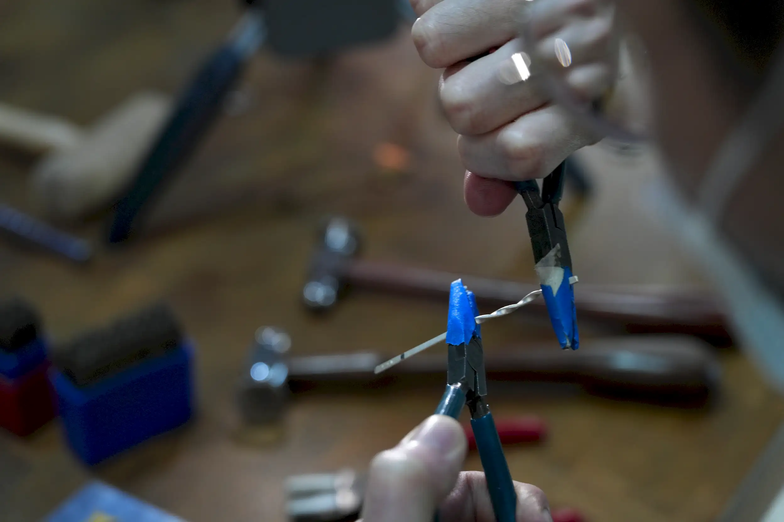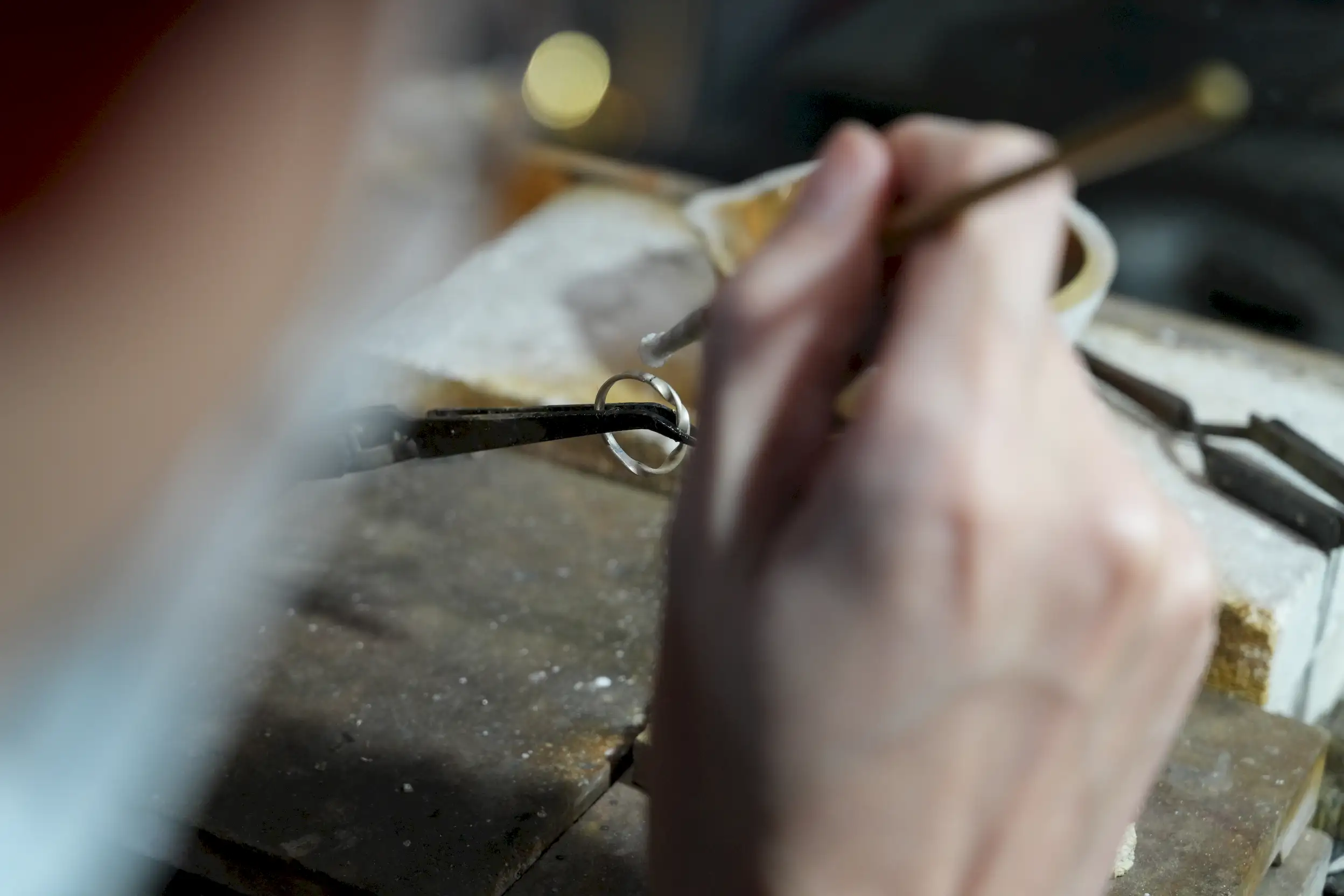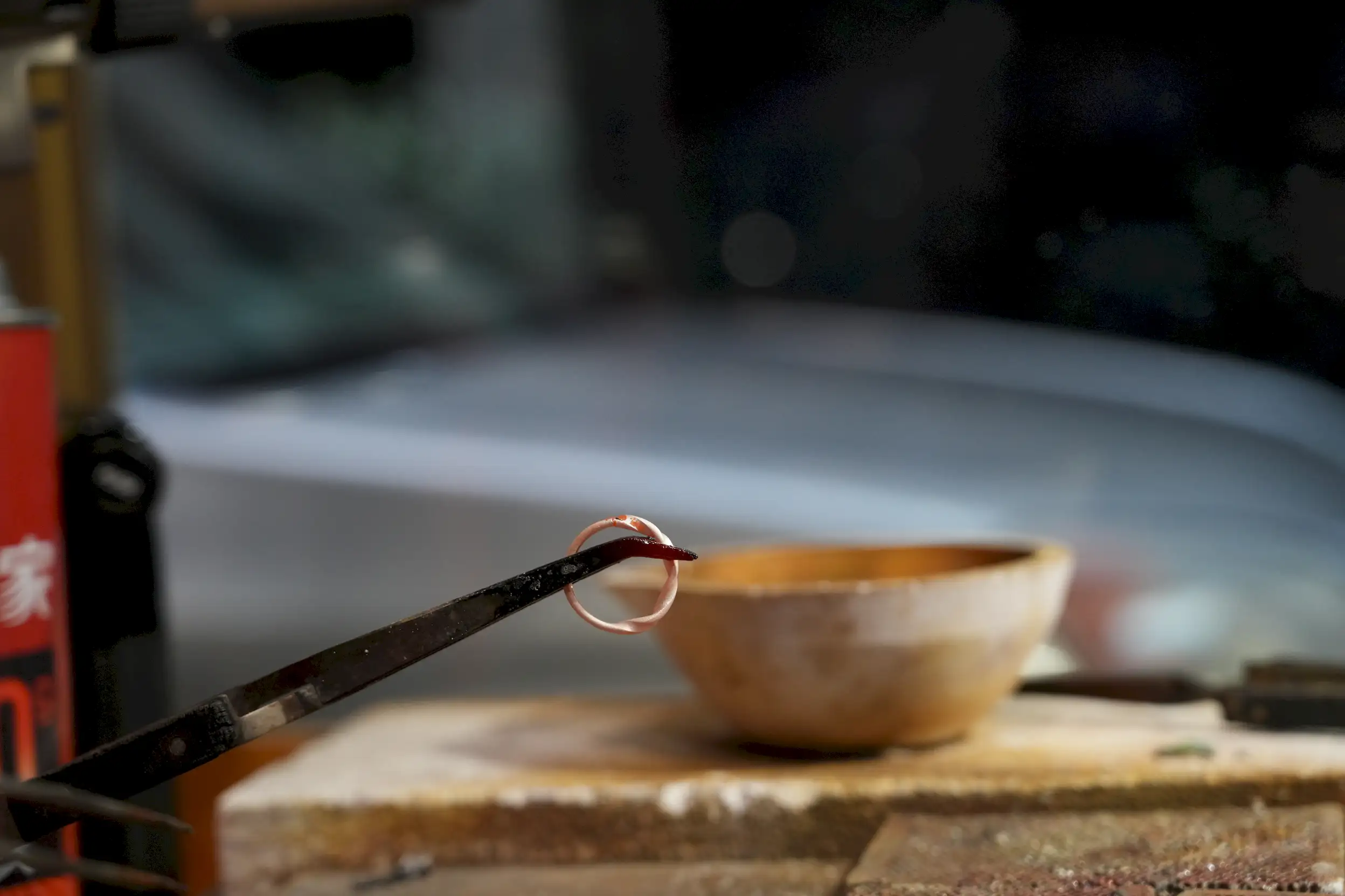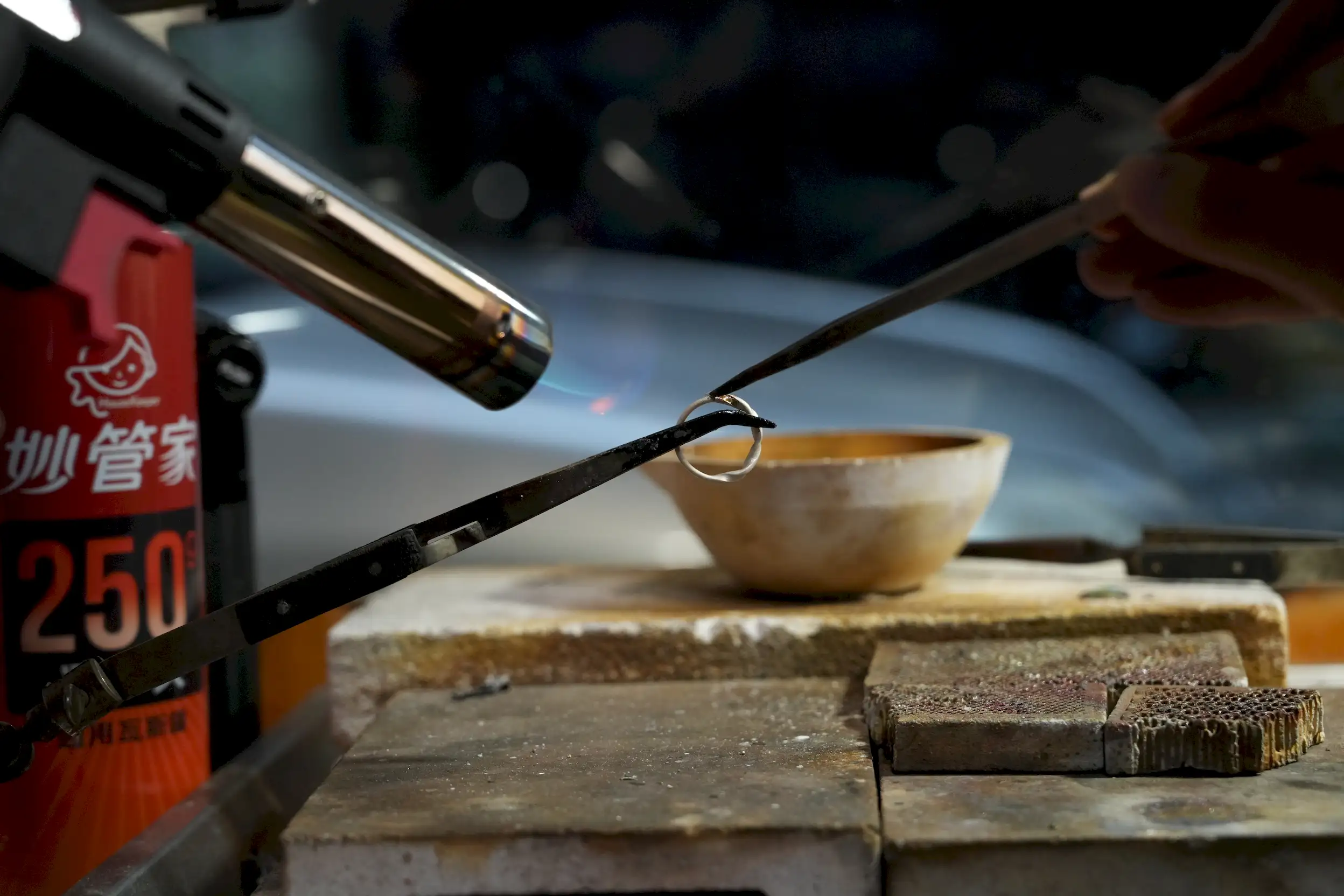 ▼終於成功焊接完成,被高溫加熱後呈現出淡淡的火紅色,看起來有種奇異的美感,因為焊接後銀會氧化變黑,所以還需要放進酸性溶液(明礬水)裡清洗,清洗後戴到手上,真的有滿滿的成就感,不過這可還沒完成,還要繼續接著打磨拋光才可以。