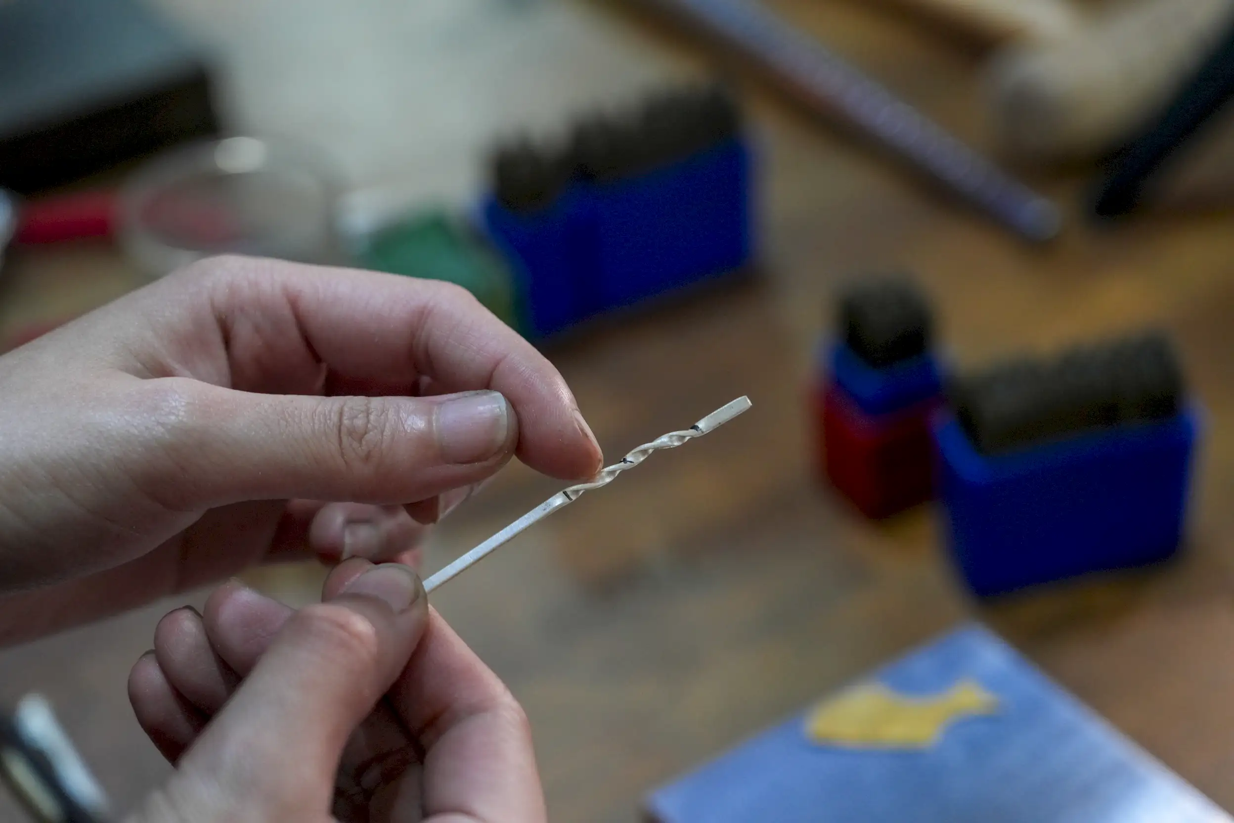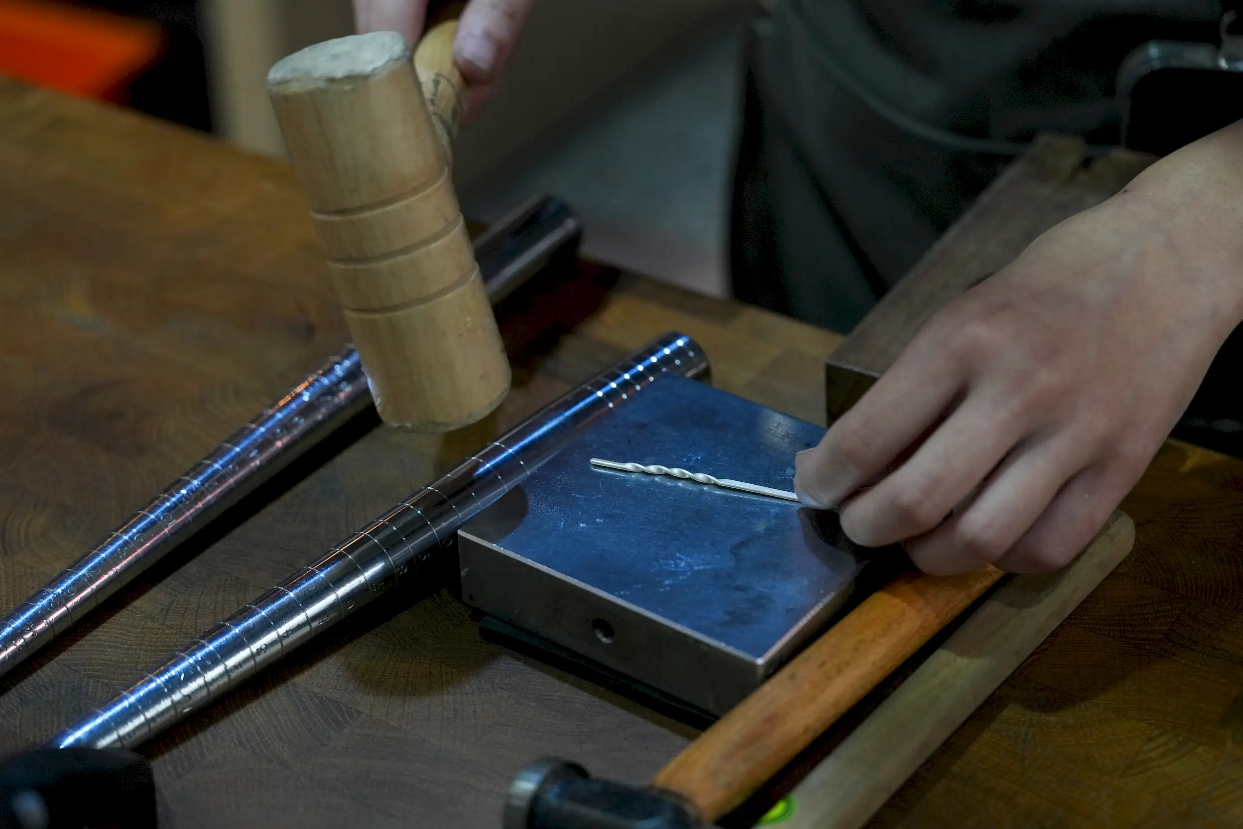 ▼銀條扭轉後也會出現「加工硬化」,所以需要再退火一次,讓金屬恢復延展性,若是跟朋友一樣要鑲鑽,就會鑲在扭轉後的凹槽中間。