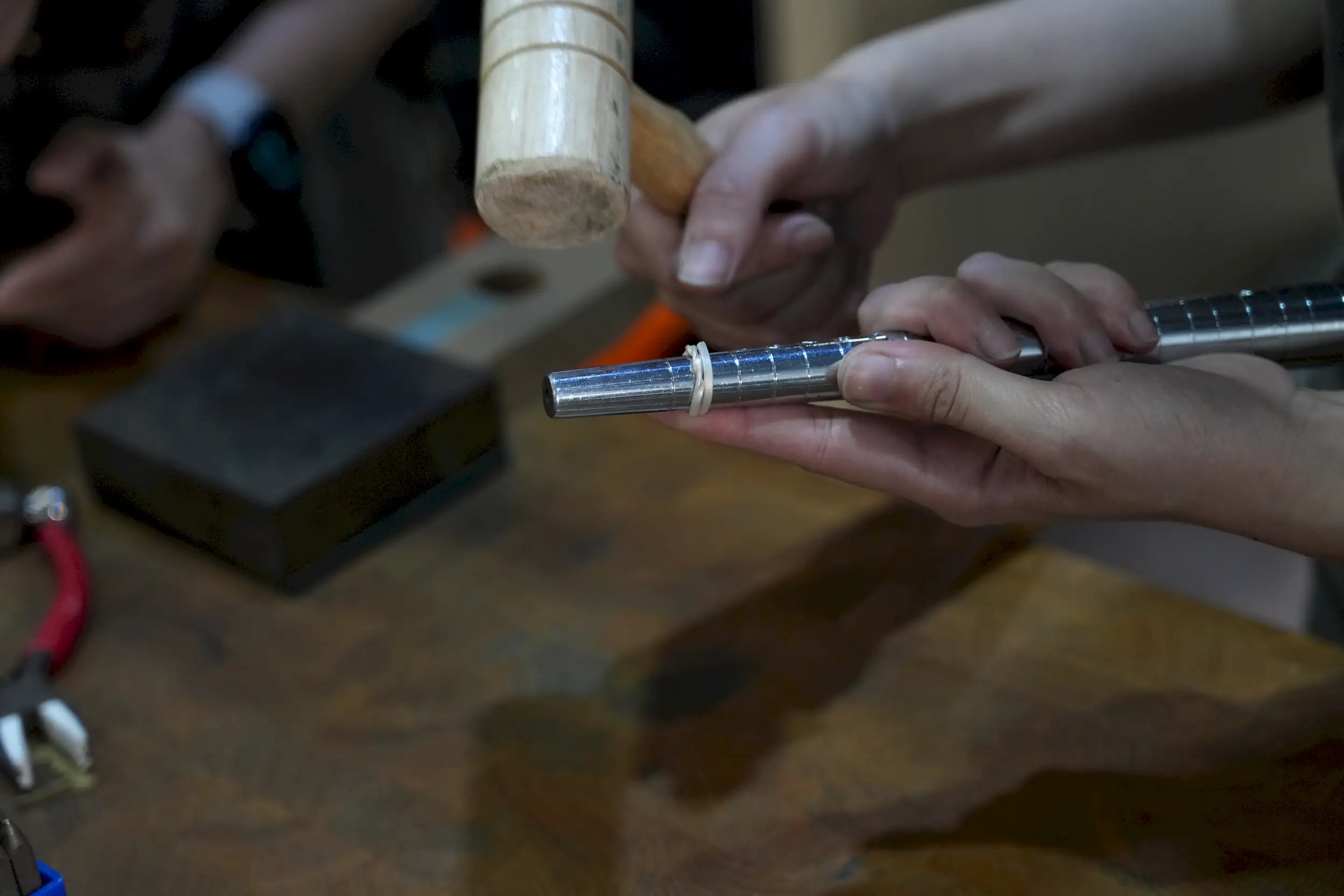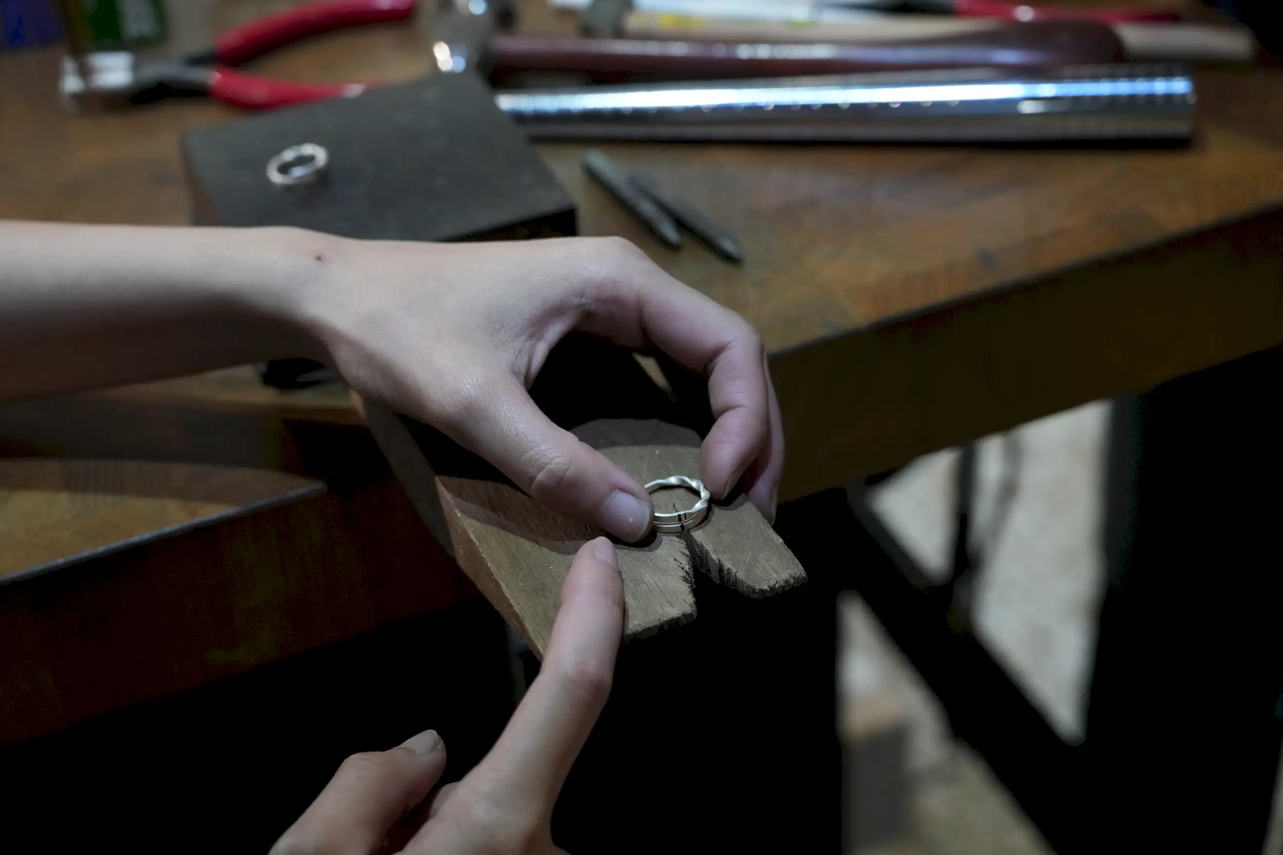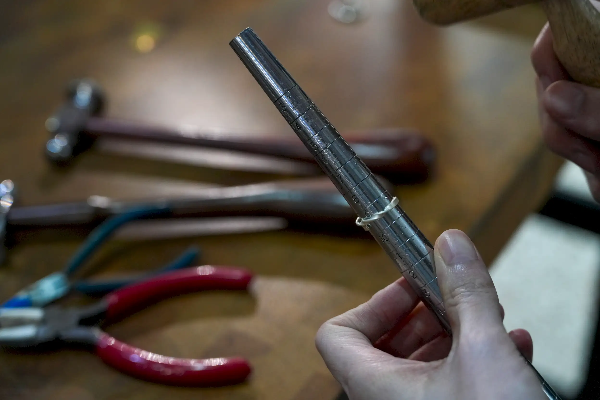 ▼一邊往下敲打一邊調整,讓戒指慢慢調整到合適的戒圍,可以先確認尺寸是否合適,如果不小心敲太大了也沒關係,老師會隨時支援,讓戒指回到合適的大小。