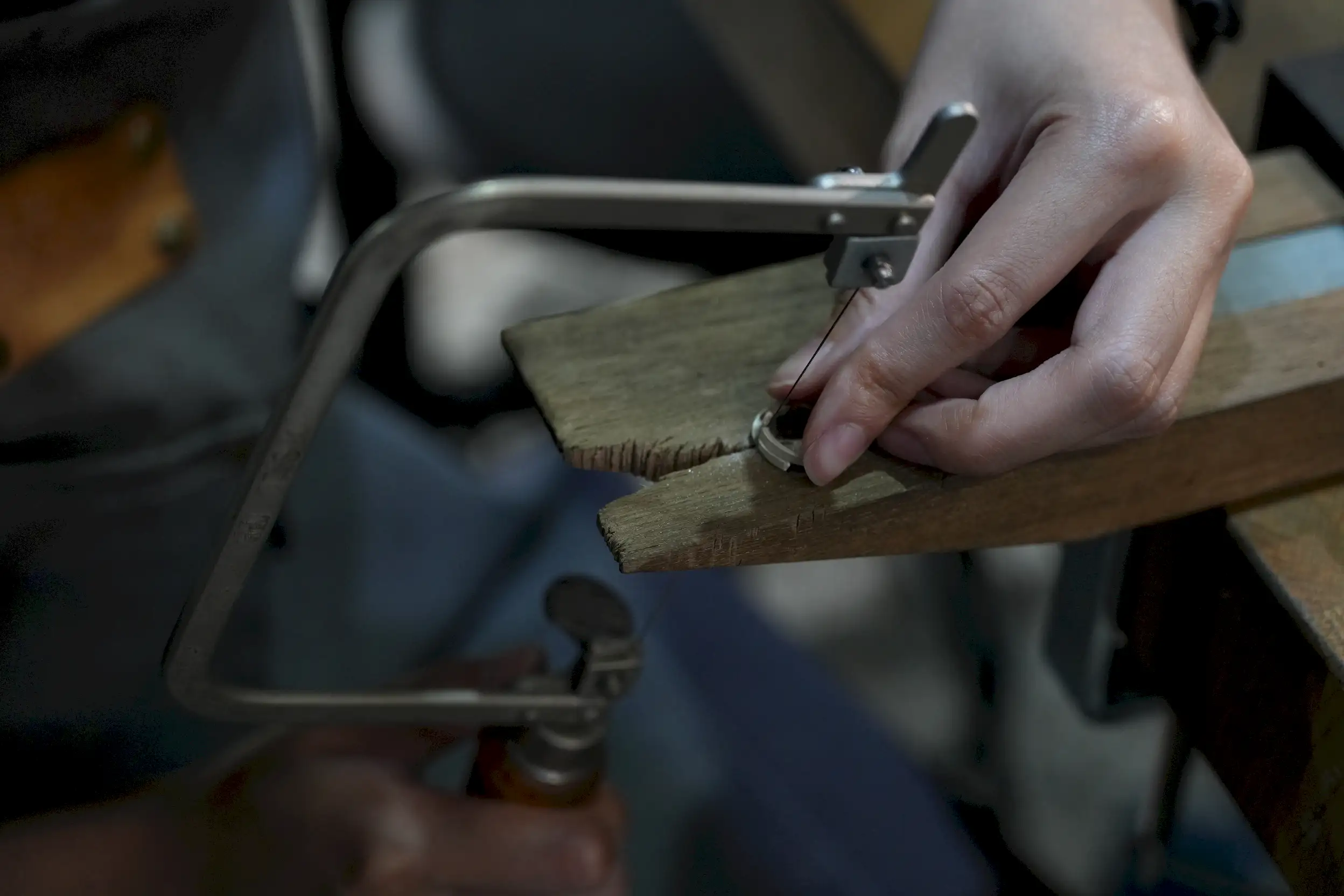 ▼確認戒圍後,就可以用線鋸弓將多餘的部分切掉了,老師會依照之前的記號先鋸一點,再讓我們接手繼續鋸下去,避免有鋸歪的狀況發生,手指要小心壓好,用一個像C型的手勢,才不會鋸到手,但實際鋸的時候,真的很難固定,尤其是快斷掉時,特別不好固定,超怕鋸到手,大家在鋸的時候不要心急,慢慢來就好了,老師都很有耐心。