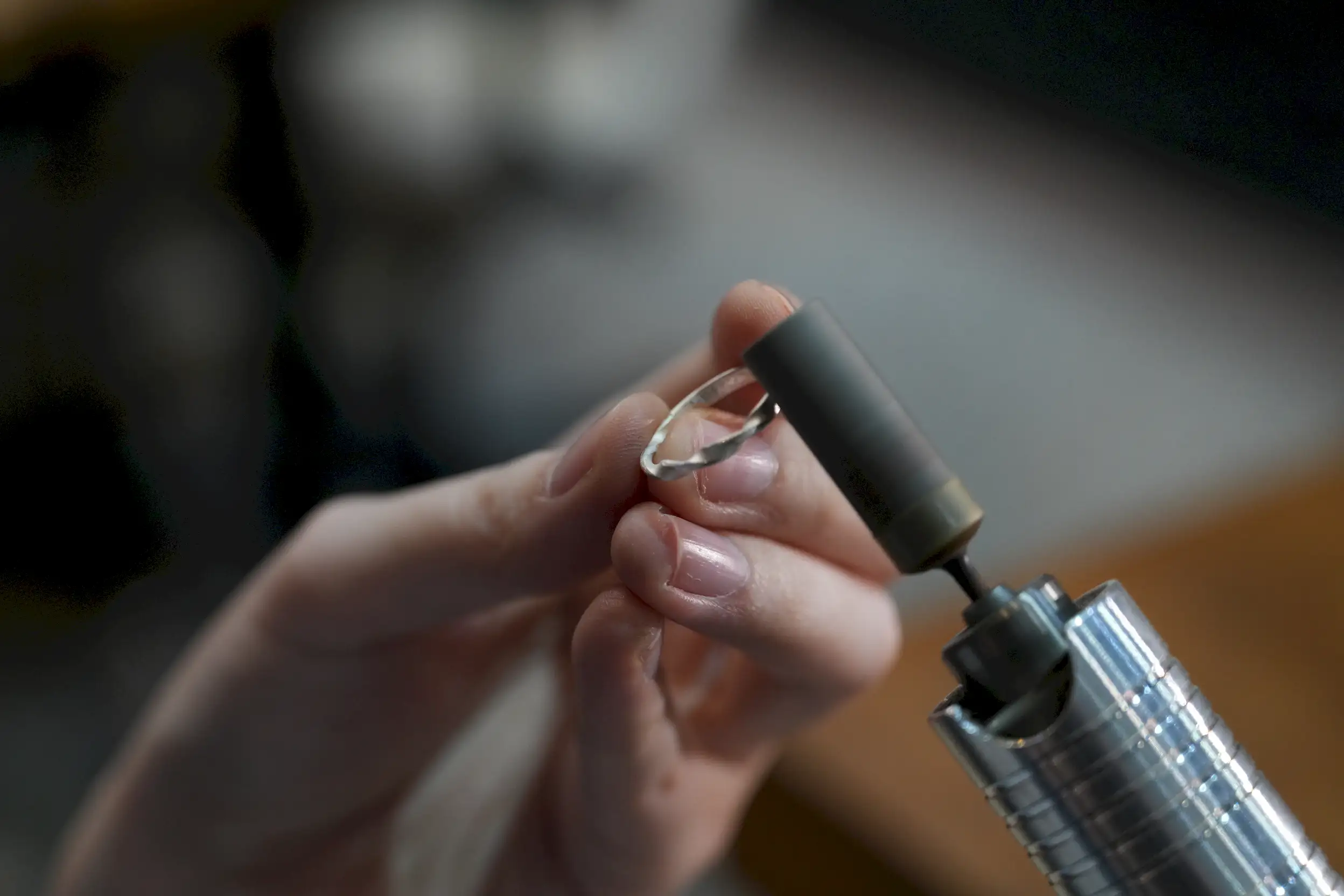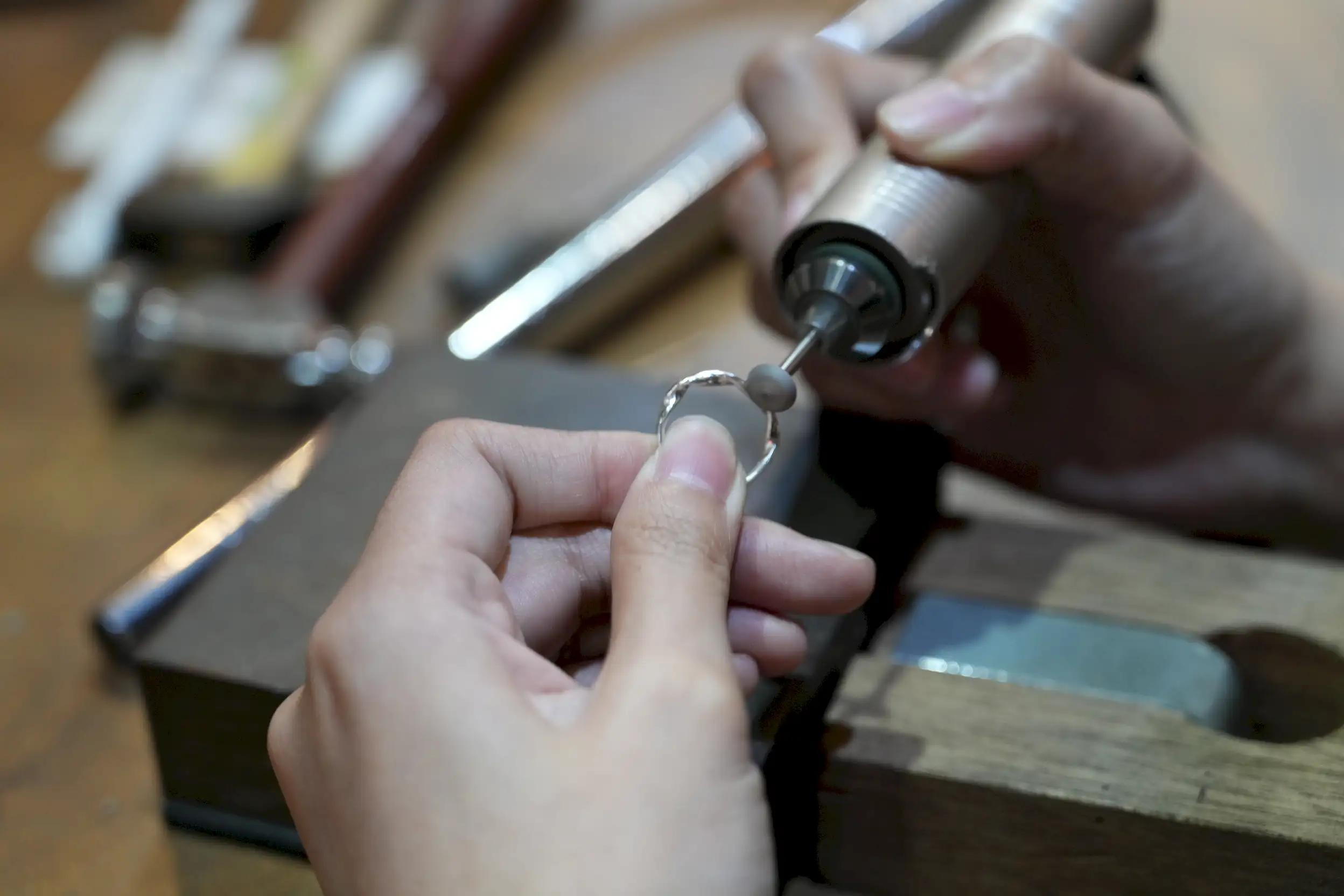 ▼接著使用吊磨機打磨戒指,並搭配不同目數的砂輪磨頭,小編親身嘗試手指被磨到並不會痛,大家可以放心去做戒指。會先用較粗的磨頭修整,把接縫處多餘的銀料磨平,並將邊角打磨得更圓潤;再換成較細的磨頭,讓戒指表面更加平滑,最後進行拋光,就會呈現出我們常見的亮面質感。