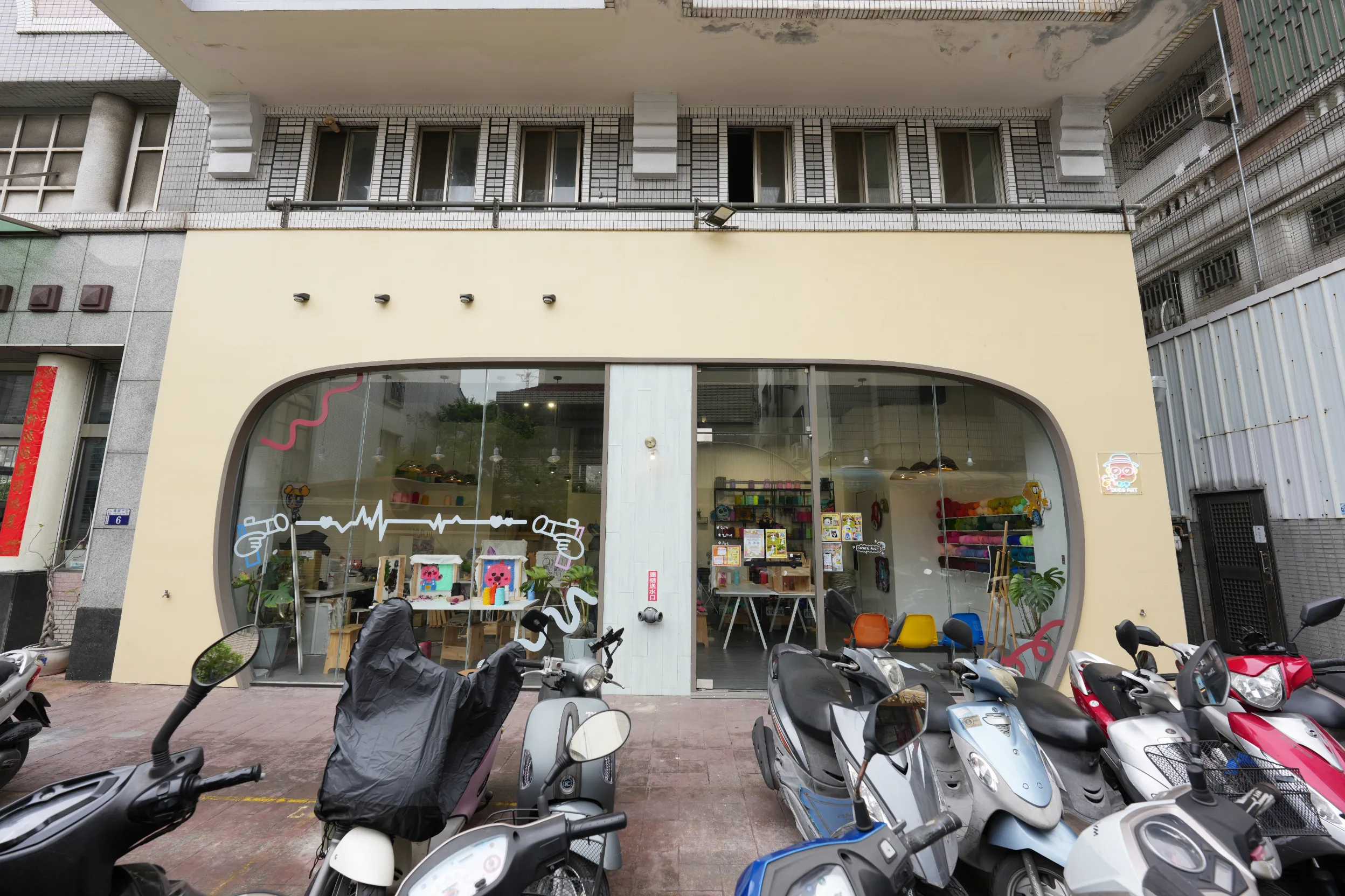 ▼「Does Art 都是藝術」台中總店從門口看是一間可愛白色系手作店,整間店都是落地玻璃窗非常通透,從外面就可以看到教室牆上有滿滿的毛線球,空間大約可容納20人。