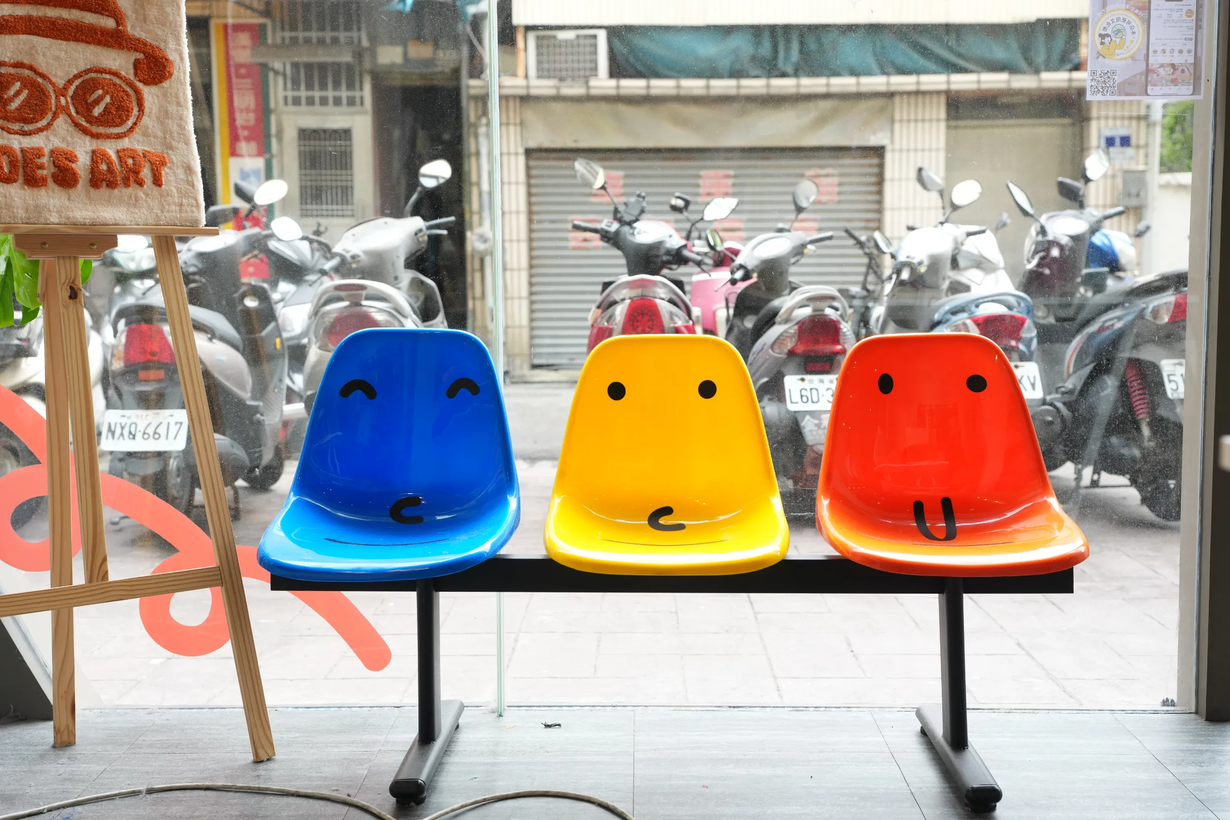 ▼門口擺著一排可愛的三色椅子,增添了溫馨又活潑的氛圍;左側的畫架則特別設計給大家展示地毯作品拍照使用,隨手一拍都像藝術照般好看。