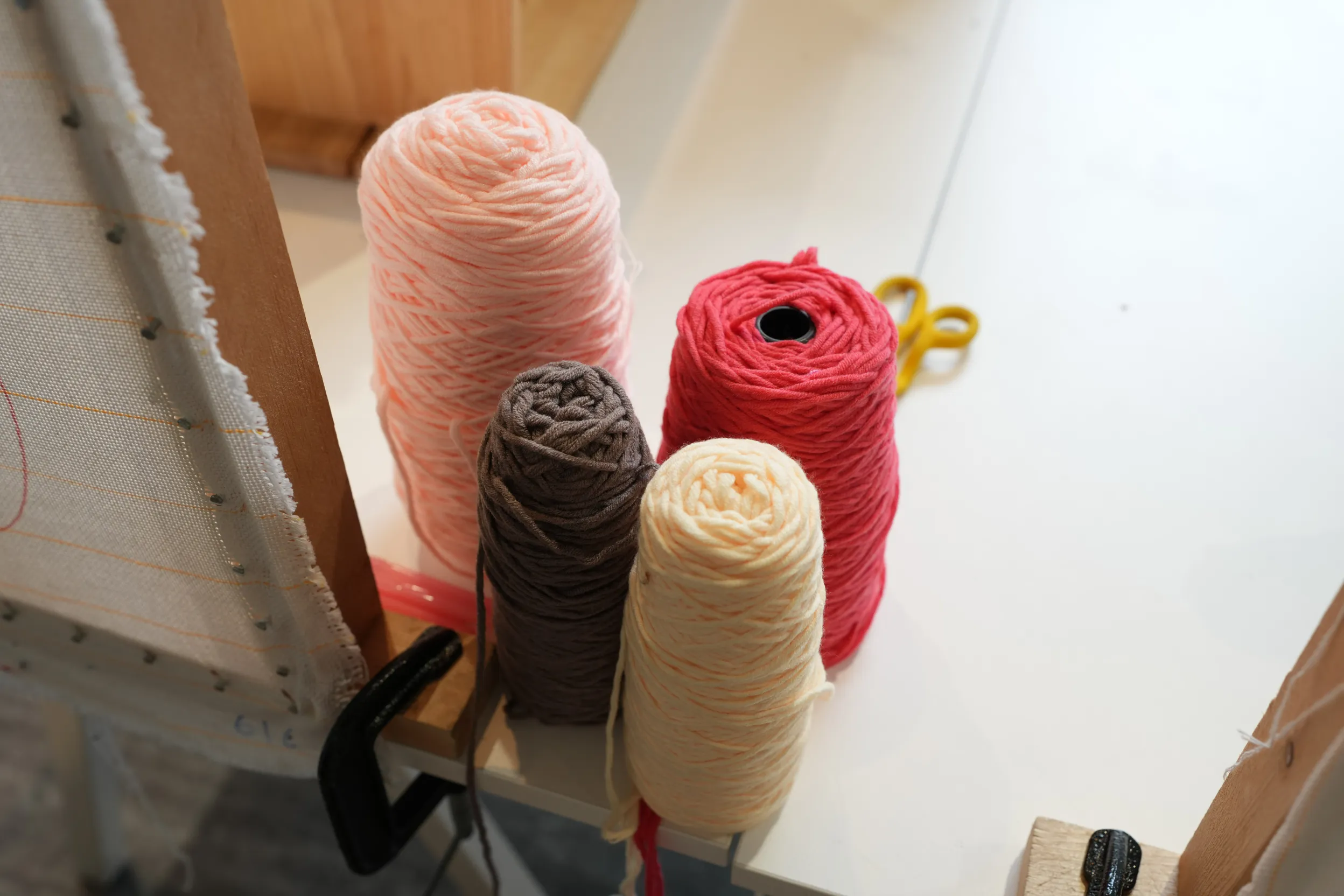 ▼先挑選製作地毯所需的毛線顏色,牆上一整面繽紛的毛線任你選擇,選定喜歡的色系後,再將毛線拿到自己的座位旁放好,準備開始創作屬於自己的地毯作品。