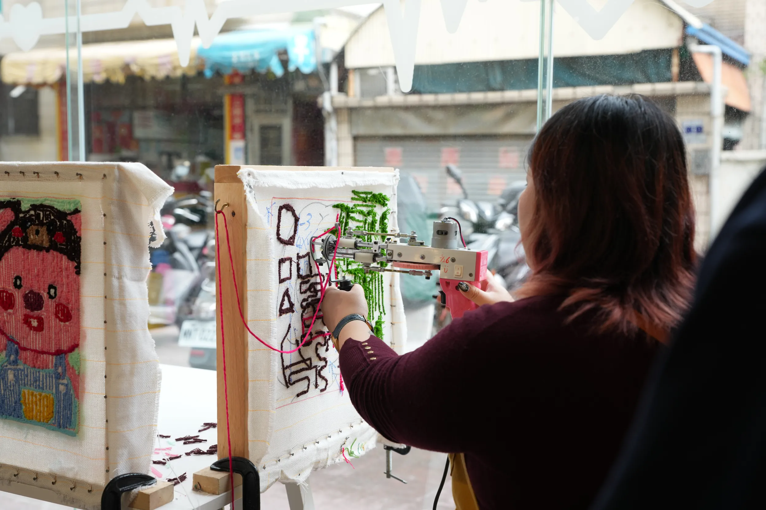 ▼老師示範簇絨時的基本手法,從最基礎的直線開始,再到需要控制手感的曲線與圓圈,每一種線條的速度與角度都略有不同。透過老師細心講解與示範,可以觀察到毛線在布面上如何自然貼合、密度如何控制。