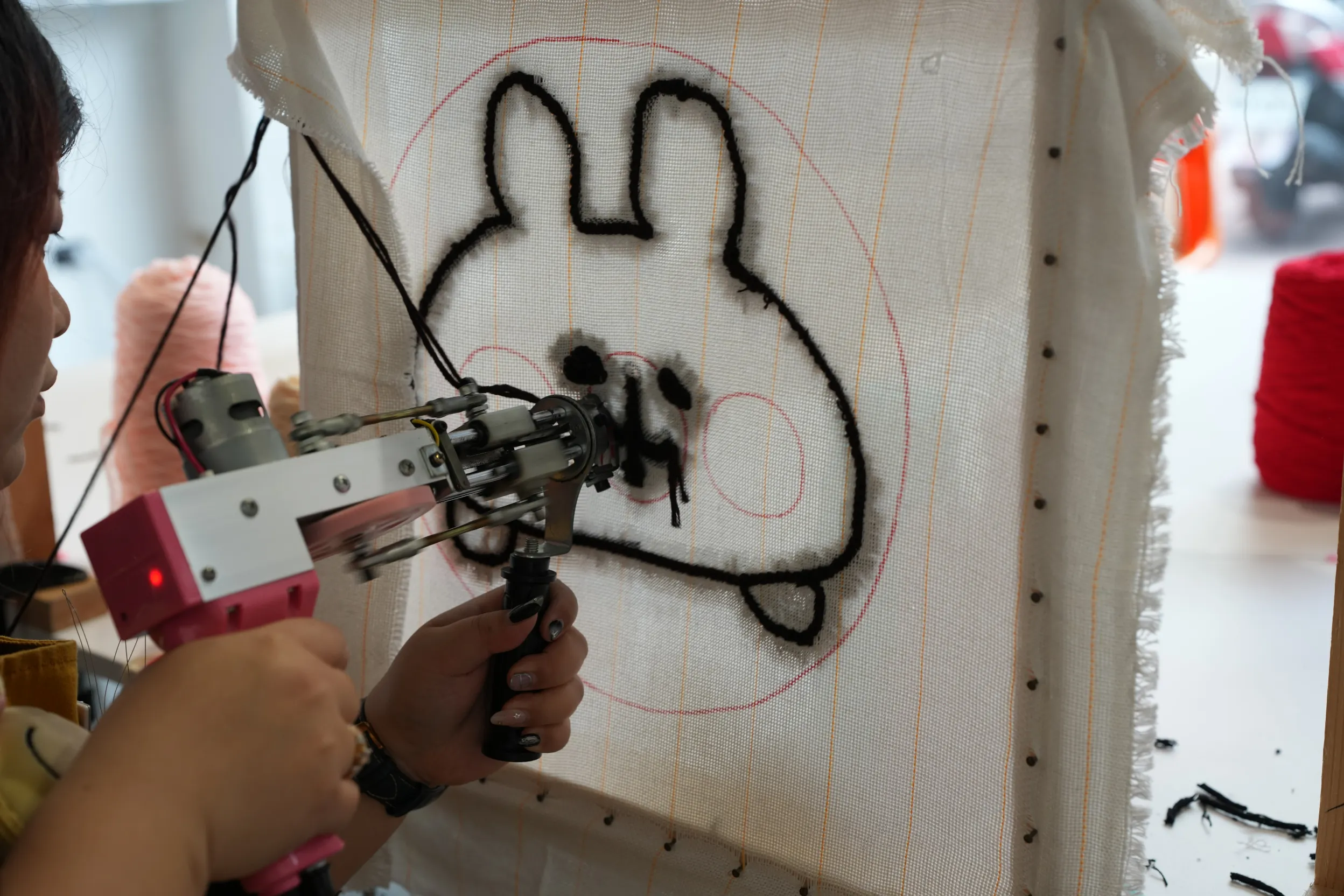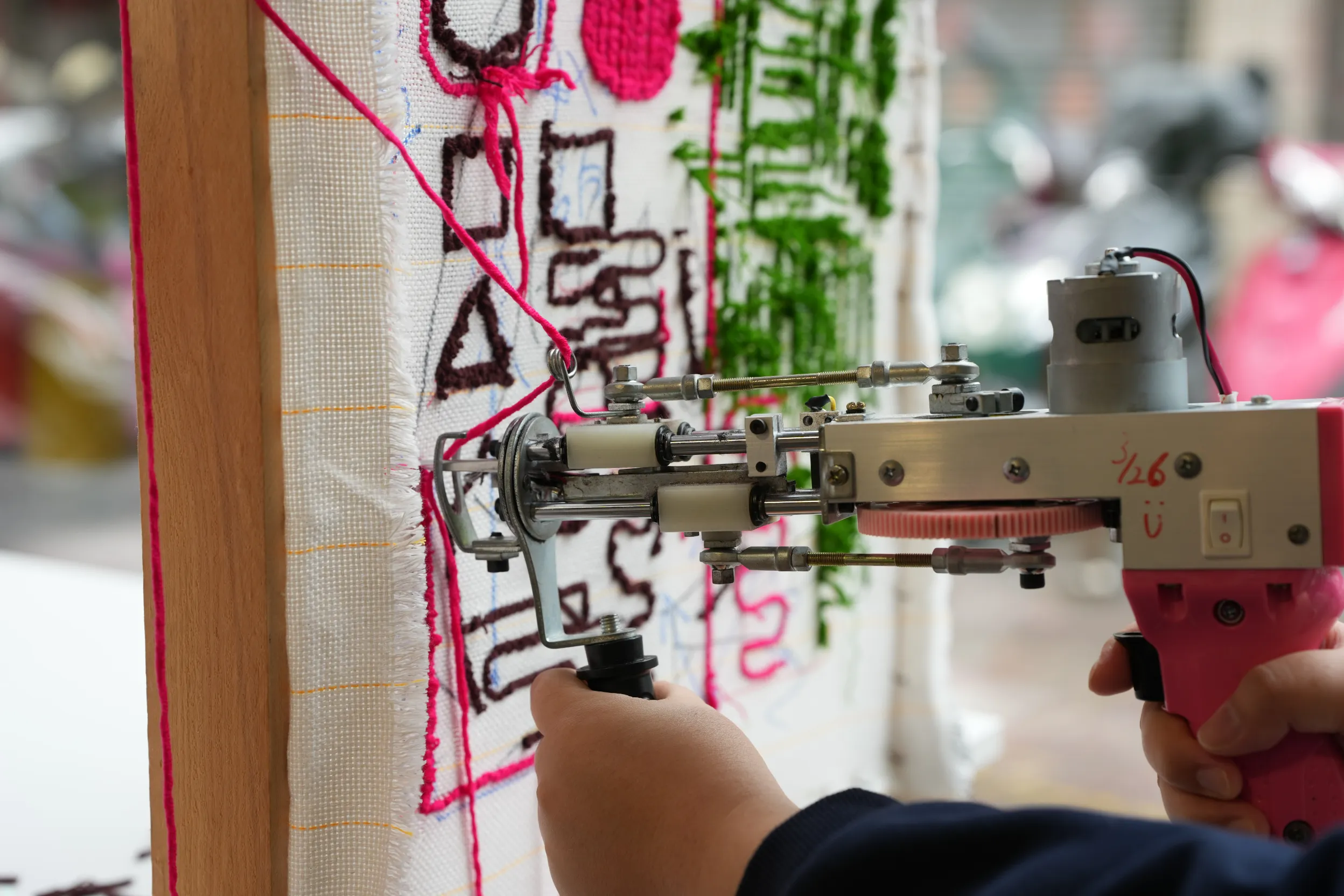 ▼示範結束後,輪到我們親自上手操作簇絨槍。我第一次拿起簇絨槍時,因為手勢還不熟練,打在布面上的線條有些晃動、不太平整。老師隨即幫我調整姿勢,並提醒要讓簇絨槍緊貼布面操作,這樣線條才會穩定又漂亮。慢慢練習不同的線條走向,可以感受到從空白畫布逐漸變成地毯作品的成就感與樂趣。