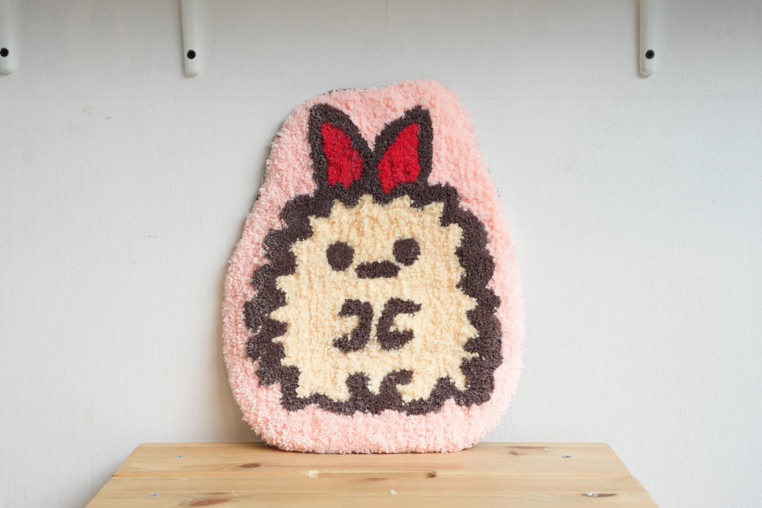 ▼這是炸蝦寶寶地毯正面的樣子,可以看到滿滿的毛線鬚,密密麻麻地堆疊著,呈現出作品的立體感與厚實度,也是手作地毯獨有的細節特色。