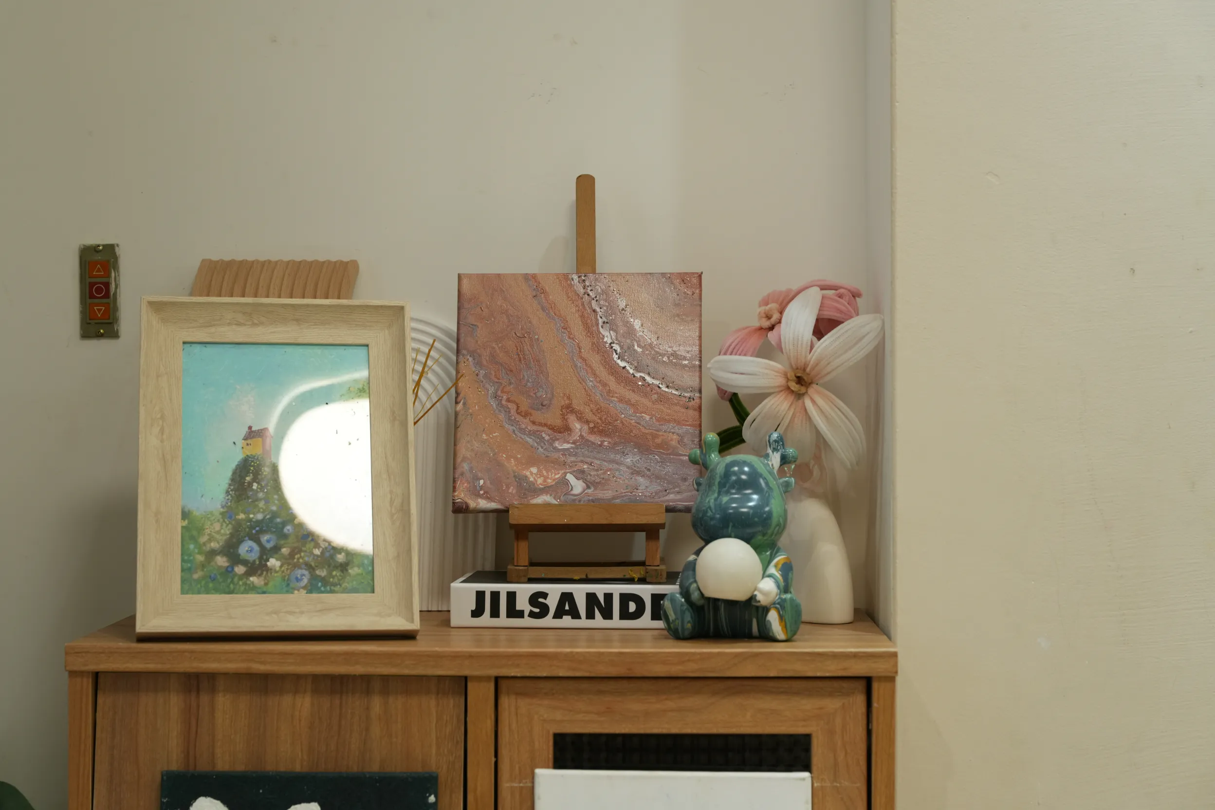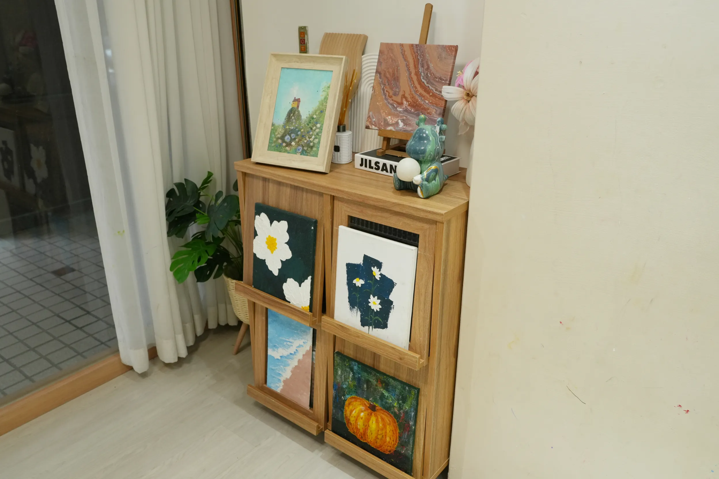 ▼畫室裡的櫃子上擺滿了各式流體畫與流體熊作品,整個空間多了一份活潑的藝術氣息。