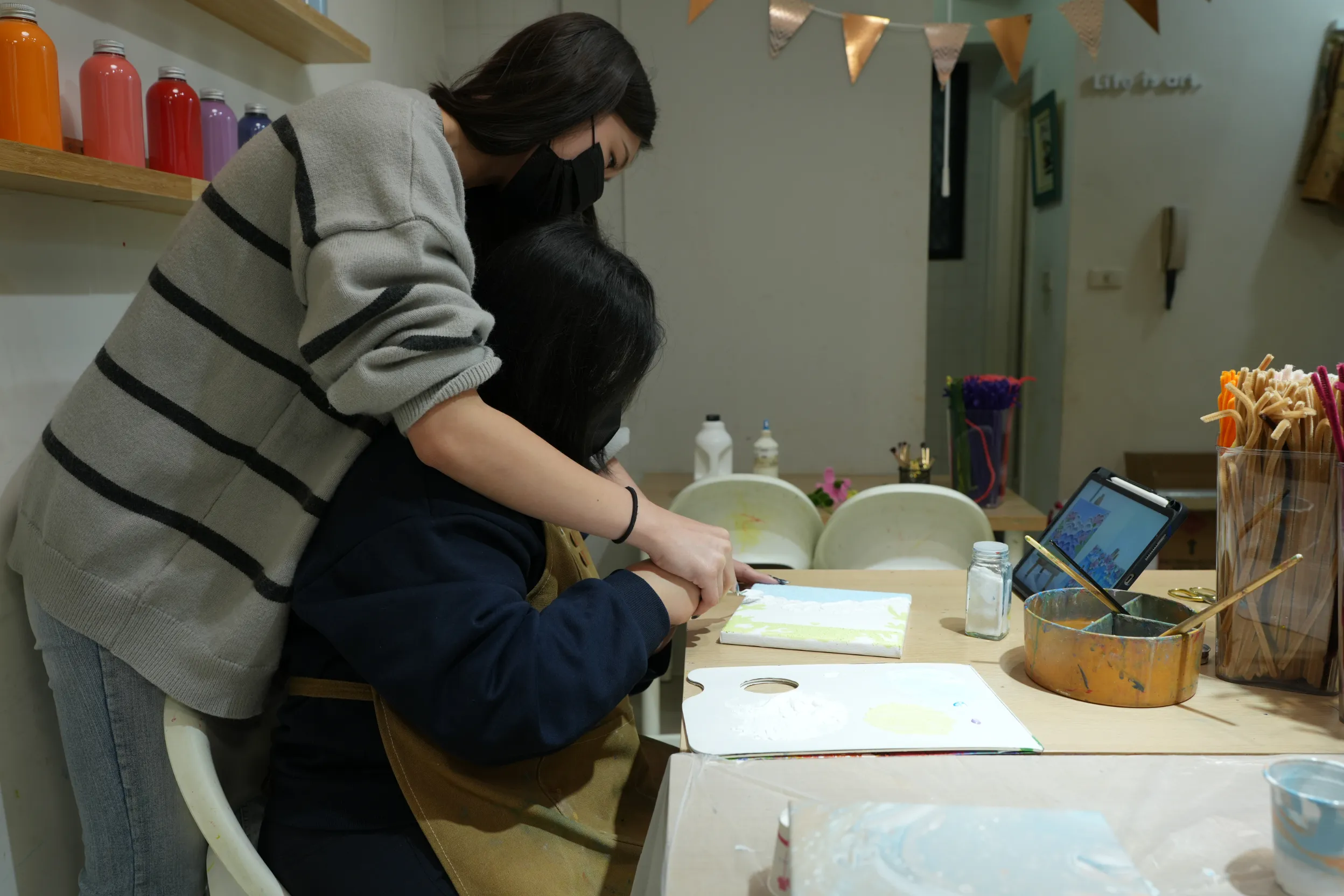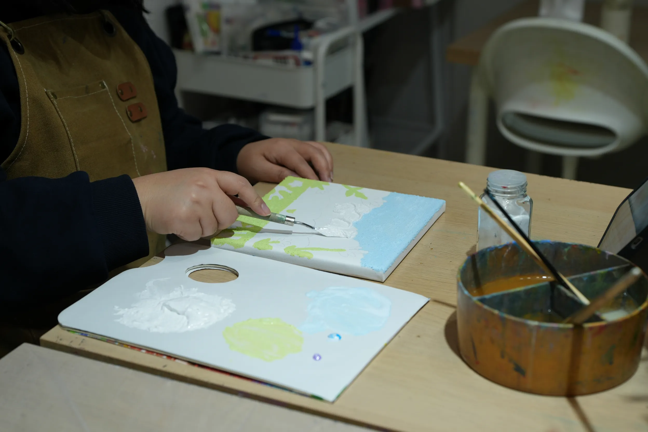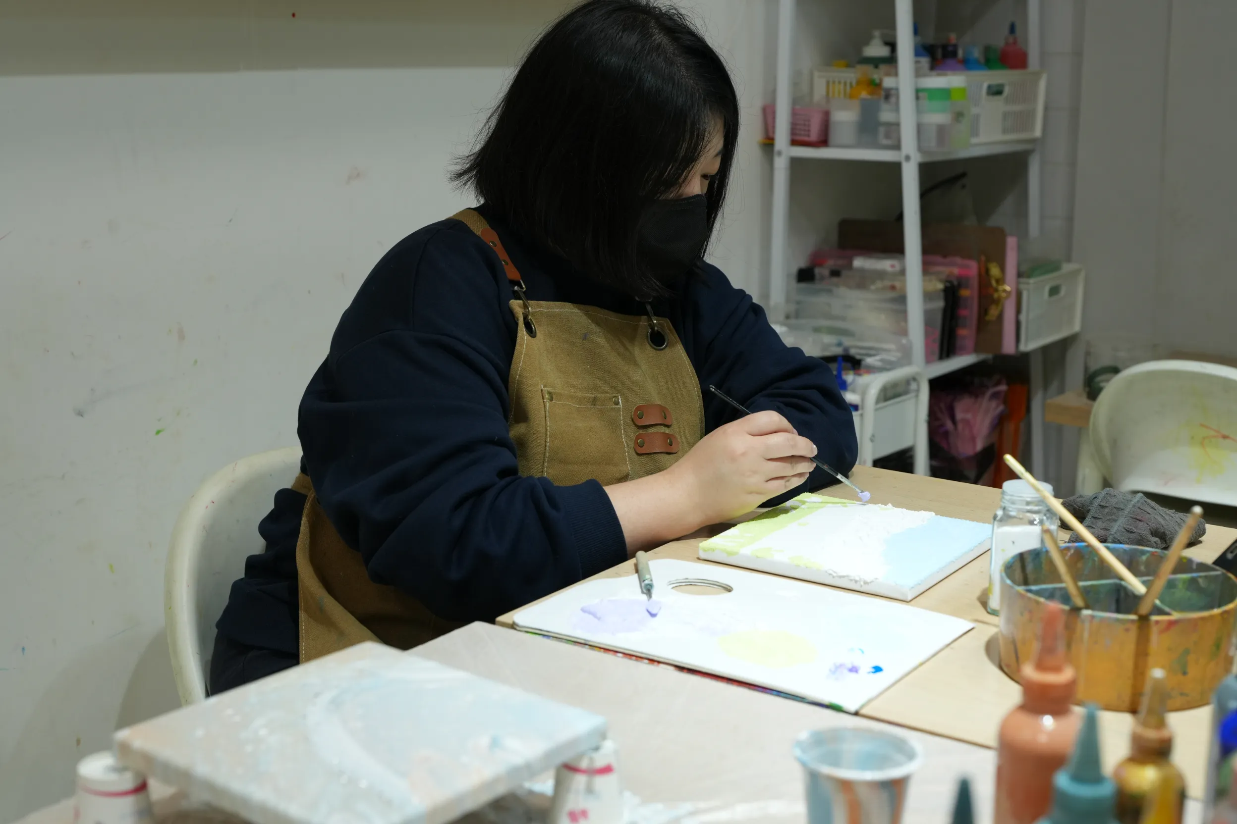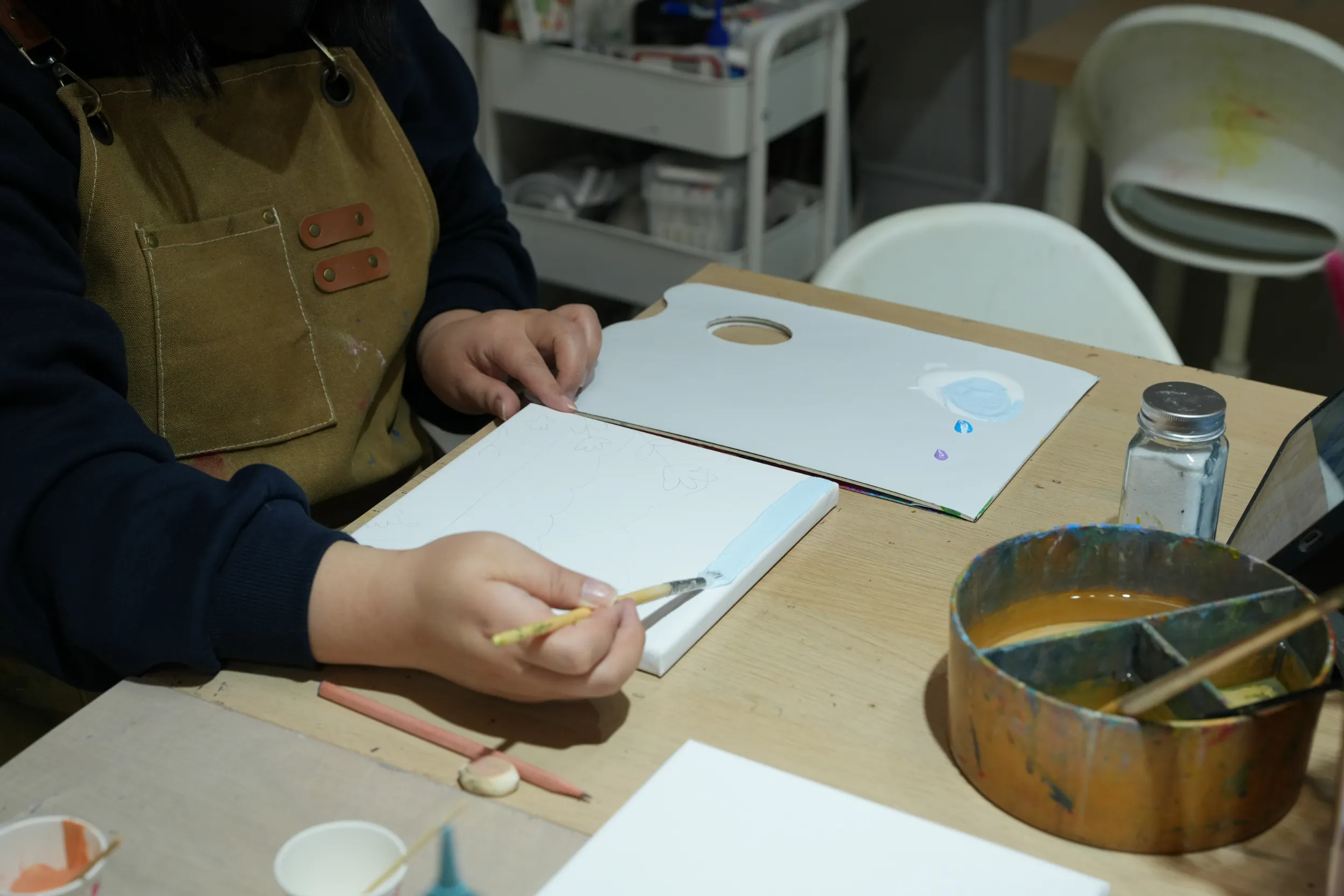▼老師會提供圍裙,讓學員在創作過程中不必擔心弄髒衣服,可以更專心投入做畫。