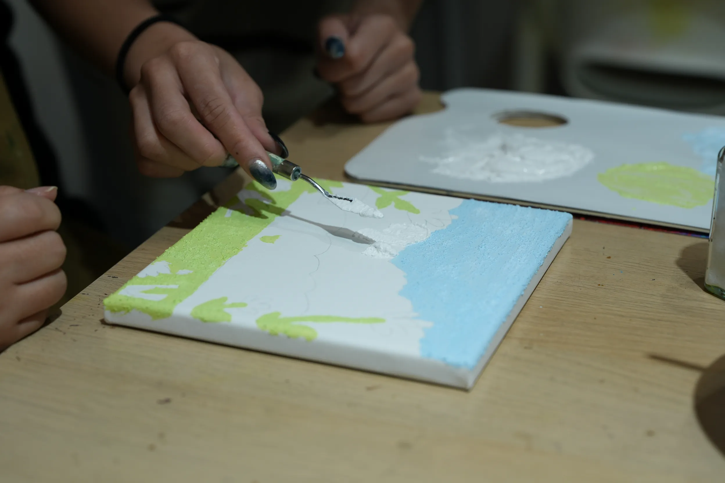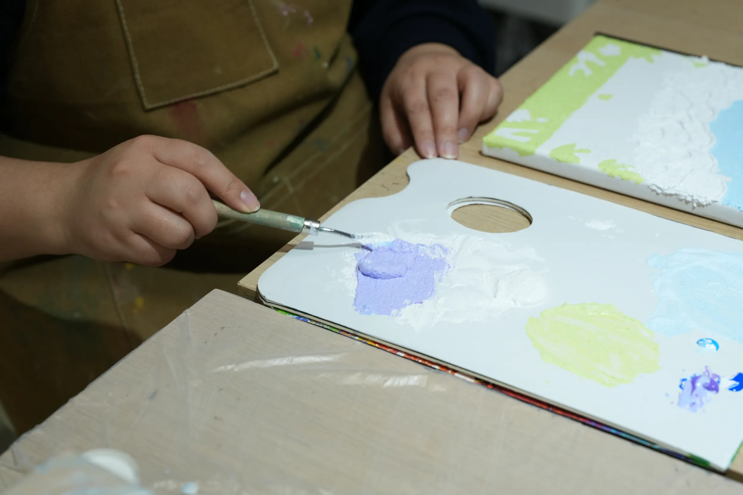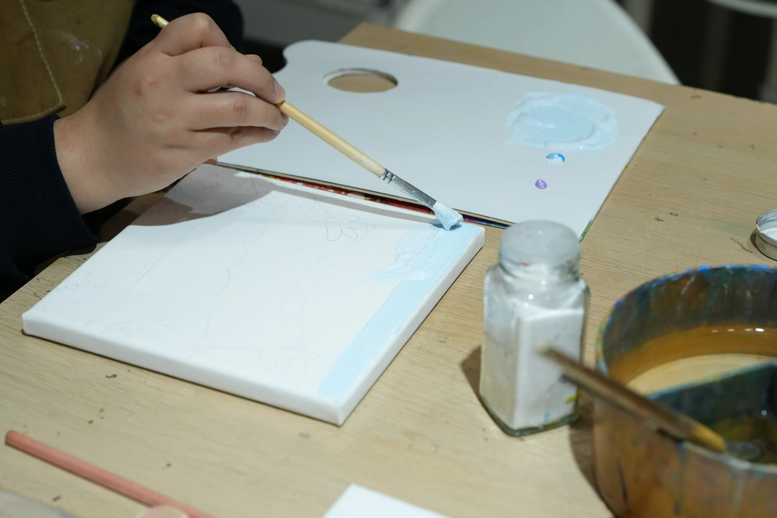 ▼畫好輪廓後,老師會協助擠出壓克力顏料並進行調色,接著建議我從畫面的遠景開始逐步上色,讓整體層次更自然。