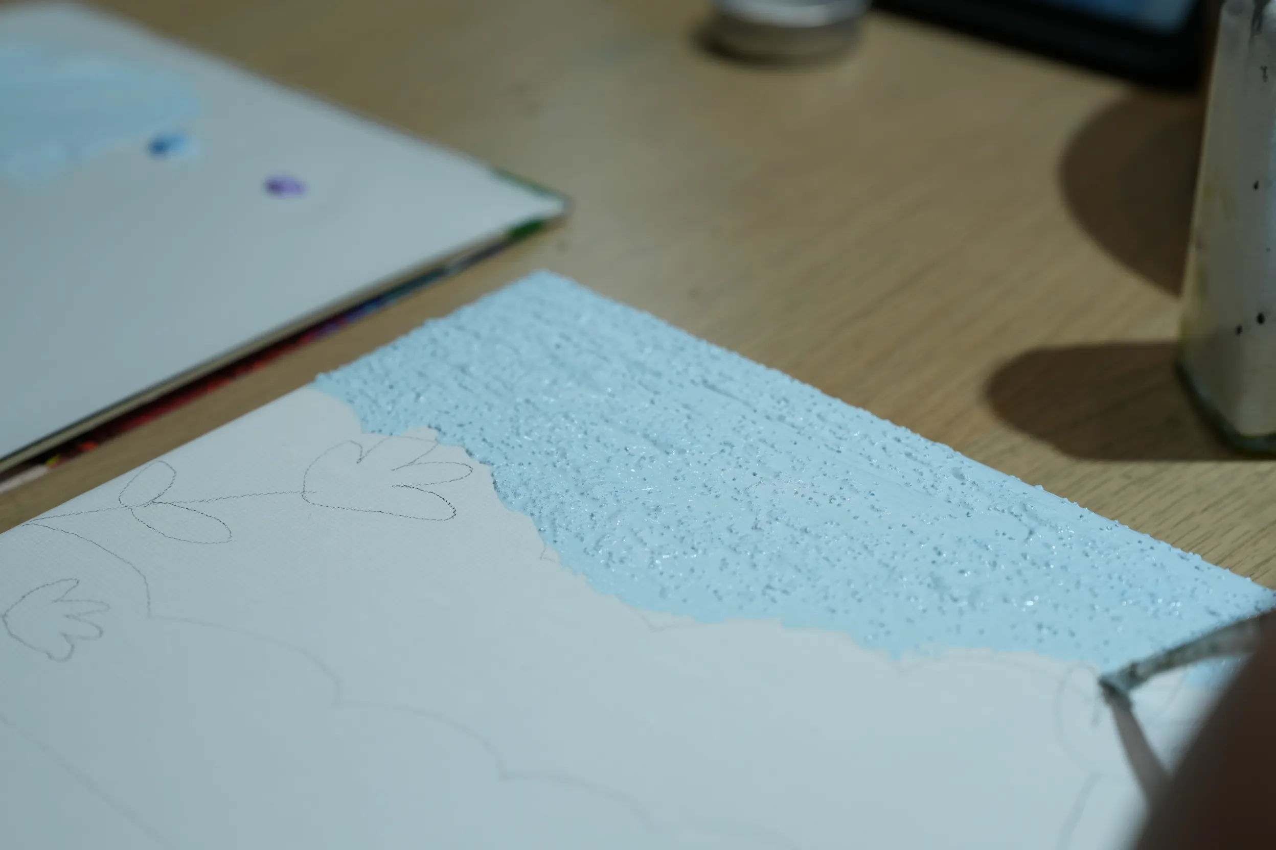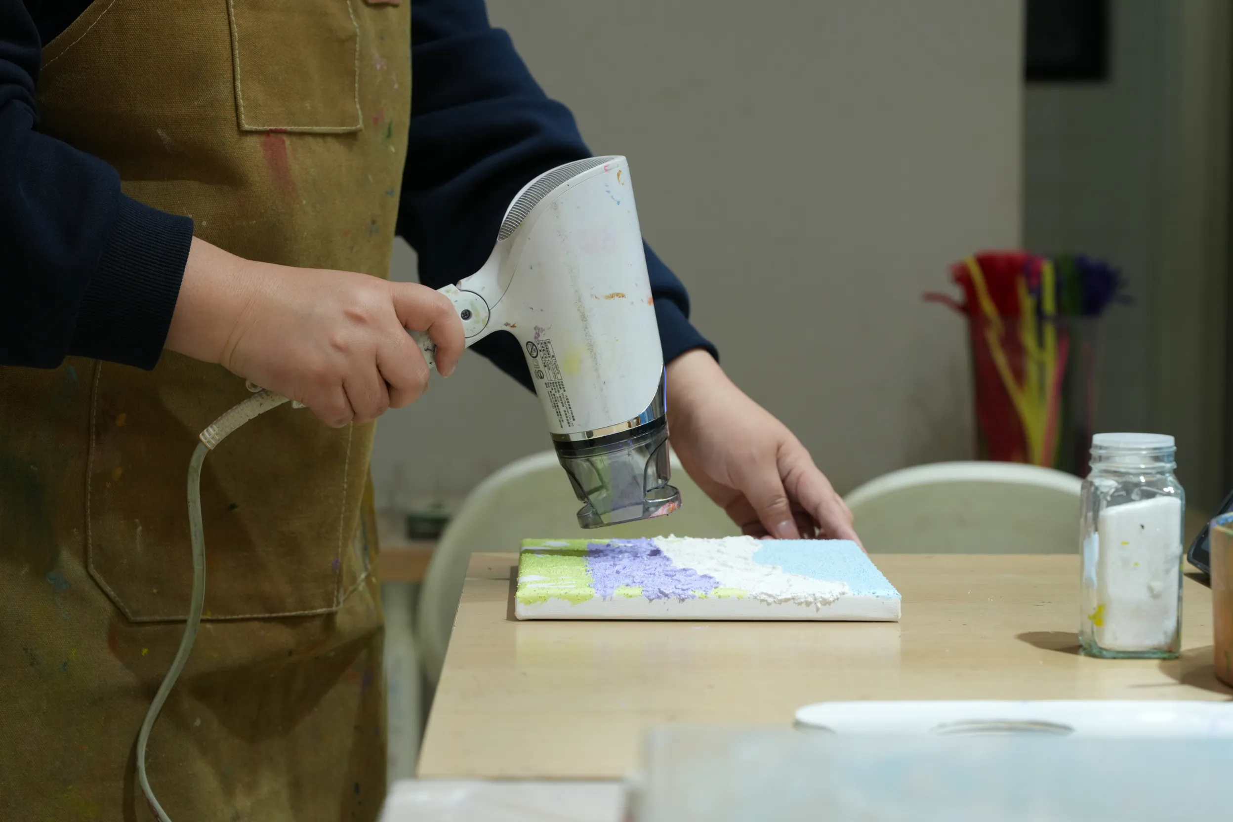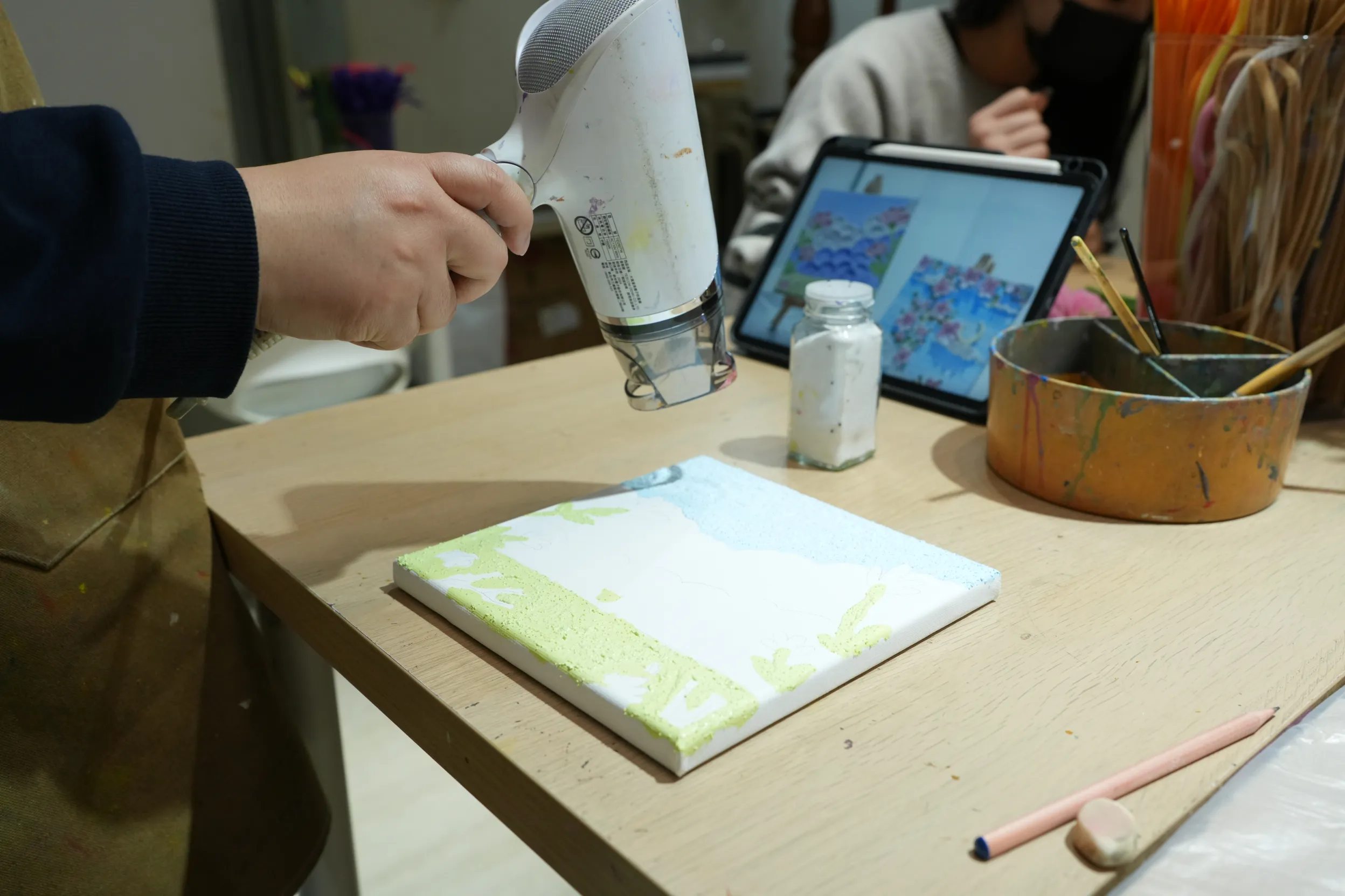 ▼畫完一個段落後,老師會先讓我用吹風機將顏料吹乾,每完成一層都需要先用熱風固定,才能順利進行下一層上色,保持畫面的清晰與層次感。