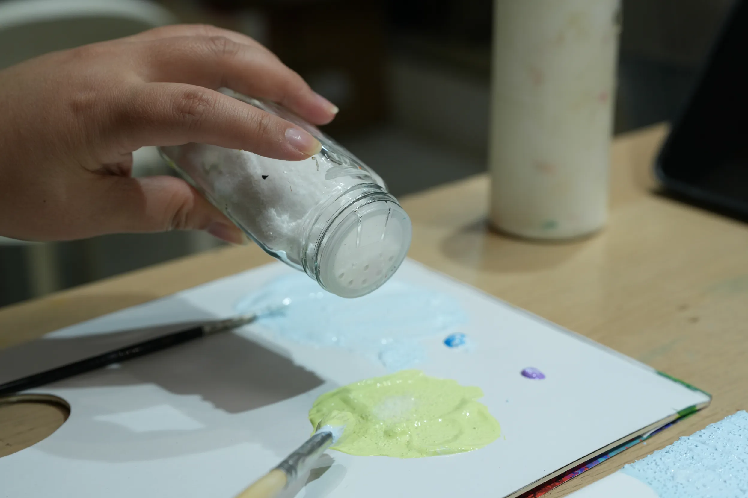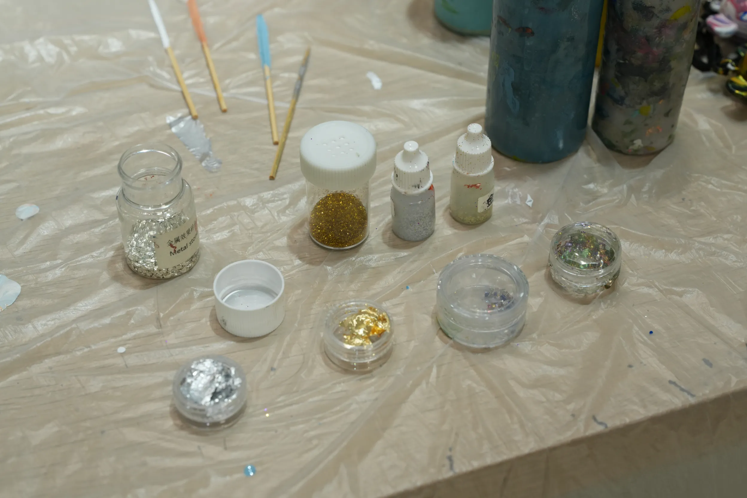 ▼老師建議可以加入一些亮粉來點綴畫作,現場提供了多種不同顏色和質感的亮粉可供選擇。