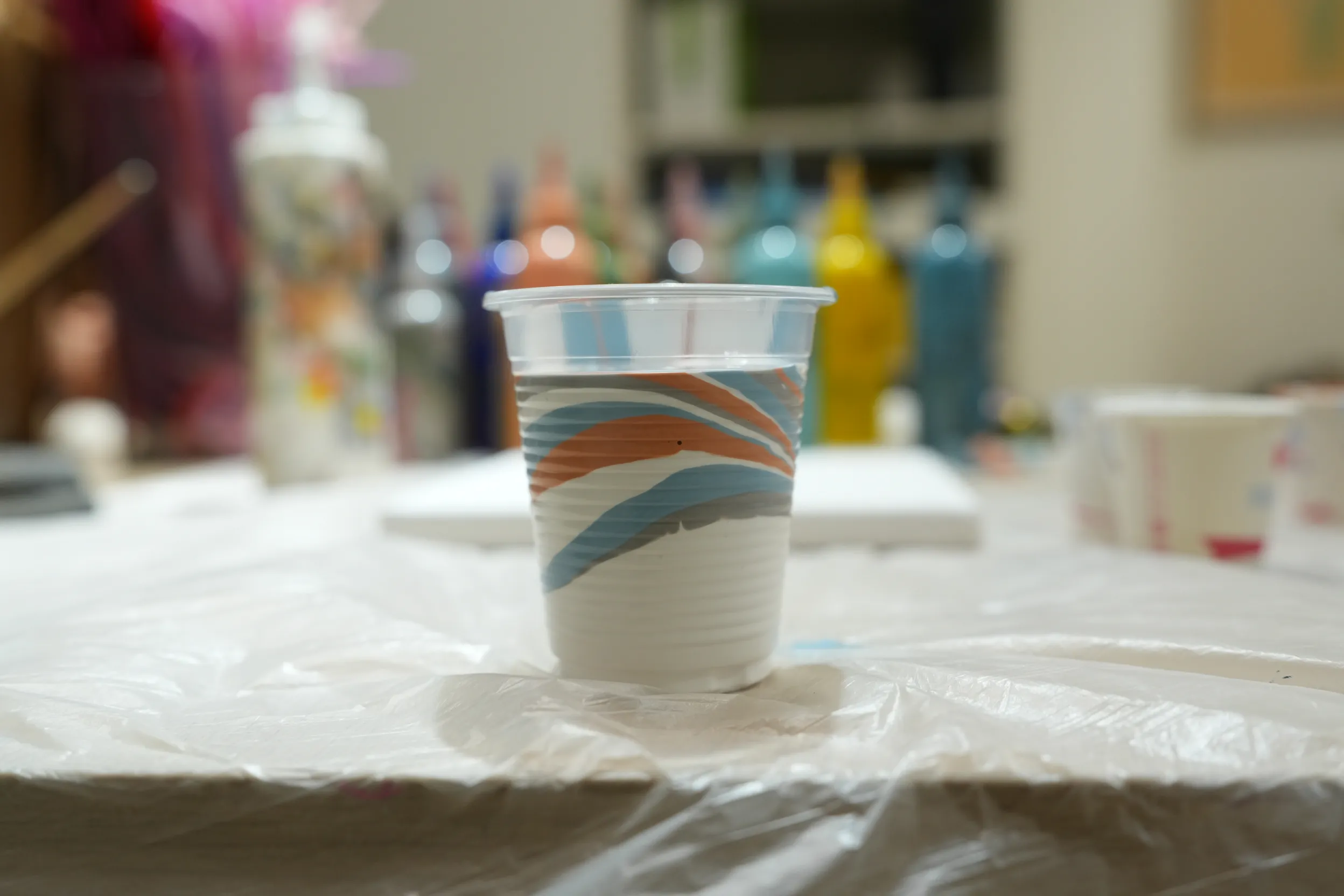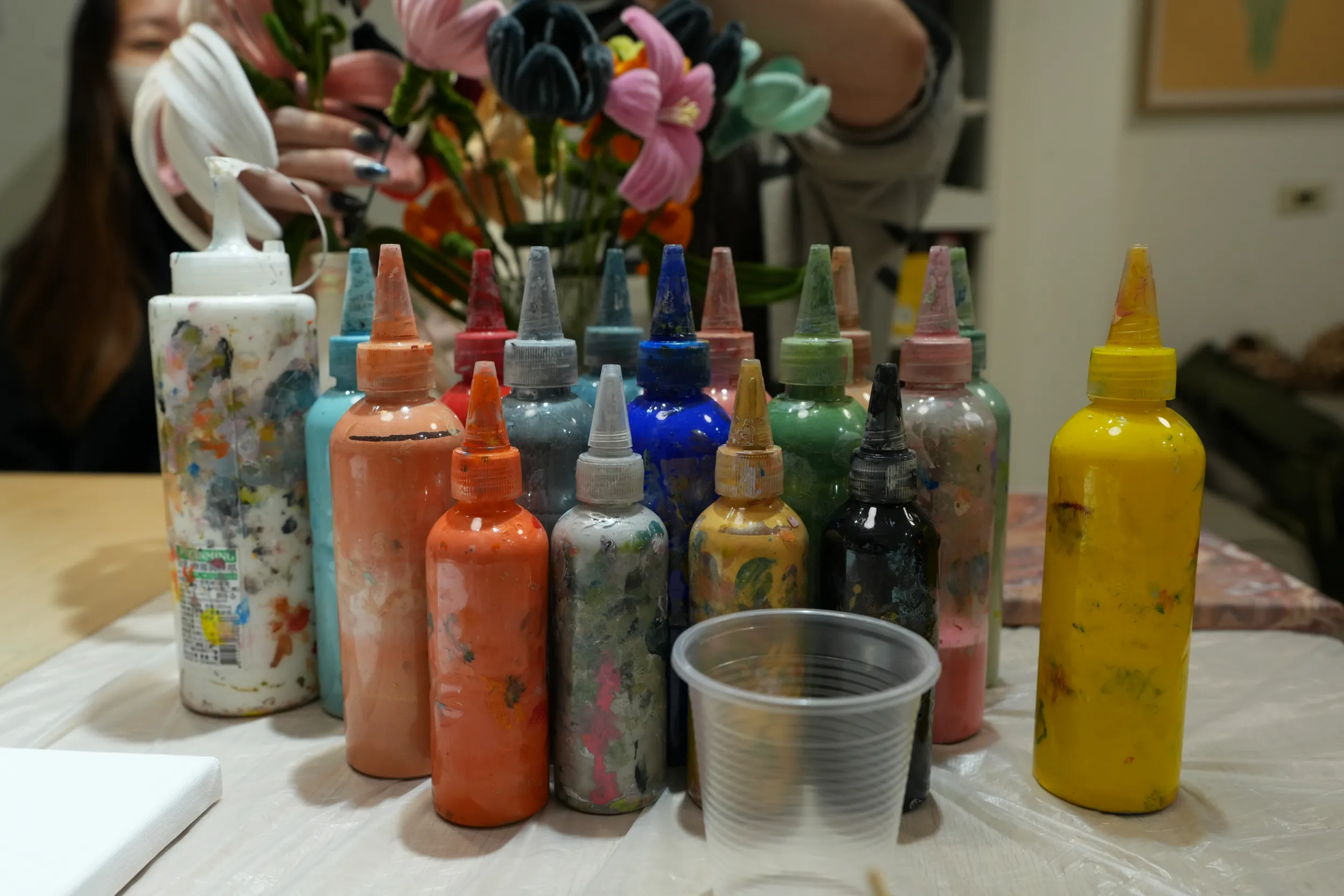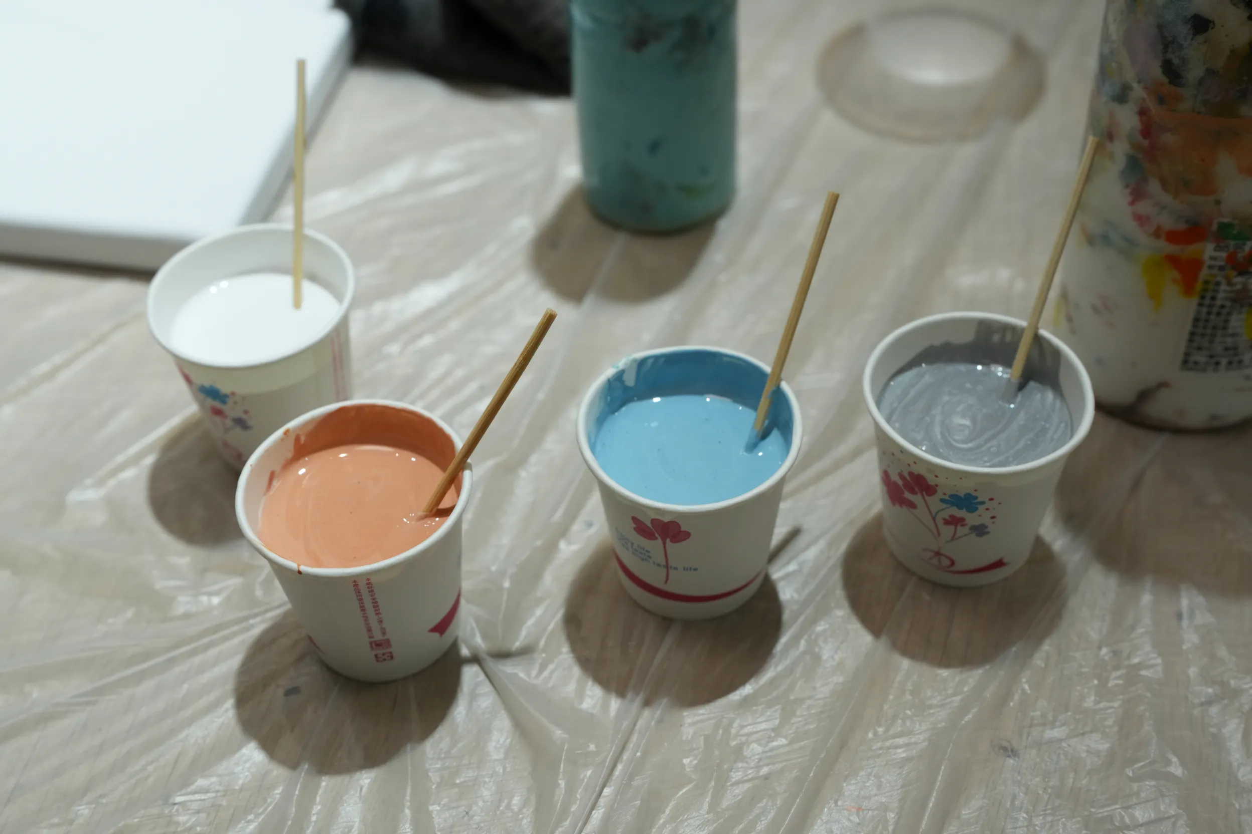 ▼桌上老師已先準備多種顏料,還有四個紙杯與攪拌棒,方便混合顏色並進行流體畫創作。