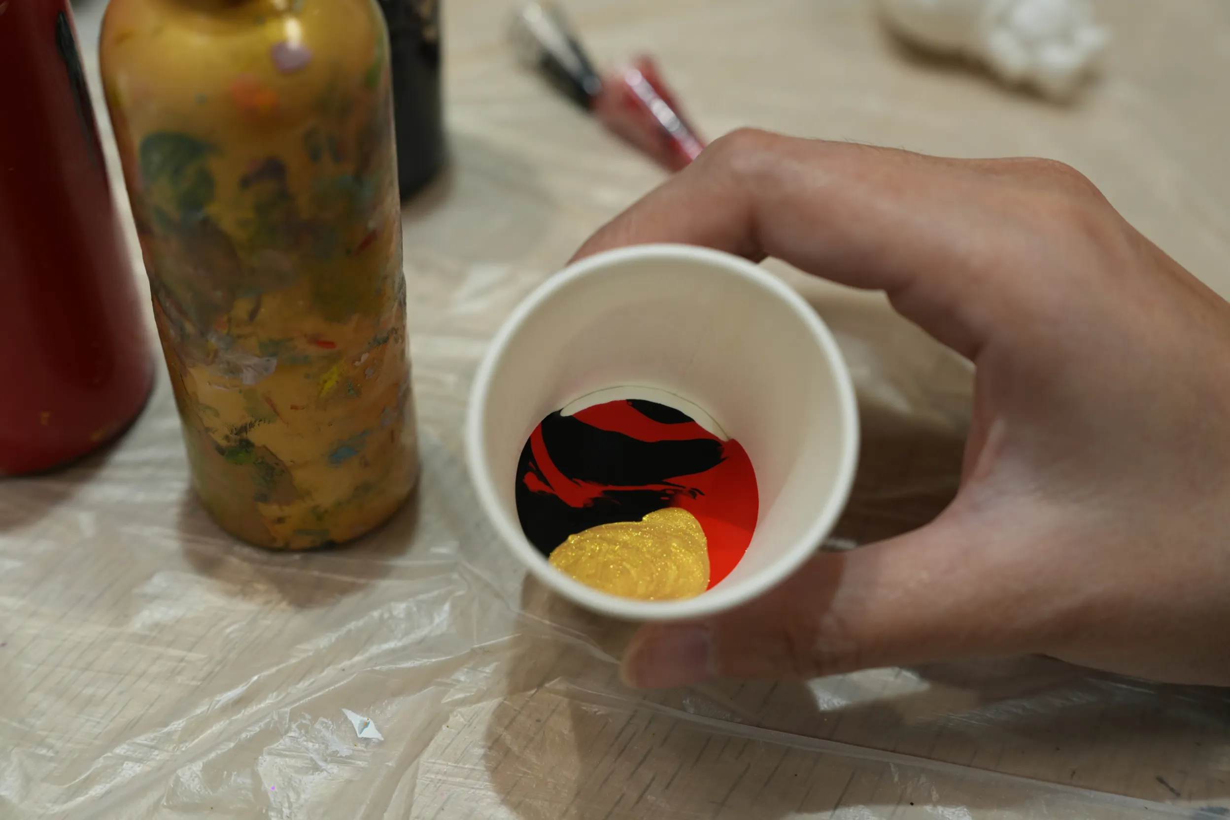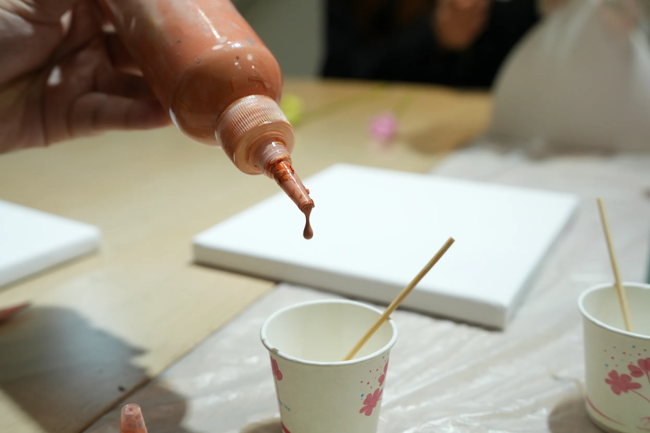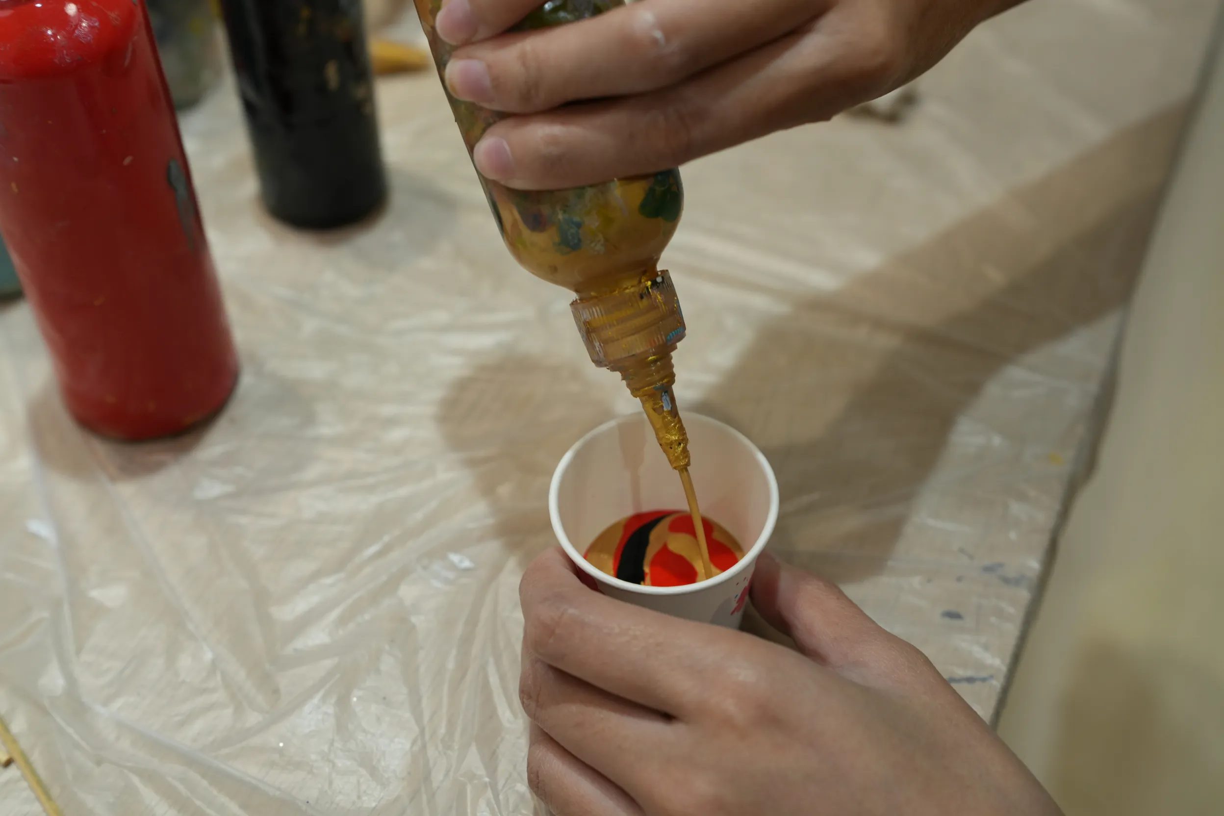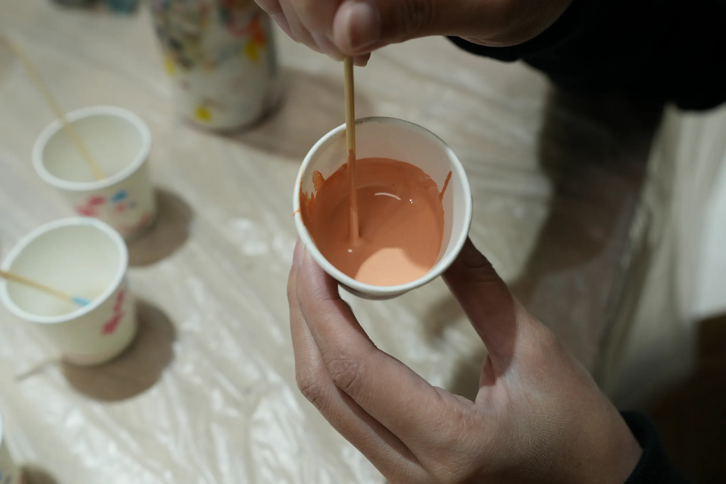 ▼老師說選好3種顏色後,直接將顏料擠到同一個紙杯內。